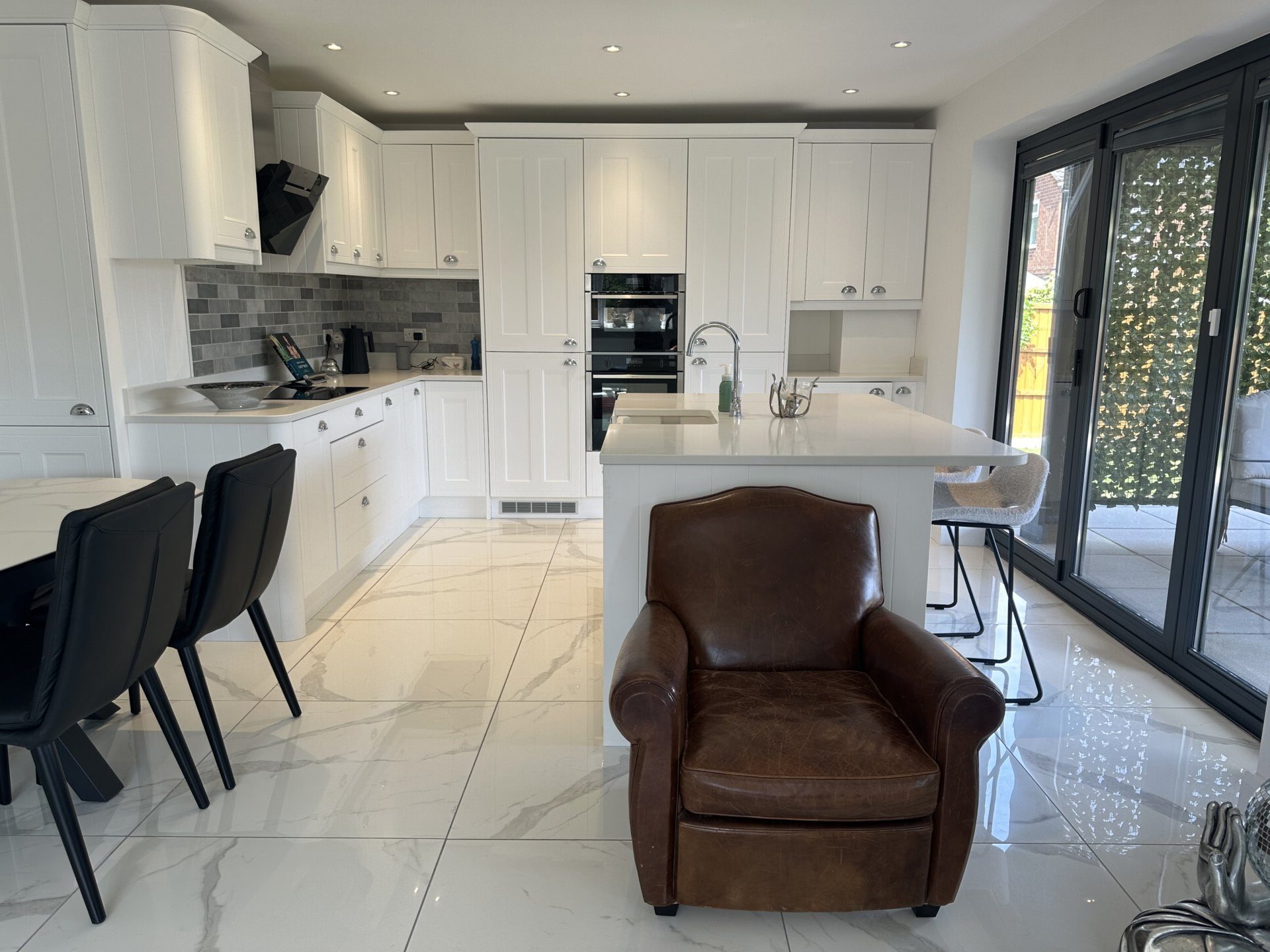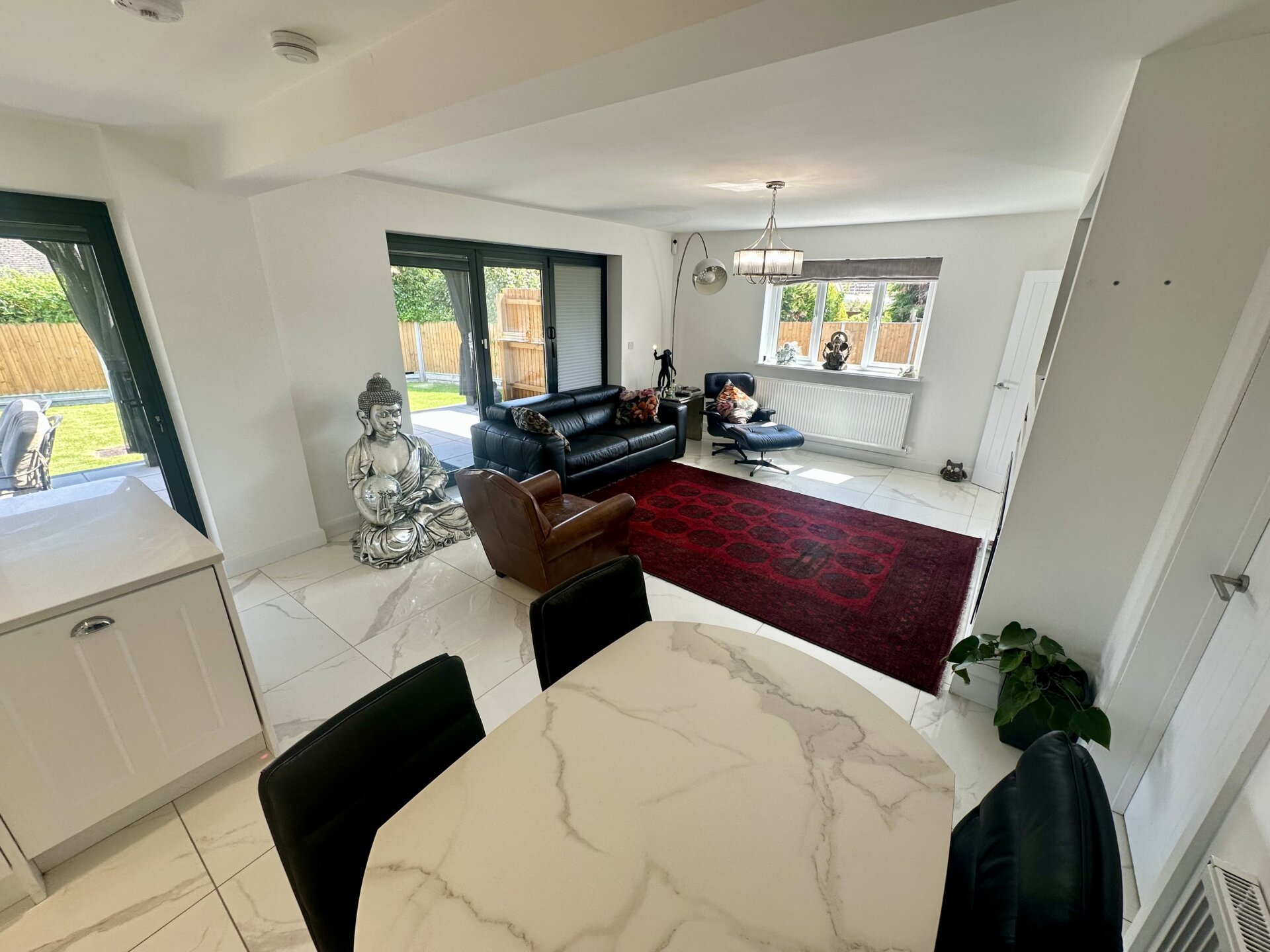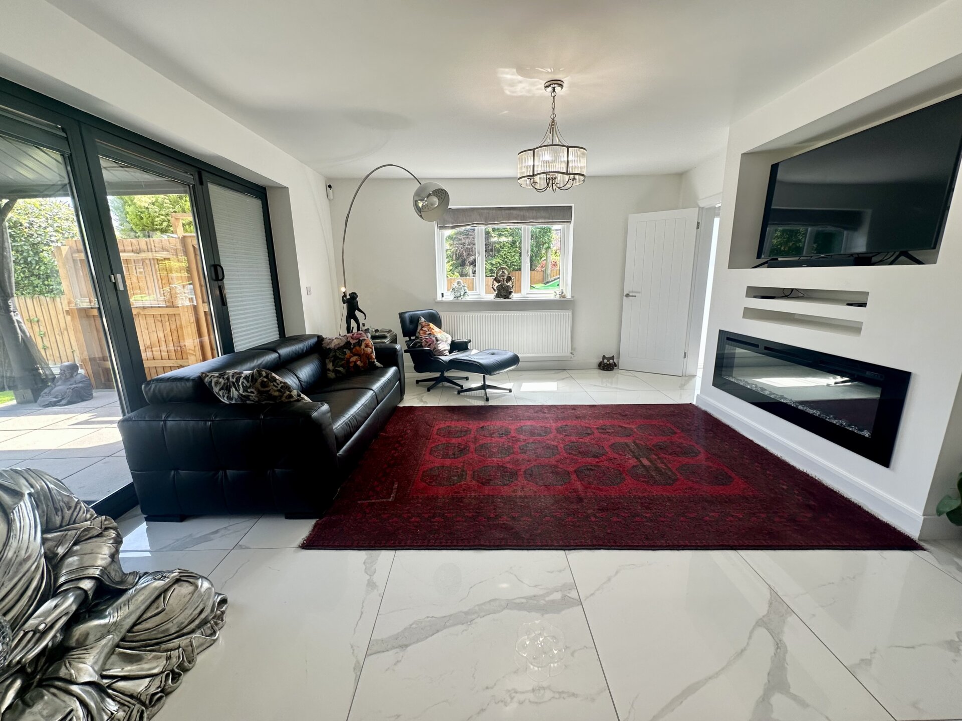 The heart of the home. This expansive, beautifully designed open-plan area has been finished to an ultra-modern specification. The kitchen features sleek white quartz worktops and a full suite of integrated appliances, including a fridge freezer, dishwasher, and washer/dryer. The living and dining areas are generously proportioned, making the space ideal for family life or entertaining. A built-in media wall with a stylish electric fire completes the room. Two large bifold doors open onto the garden, creating a seamless flow for indoor-outdoor gatherings.