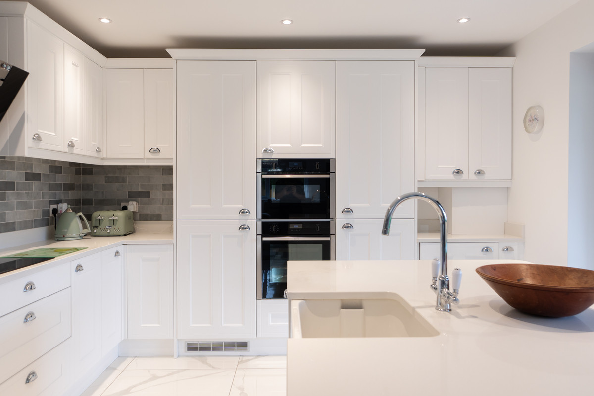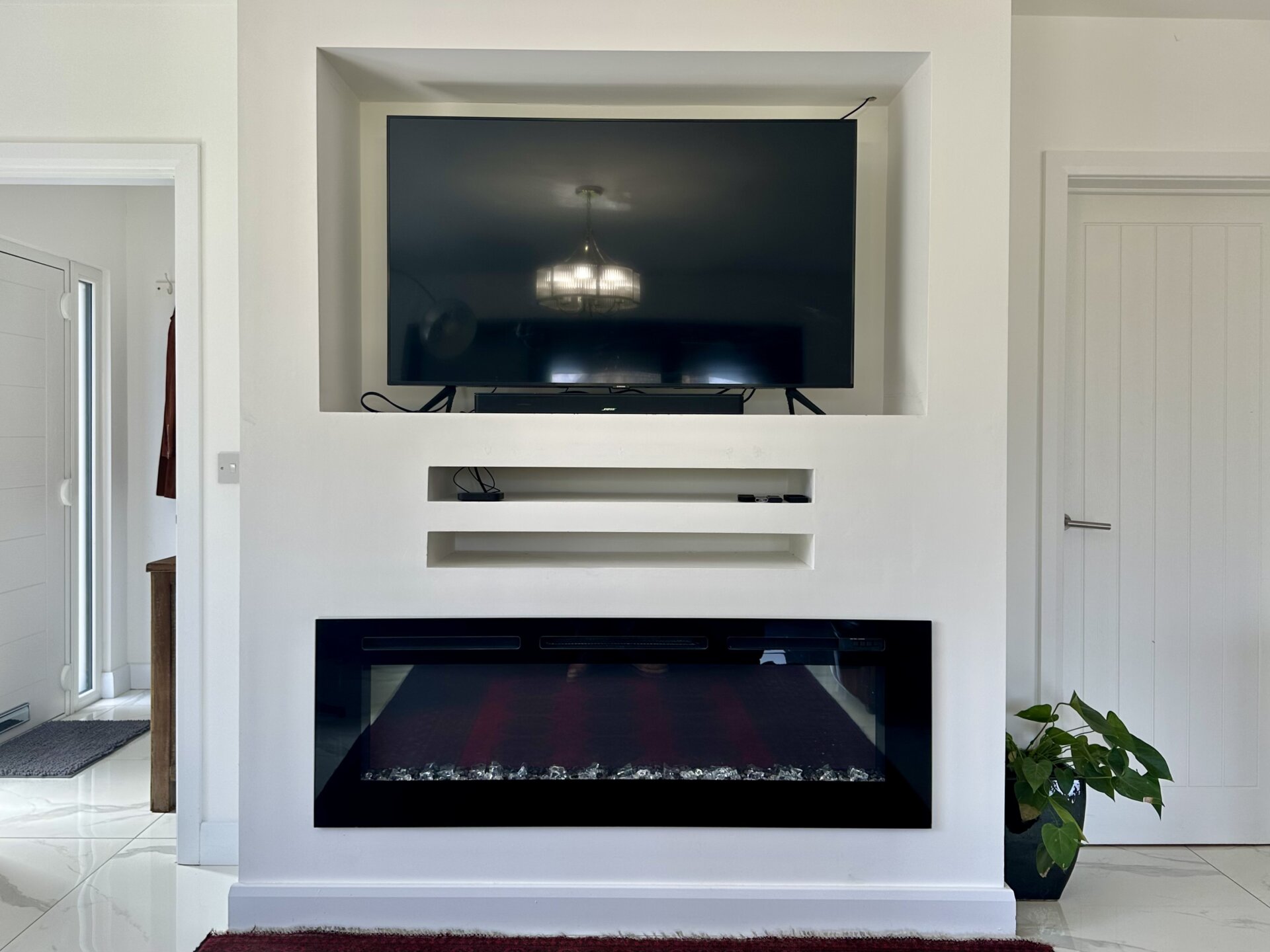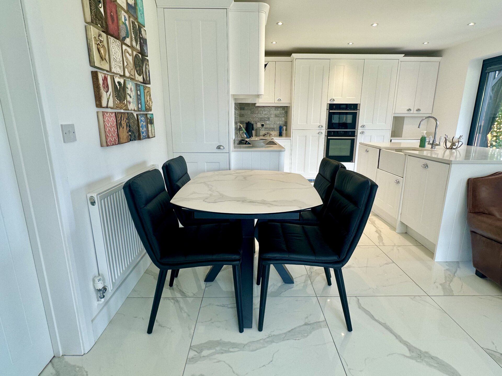 The heart of the home. This expansive, beautifully designed open-plan area has been finished to an ultra-modern specification. The kitchen features sleek white quartz worktops and a full suite of integrated appliances, including a fridge freezer, dishwasher, and washer/dryer. The living and dining areas are generously proportioned, making the space ideal for family life or entertaining. A built-in media wall with a stylish electric fire completes the room. Two large bifold doors open onto the garden, creating a seamless flow for indoor-outdoor gatherings.