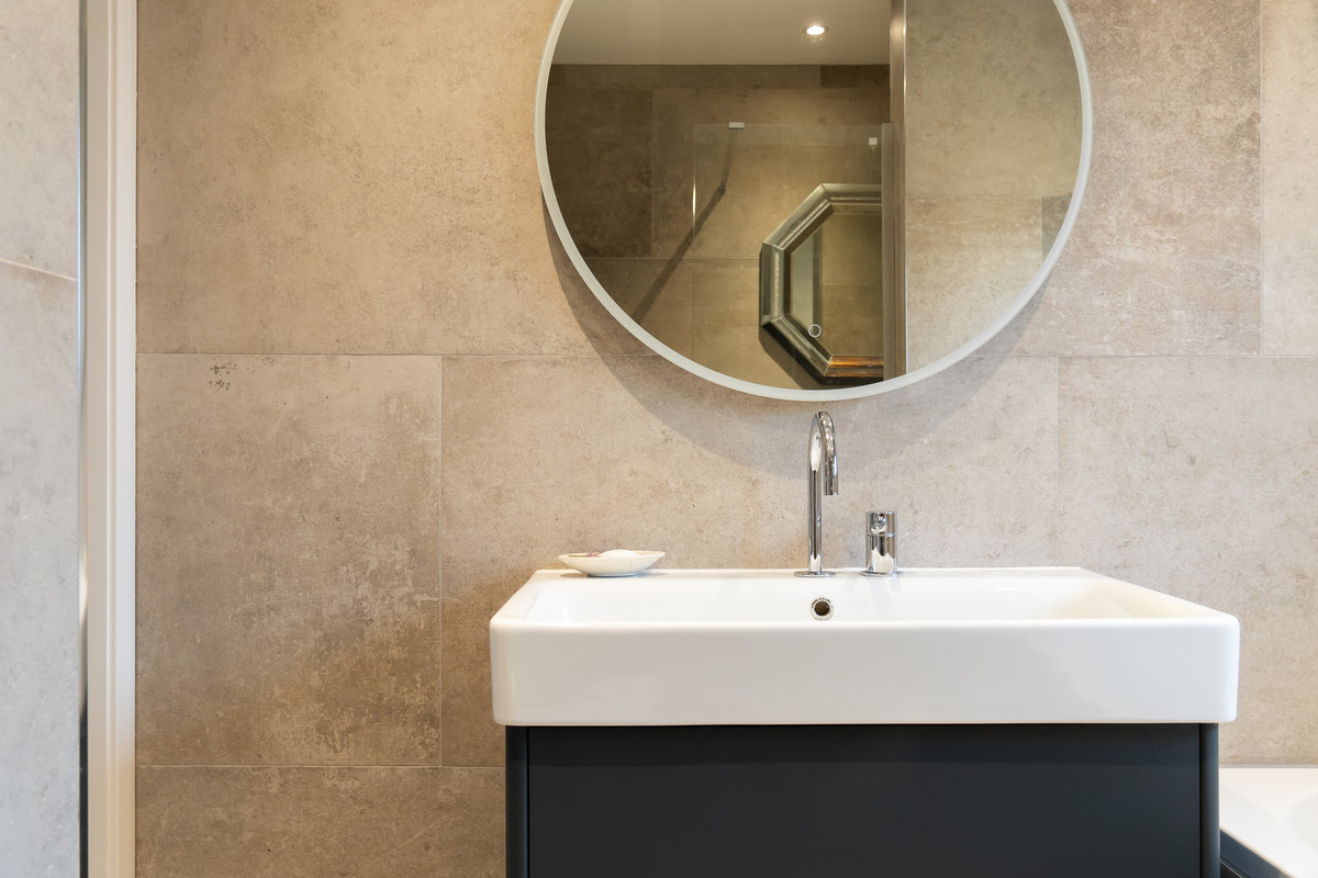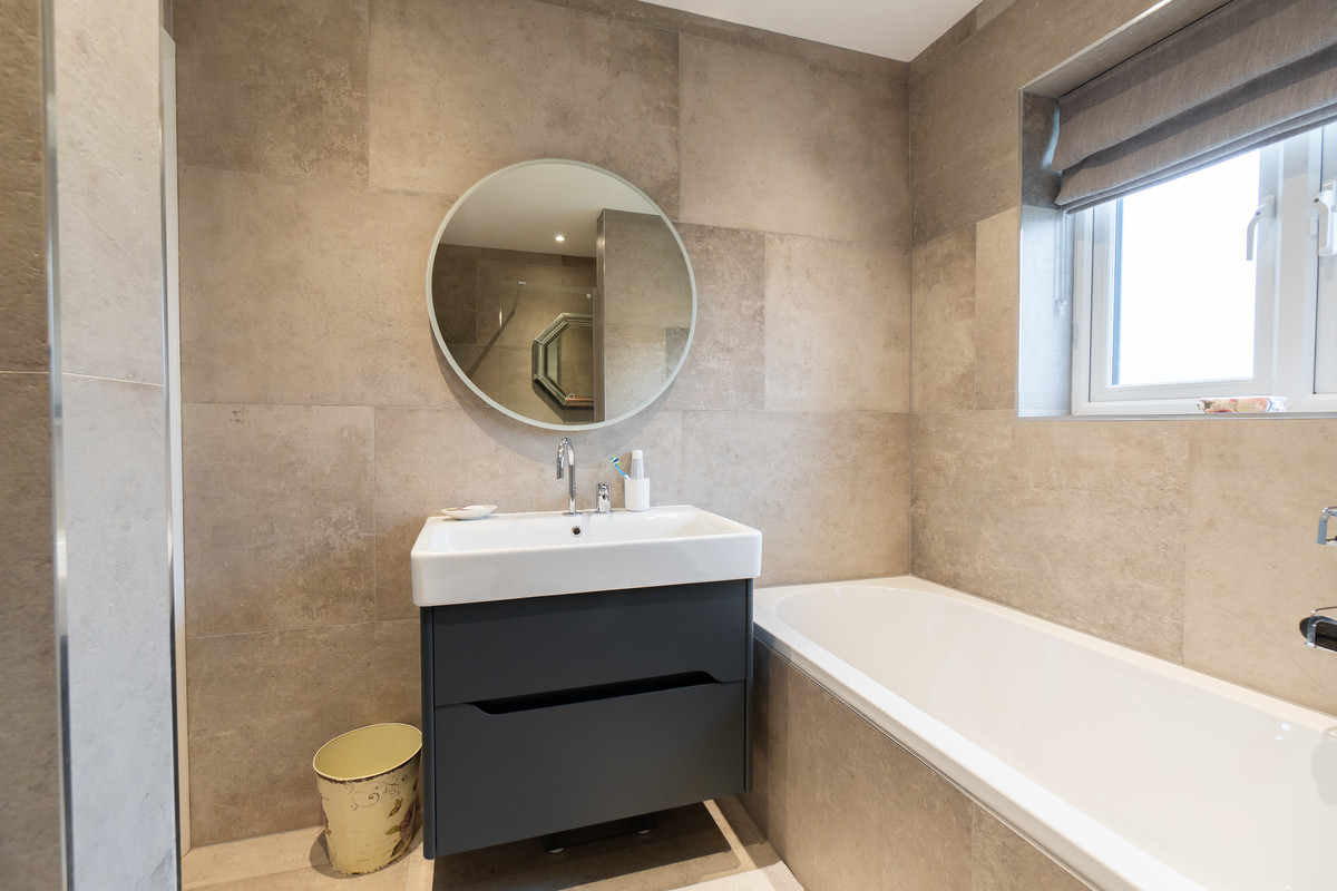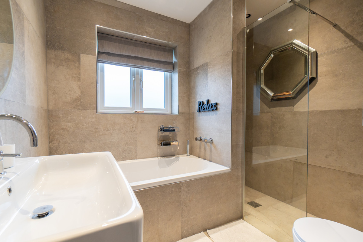 A luxurious, recently fitted four-piece suite offering a spa-like experience. Includes a large walk-in shower, bath with garden views, WC, and a vanity unit with integrated sink and storage.