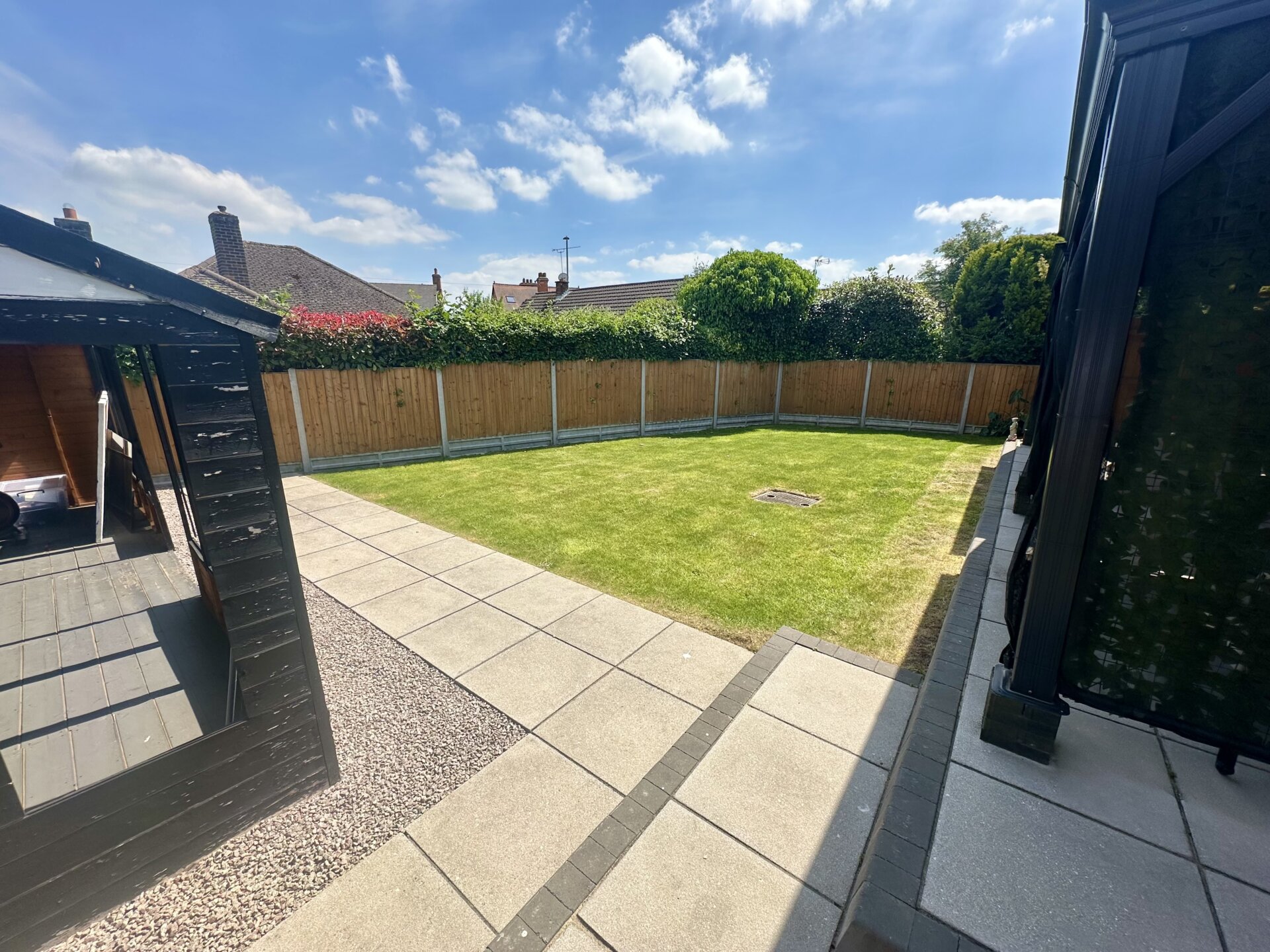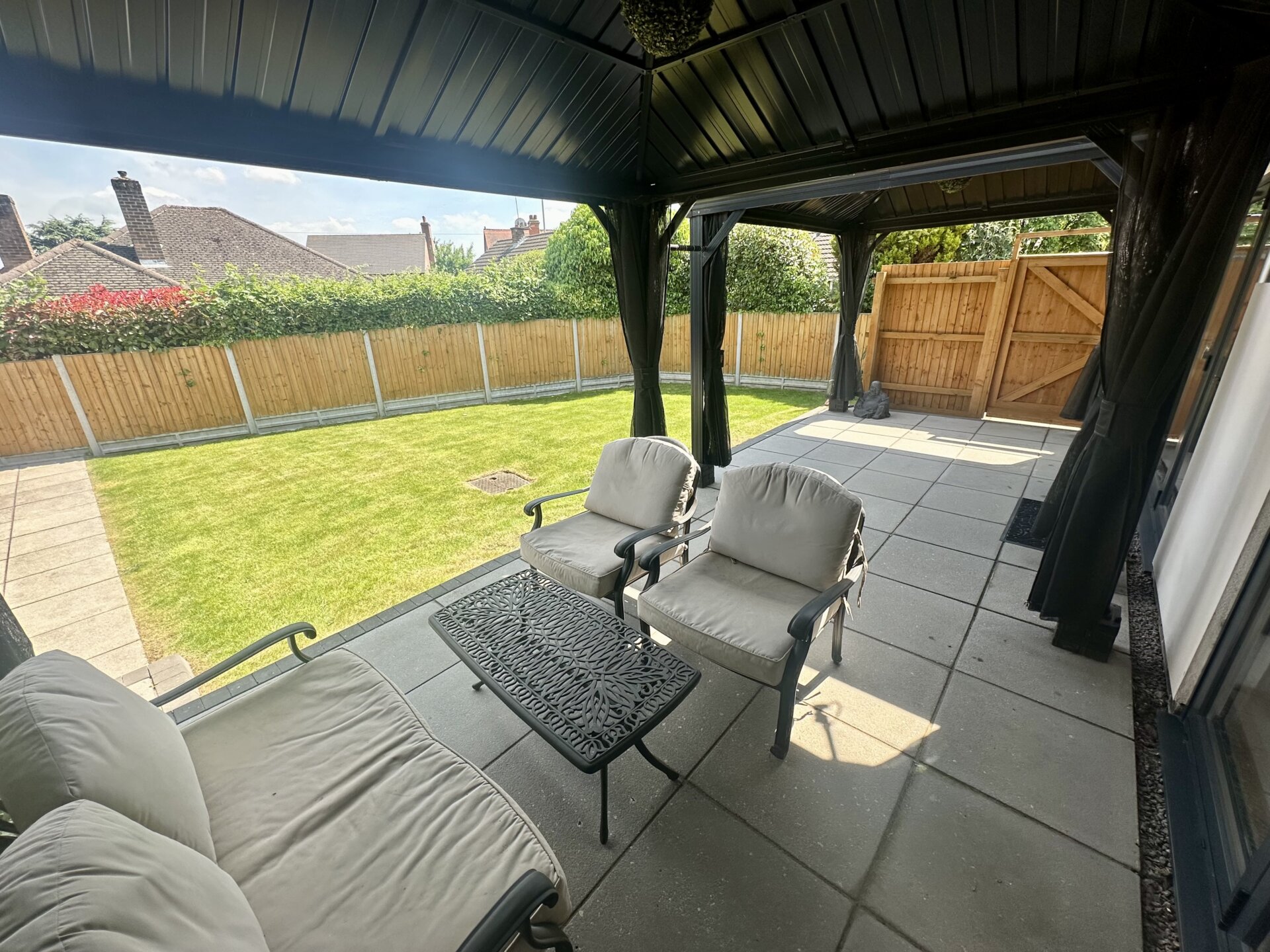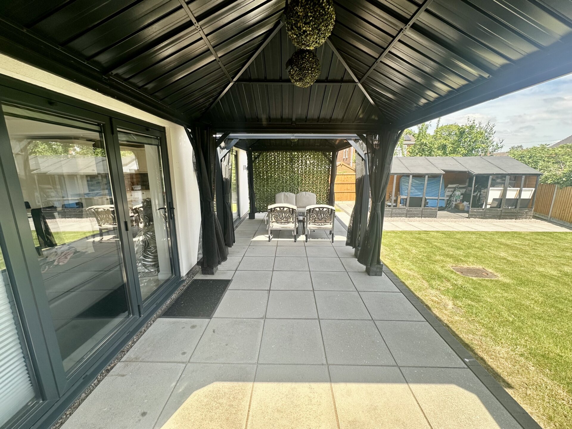 The landscaped wrap-around garden is designed with both relaxation and entertaining in mind. A spacious patio area with fitted covers is ideal for hosting, while the lawn is well maintained and framed by mature borders. The garden also includes a storage shed and an additional outbuilding for further flexibility.