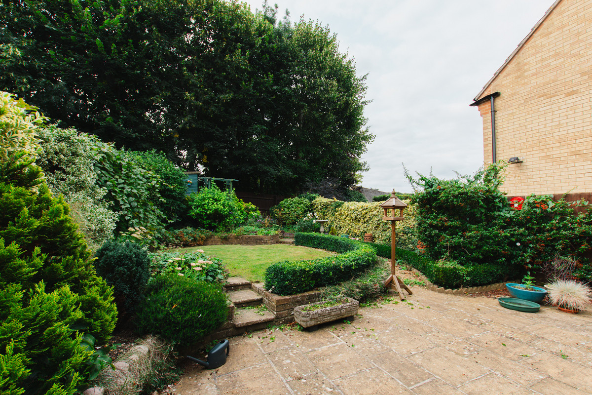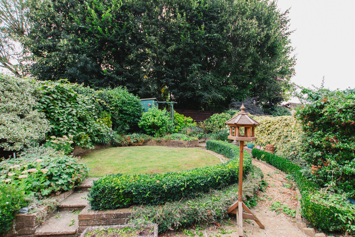 The garden, as seen in the photos is beautifully manicured with patio area, lawn space, and a vast range of pruned hedging and shrubs, with a fence and decked area at the foot of the garden.