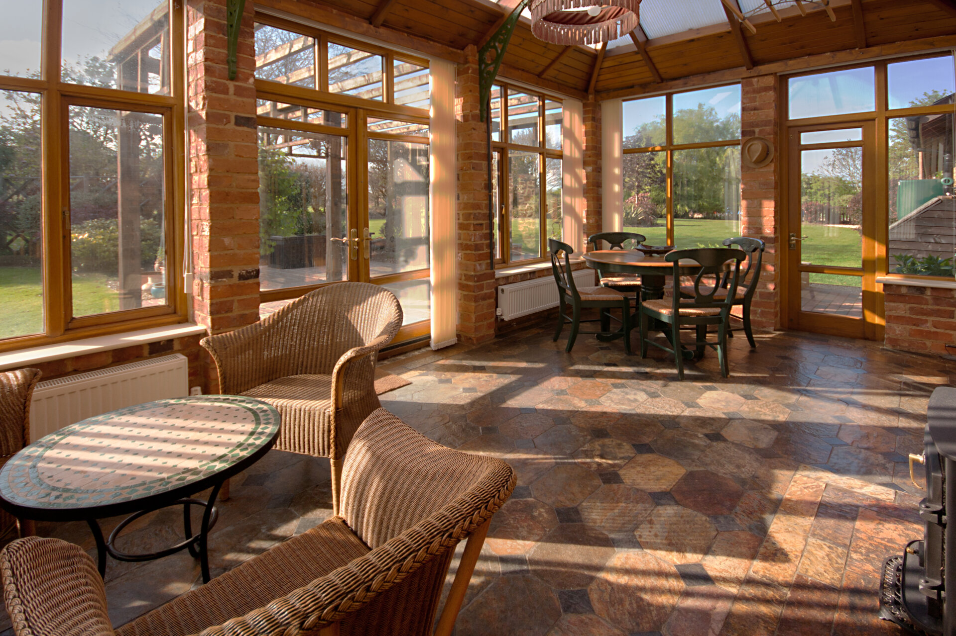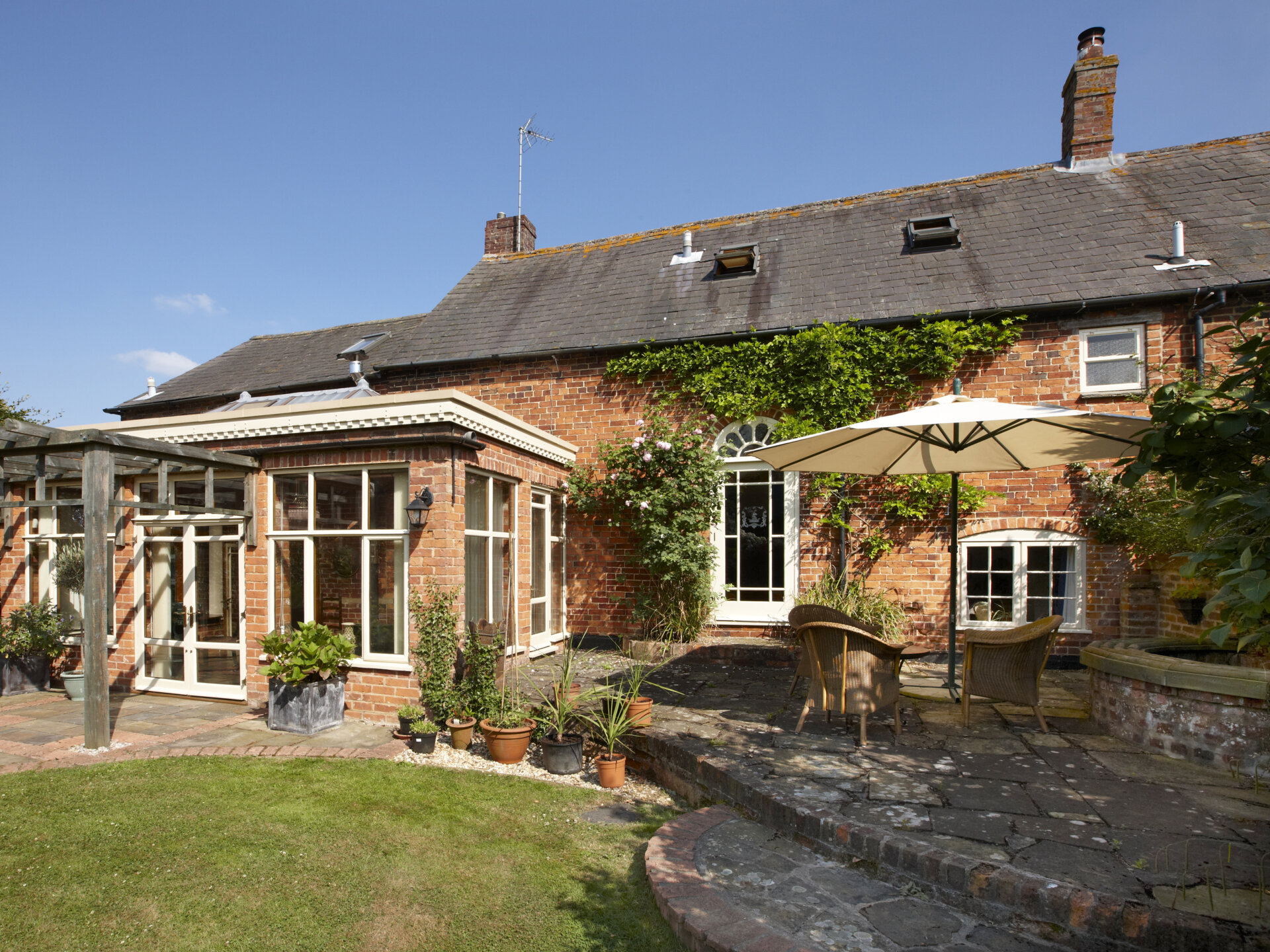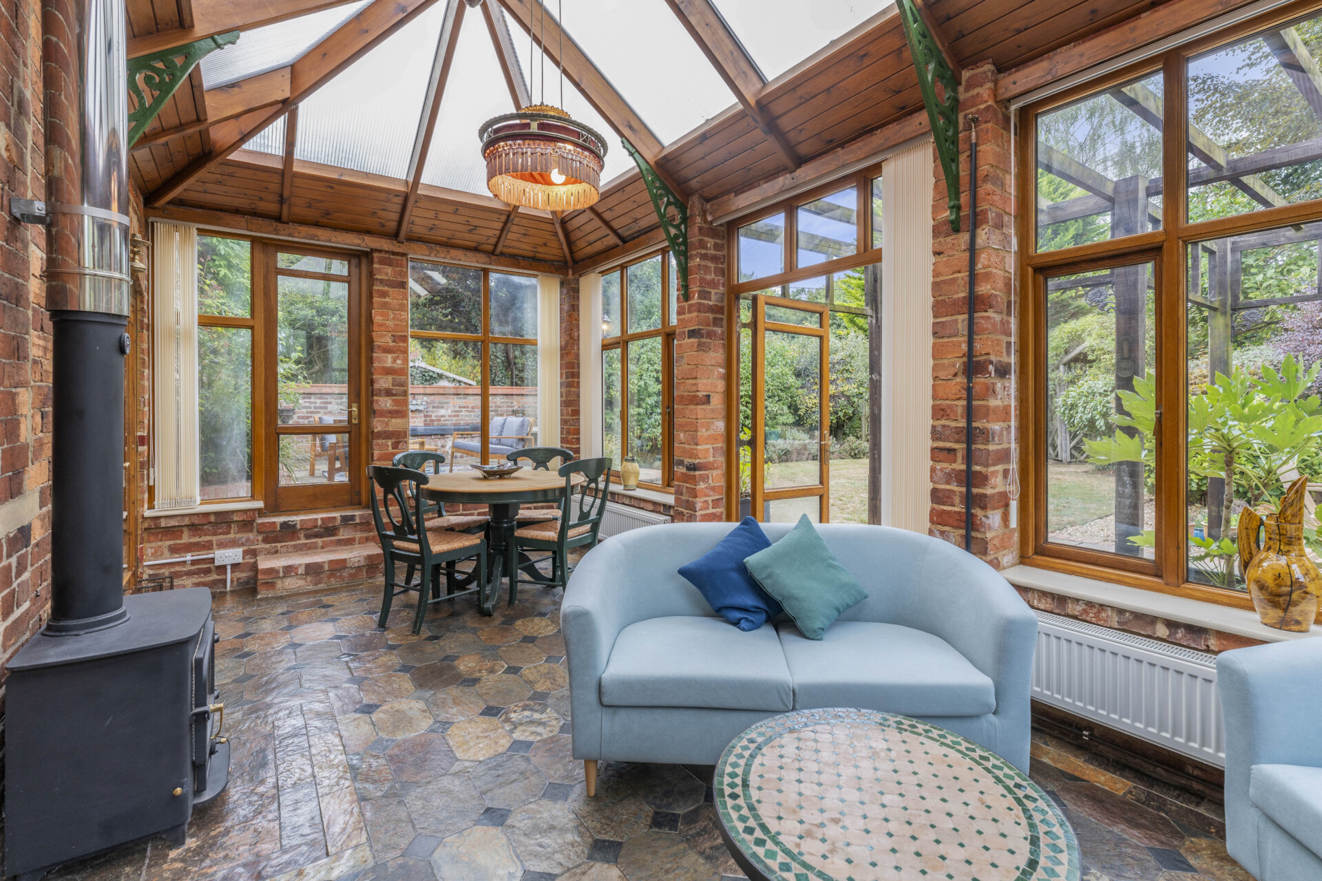 The farmhouse blends character and comfort seamlessly, retaining a wealth of period features while providing generous, flexible living space ideal for both family life and entertaining. The heart of the home is the welcoming kitchen/breakfast room, complemented by a striking timber-framed conservatory with vaulted ceiling and wood-burning stove, opening directly onto the gardens. Elegant reception rooms include a large dining room with charming period detailing and a spacious sitting room with feature fireplace and dual-aspect views.