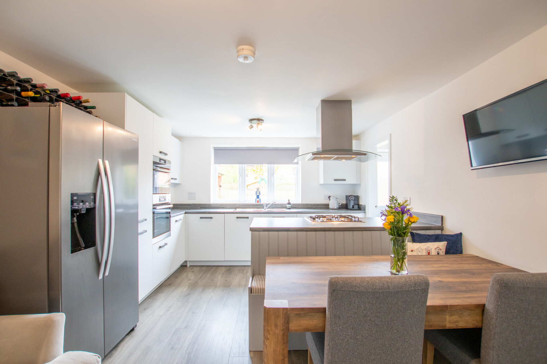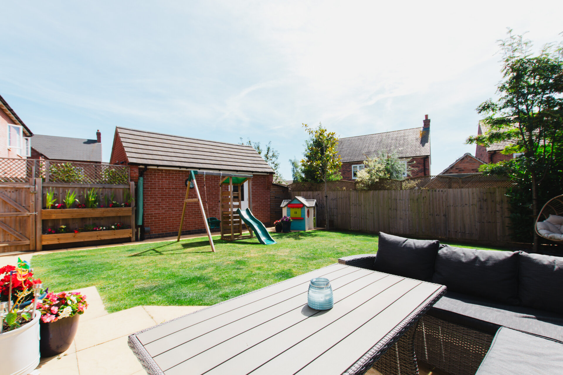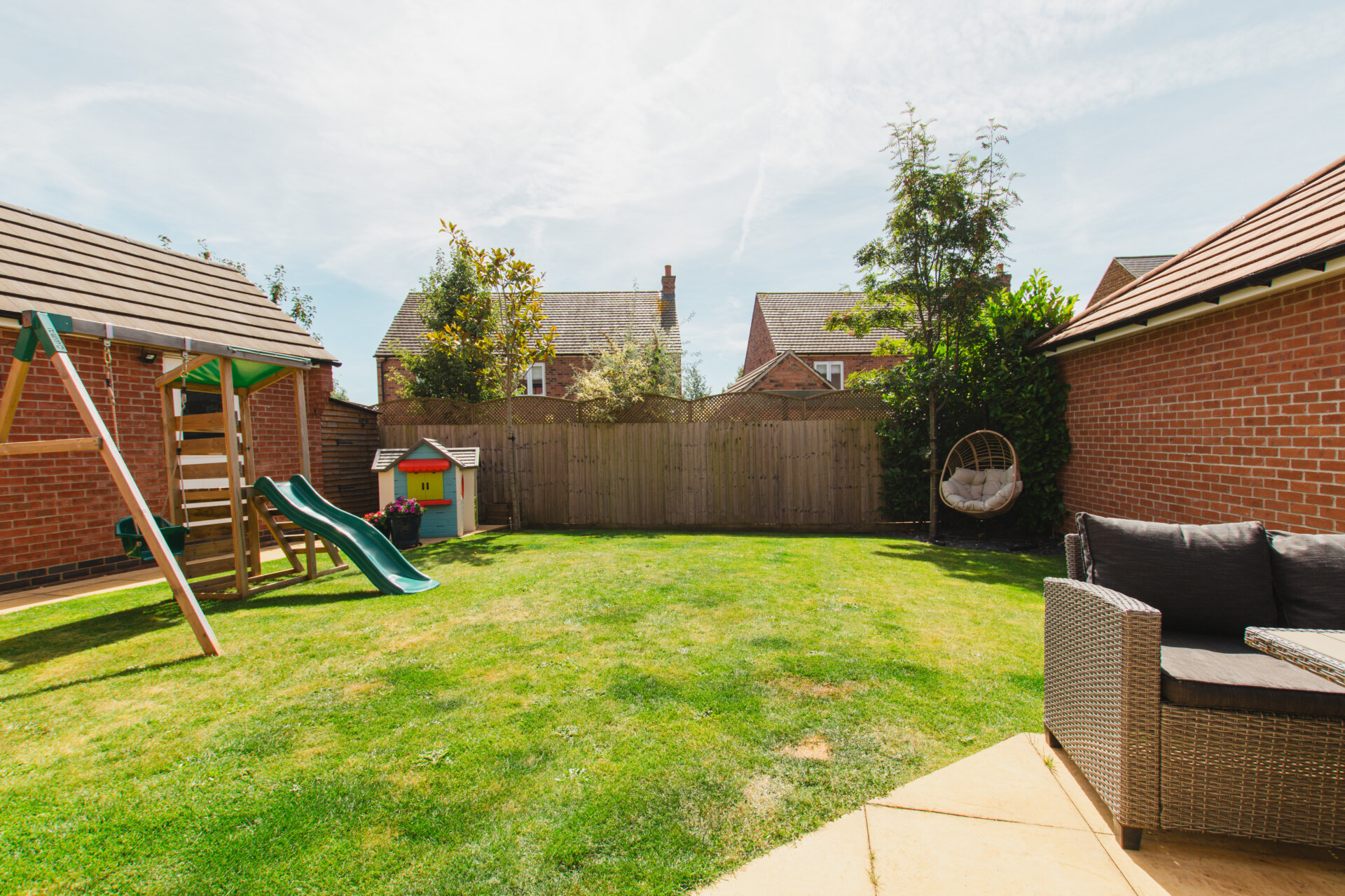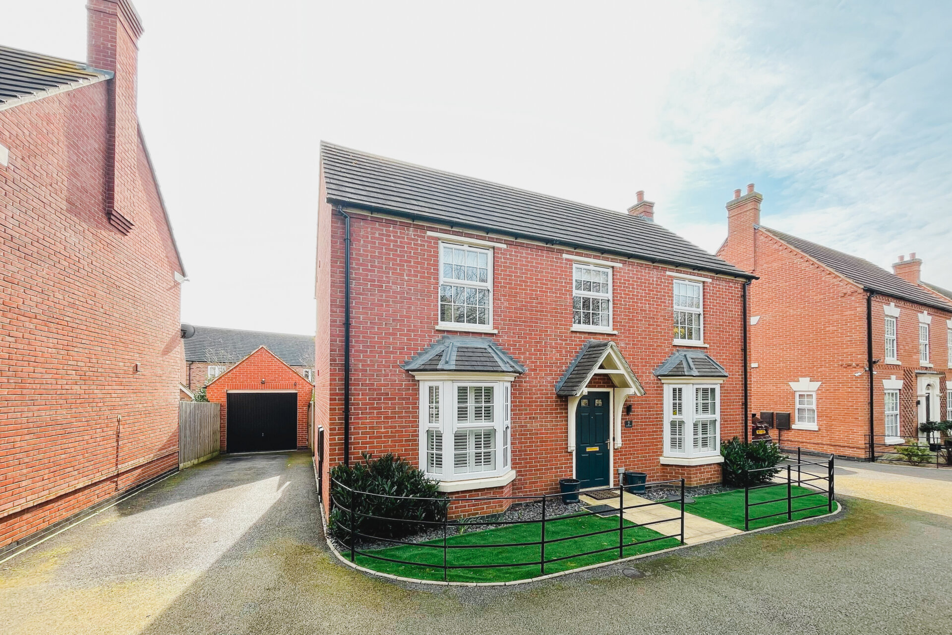 A beautifully styled, light & airy modern detached family home that is well proportioned throughout, and caters for modern family living superbly. The house has been kept in impeccable condition, and all viewers are sure to appreciate it’s move-in-ready condition. After inspecting the floorplan you’ll notice the extra reception room on the ground floor, and the very practical utility room, both huge selling features for buying a family home, and having a separate space for a potential playroom or second home office. Second, as you’ll see the rear of the garage has been converted to offer a study, and this conversion has been professionally done and is a really comfortable, year round usable space. The large open kitchen dining is perfect for entertaining, and main sitting room a generous size for all the family to relax. A lovely feature of this room are the double doors opening onto the South facing garden patio. All bedrooms are good sizes, with all four rooms having bespoke built-in storage. The views out of the windows of the front aspect are particularly nice, as you look onto an established row of trees, giving great privacy, but also changing with the seasons. The bathroom and ensuite are modern and stylish, with a neutral tile for the splashback areas. The garden is very family friendly, as seen in the photos having ample space for climbing frames, playing areas, gardening areas, and patio entertaining areas, there is a side gate to the driveway, and a side door into the garage office, which also has a ‘secret’ door into the front of the garage. There is a two vehicle driveway in front of the garage, adjacent to the house.