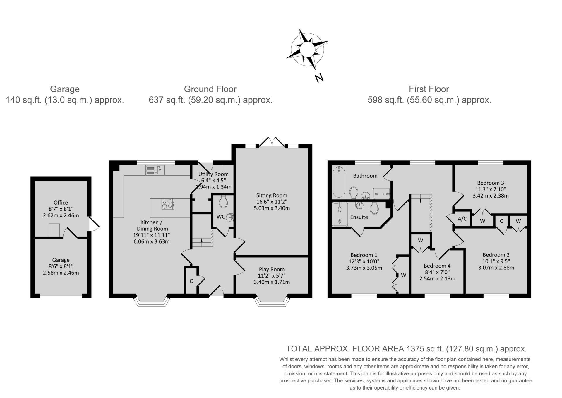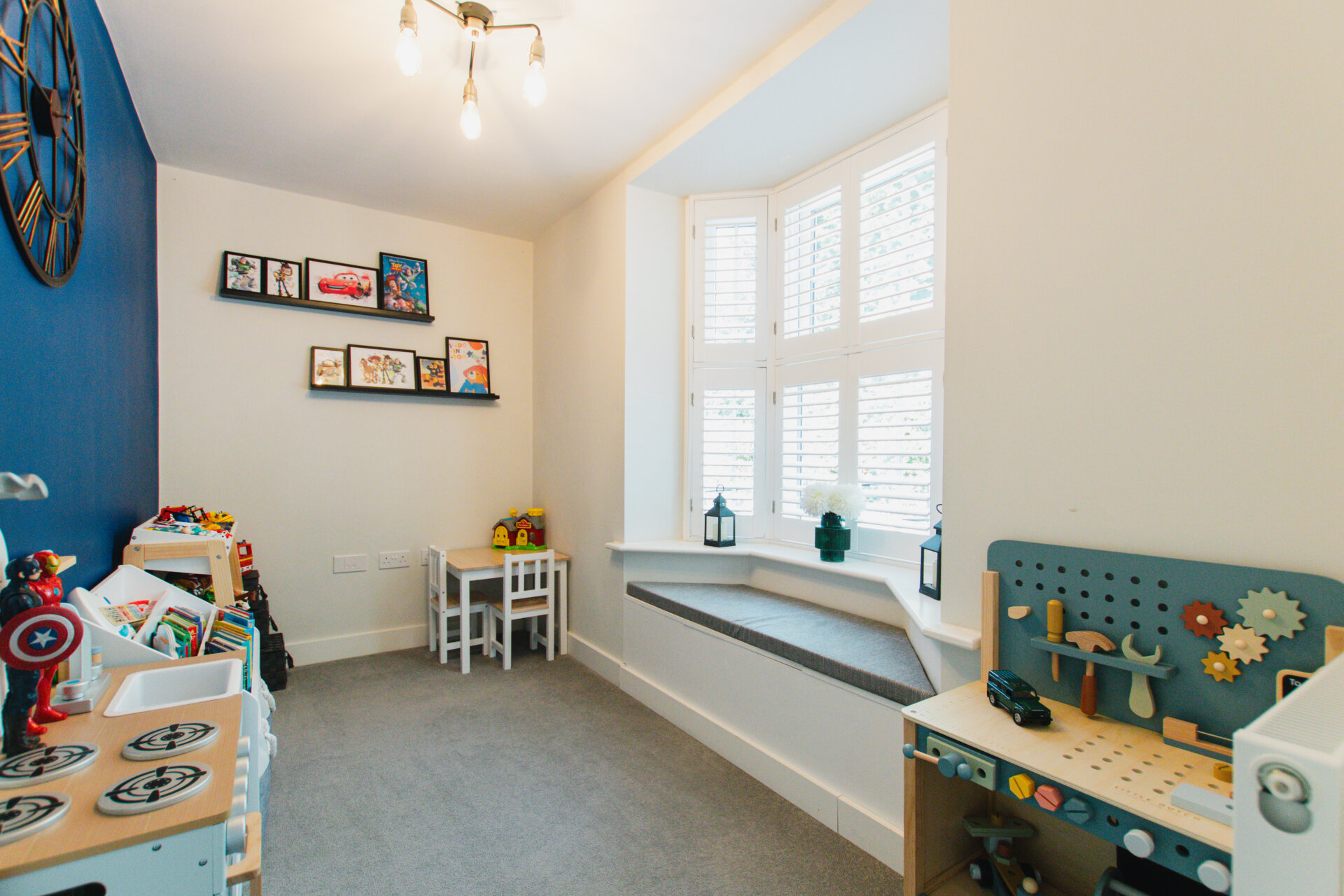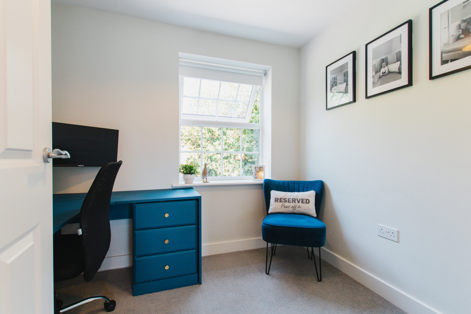 A beautifully styled, light & airy modern detached family home that is well proportioned throughout, and caters for modern family living superbly. The house has been kept in impeccable condition, and all viewers are sure to appreciate it’s move-in-ready condition. After inspecting the floorplan you’ll notice the extra reception room on the ground floor, and the very practical utility room, both huge selling features for buying a family home, and having a separate space for a potential playroom or second home office. Second, as you’ll see the rear of the garage has been converted to offer a study, and this conversion has been professionally done and is a really comfortable, year round usable space. The large open kitchen dining is perfect for entertaining, and main sitting room a generous size for all the family to relax. A lovely feature of this room are the double doors opening onto the South facing garden patio. All bedrooms are good sizes, with all four rooms having bespoke built-in storage. The views out of the windows of the front aspect are particularly nice, as you look onto an established row of trees, giving great privacy, but also changing with the seasons. The bathroom and ensuite are modern and stylish, with a neutral tile for the splashback areas. The garden is very family friendly, as seen in the photos having ample space for climbing frames, playing areas, gardening areas, and patio entertaining areas, there is a side gate to the driveway, and a side door into the garage office, which also has a ‘secret’ door into the front of the garage. There is a two vehicle driveway in front of the garage, adjacent to the house.