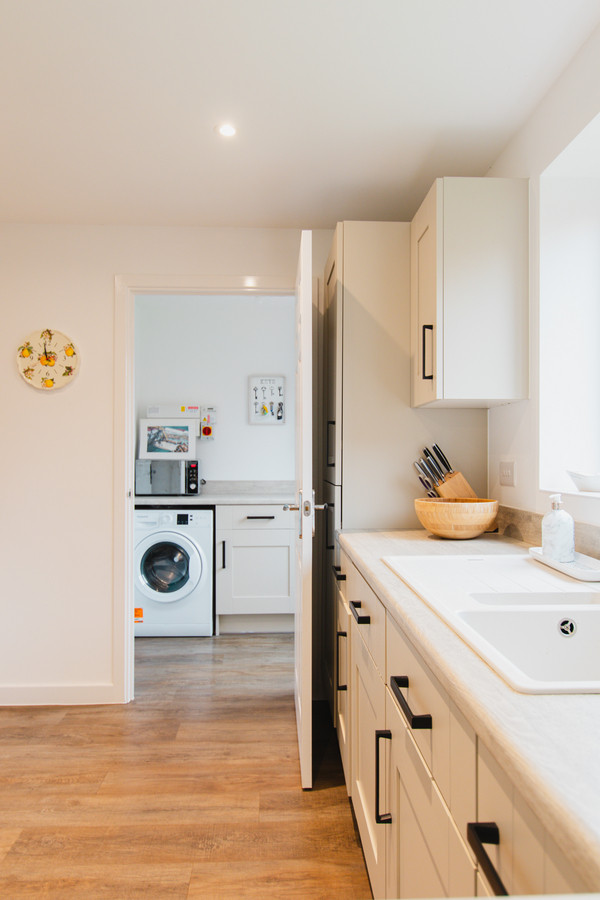The main area of the house is the impressive and tastefully designed open plan kitchen dining room spanning across the rear of the house, that opens onto the large south facing rear garden. This room is very light & airy, and has ample space for cooking, but also entertaining guests. There is a utility room having space for two white goods, freeing up more kitchen storage space under worktop. Within the kitchen is an integrated dishwasher, four ring gas hob with extractor over, fridge freezer, and sink unit with tap over.
