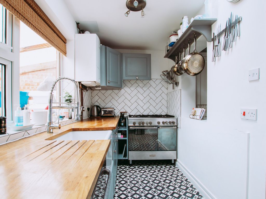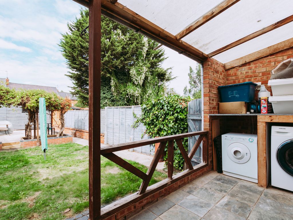 The kitchen sits at the rear of the property, is a modern suite with attractive herringbone design tile splashbacks. There is a Belfast style sink with window overlooking the garden. Immediately off the kitchen, outside, is a covered area, ideal for a lounge area, or it's current use as a covered utility area.