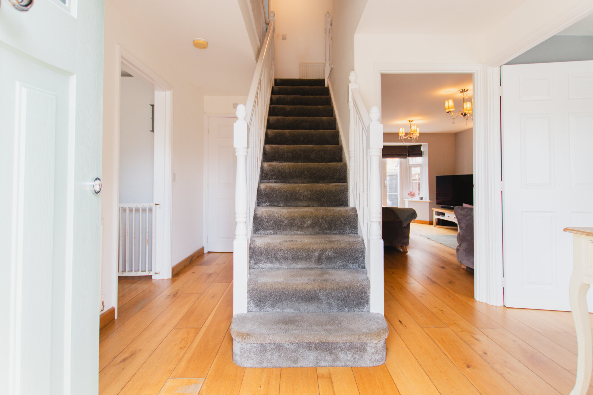 The ground floor is finished with hardwood flooring, while the upstairs benefits from soft carpeting. Double glazing and gas central heating ensure year-round comfort.