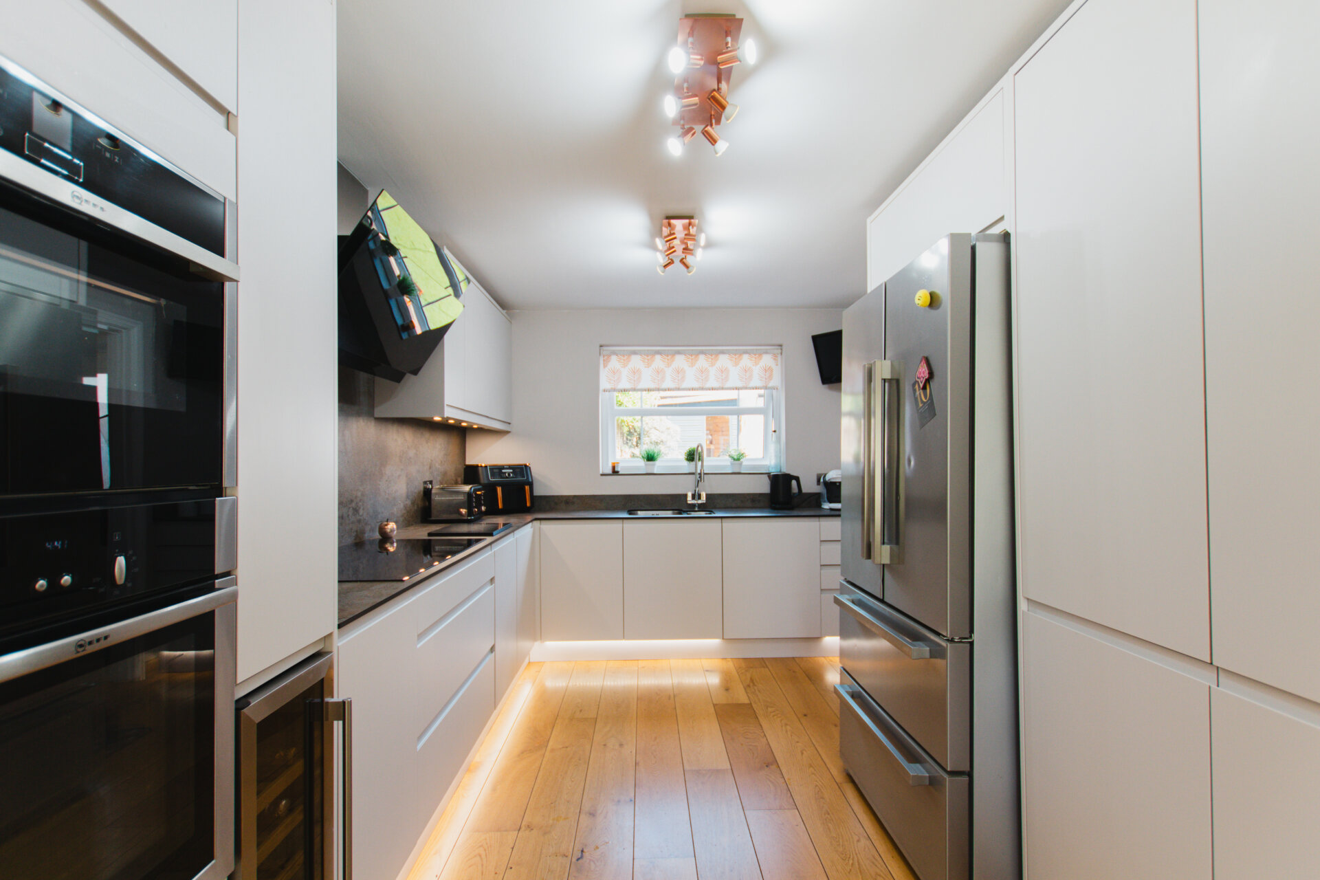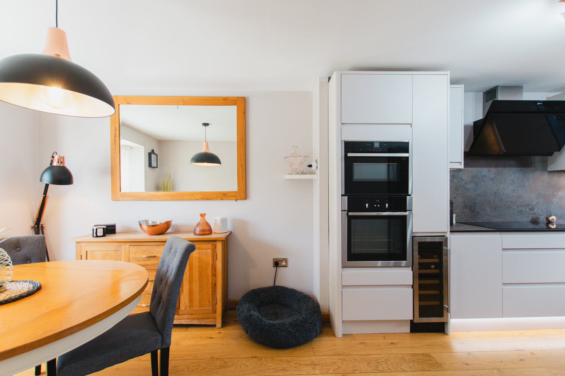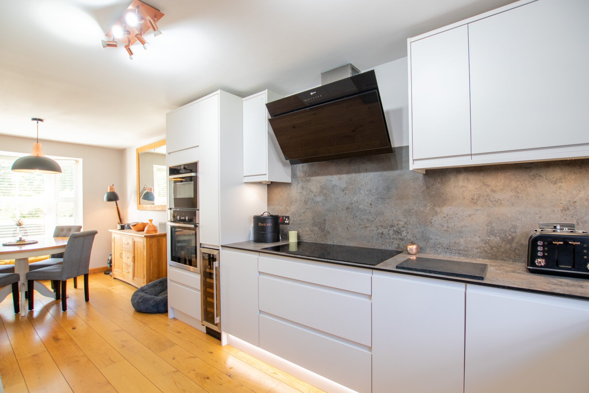 To the left of the hallway is a spacious open-plan kitchen and dining area, perfect for everyday family meals and entertaining. The kitchen is equipped with an integrated Neff oven, microwave, induction hob with extractor, wine cooler, dishwasher, and space for an American-style fridge/freezer. Adjoining the kitchen is a practical utility room, fitted with a sink, housing the boiler, and offering space for both washing machine and tumble dryer. A door leads directly from the utility room into the garden.
