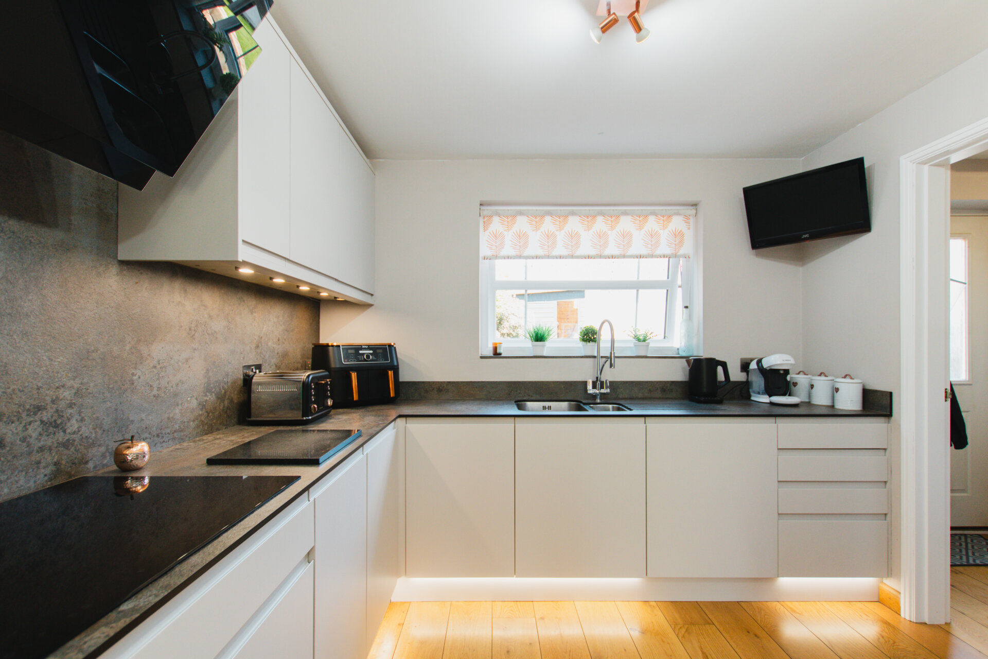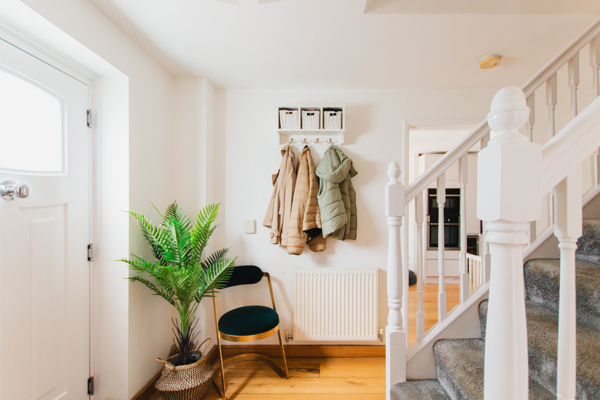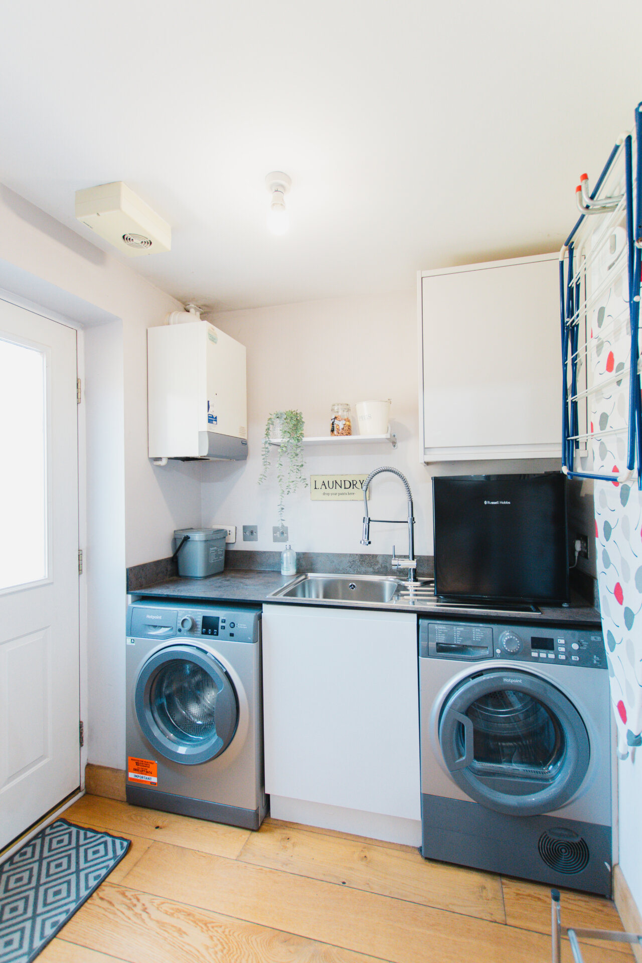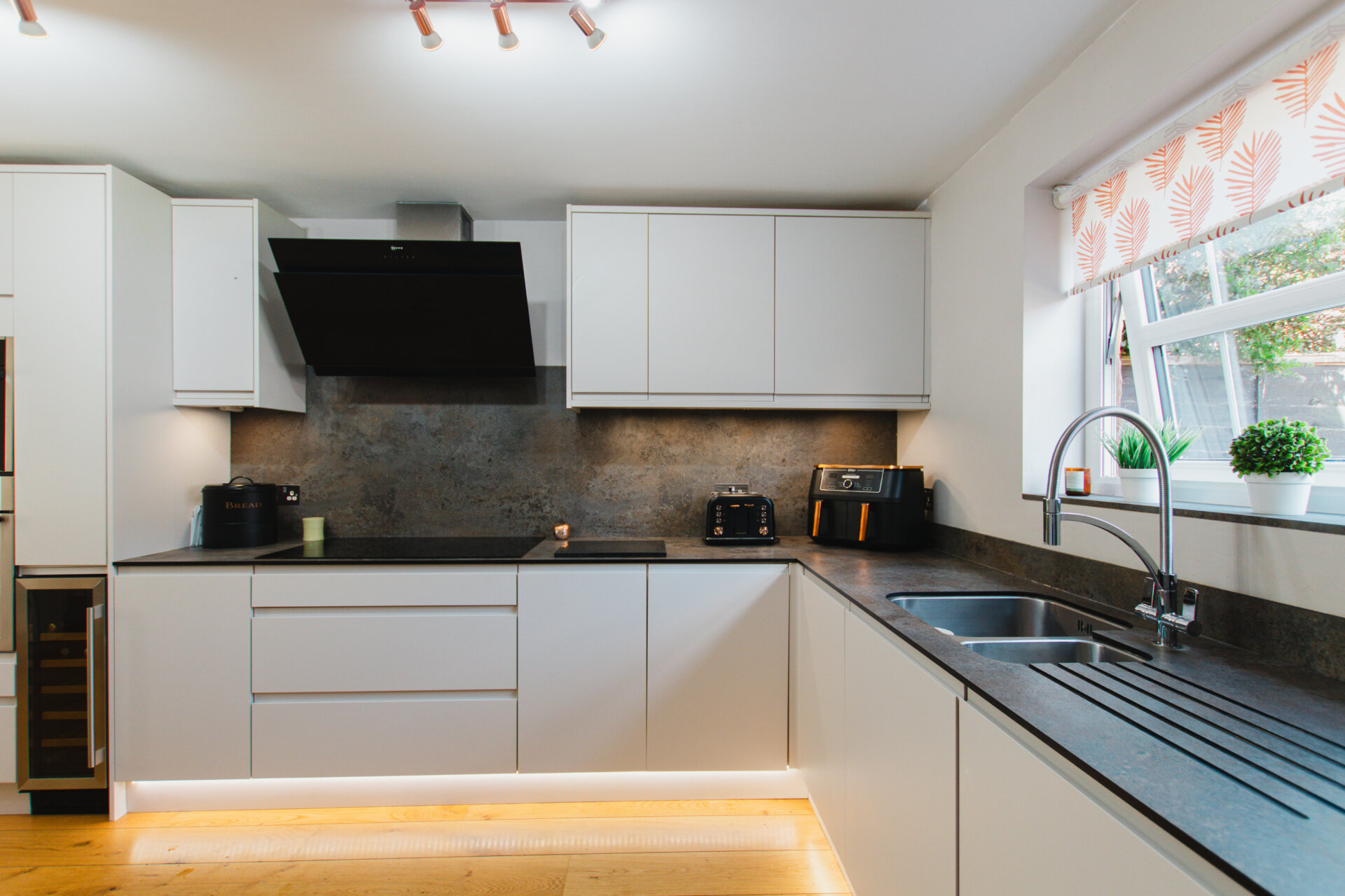 To the left of the hallway is a spacious open-plan kitchen and dining area, perfect for everyday family meals and entertaining. The kitchen is equipped with an integrated Neff oven, microwave, induction hob with extractor, wine cooler, dishwasher, and space for an American-style fridge/freezer. Adjoining the kitchen is a practical utility room, fitted with a sink, housing the boiler, and offering space for both washing machine and tumble dryer. A door leads directly from the utility room into the garden.
