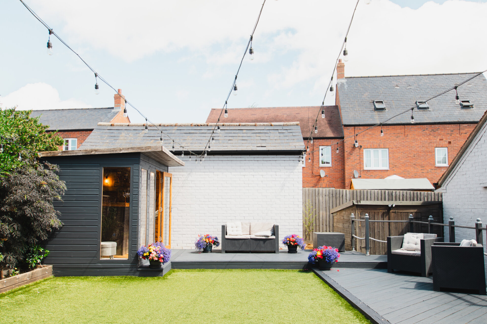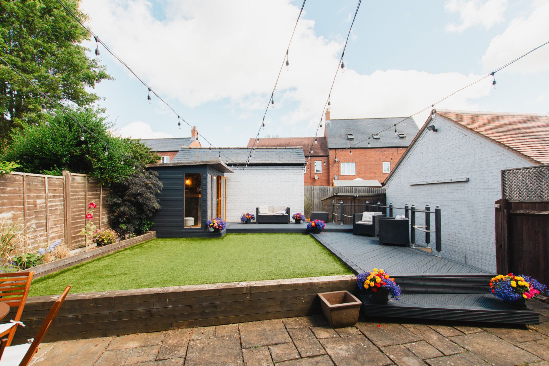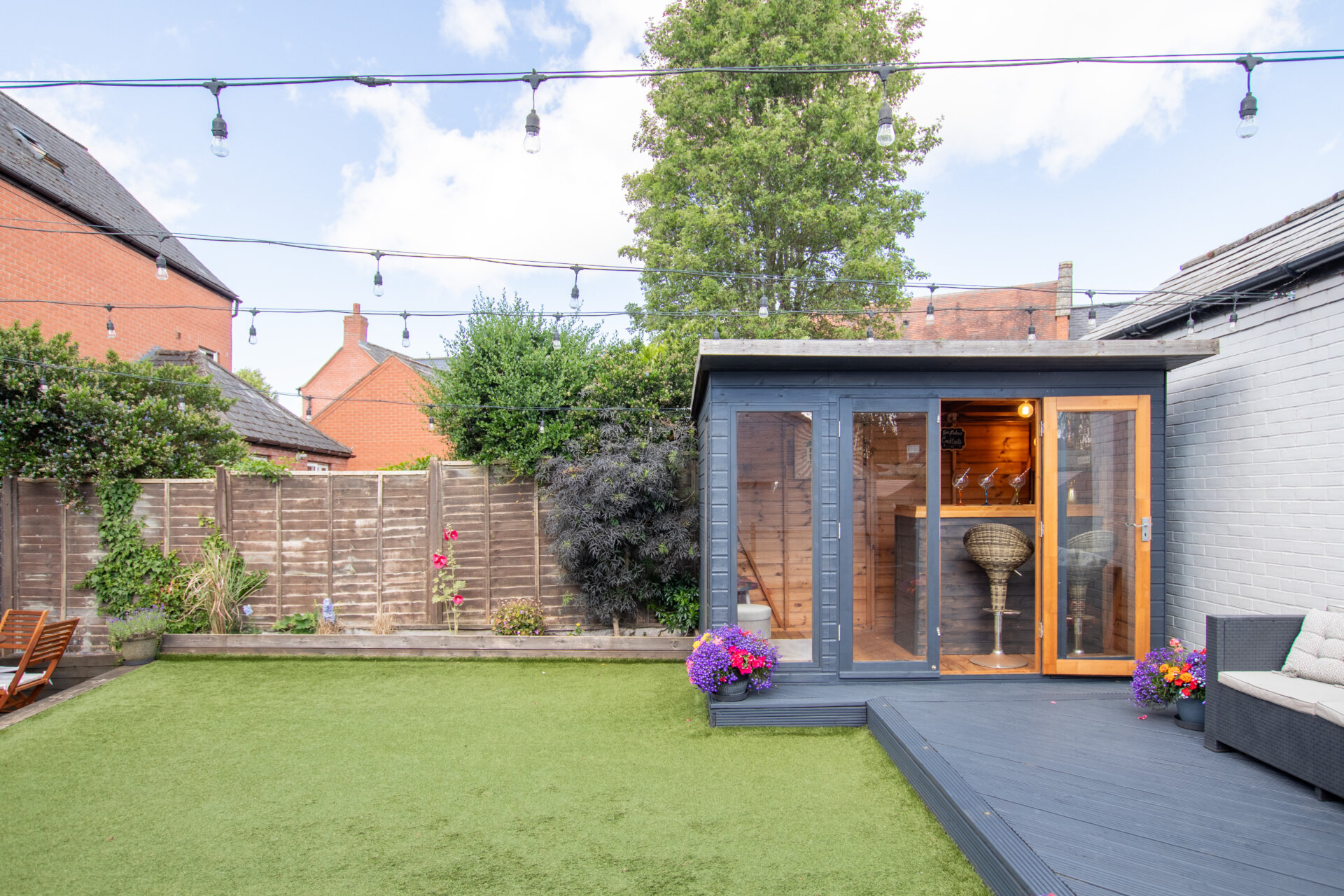 The rear garden is designed for easy maintenance and family enjoyment, with a paved patio, raised artificial lawn, decking area, and a charming timber cabin—currently fitted out as a bar, perfect for entertaining. A large shed behind the garage provides additional storage. Mature trees around the plot enhance the feeling of privacy and natural beauty.