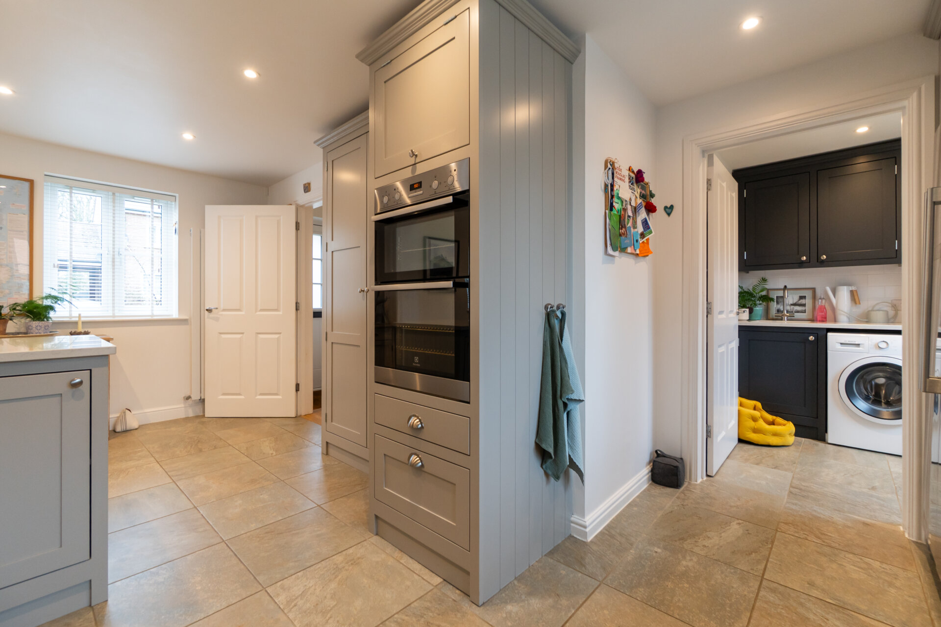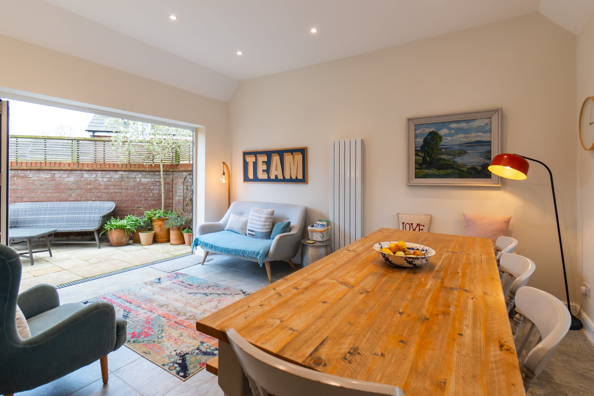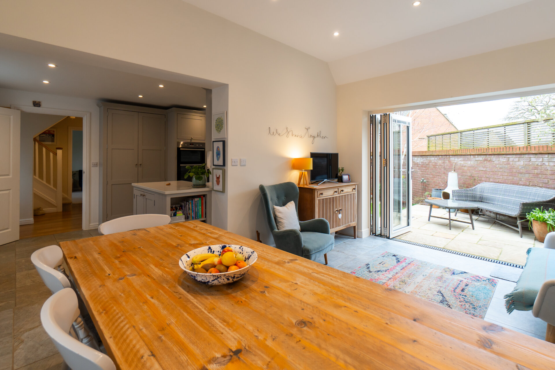 The stunning bespoke kitchen by Cotswold Kitchens features ample storage, high-quality worktops and integrated appliances, creating a superb and practical space for everyday living and entertaining. A separate utility room adds further convenience. The kitchen flows seamlessly into an extended family area with a striking vaulted ceiling and bi-fold doors opening onto the garden, flooding the space with natural light and creating a wonderful indoor-outdoor connection.