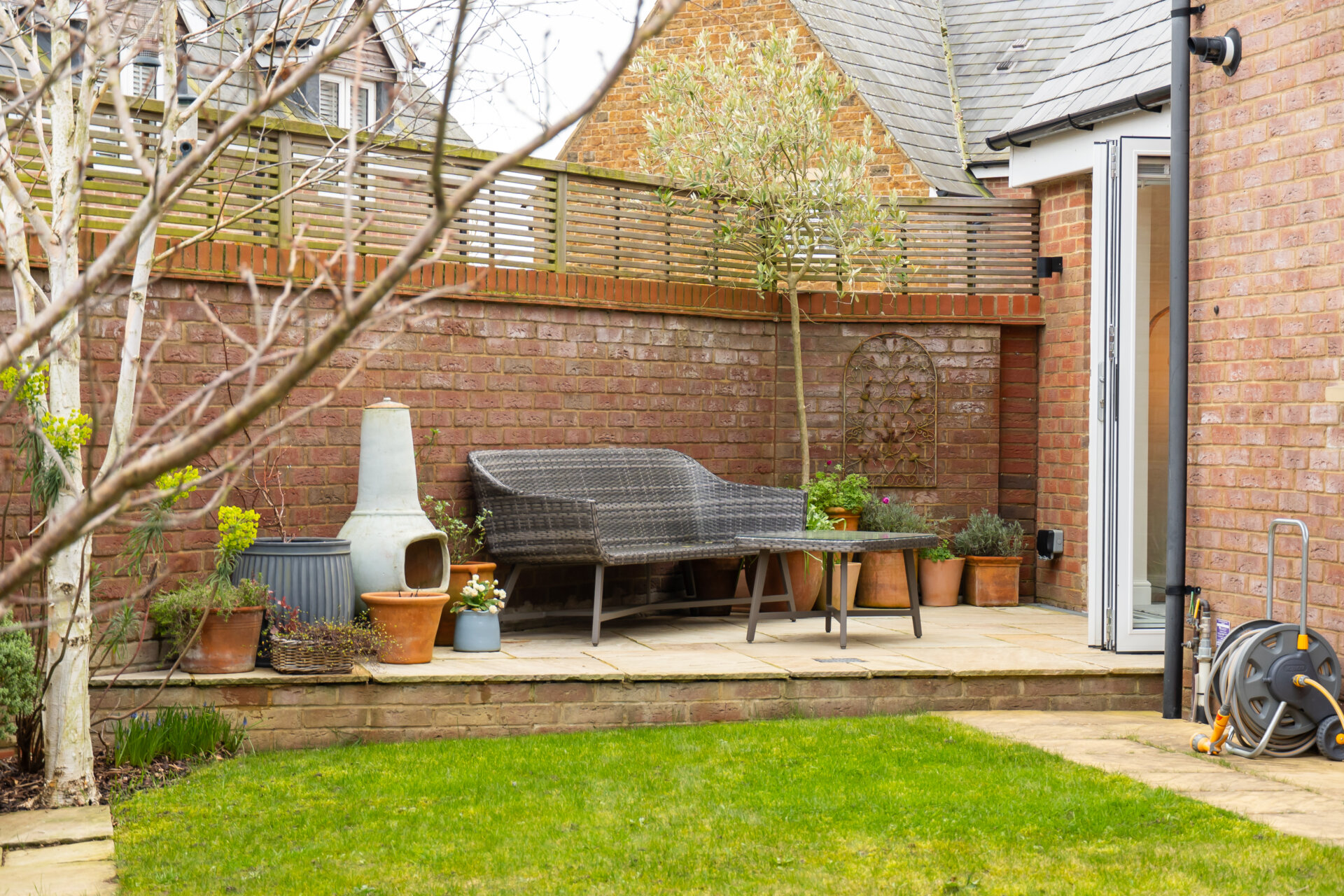 Externally, the landscaped rear garden has been thoughtfully designed to provide an attractive and low-maintenance outdoor space. It features a smart patio seating area, walled garden, a neatly laid lawn, and mature screening plants. A gate gives access to the driveway, with an additional door leading directly into the garage.