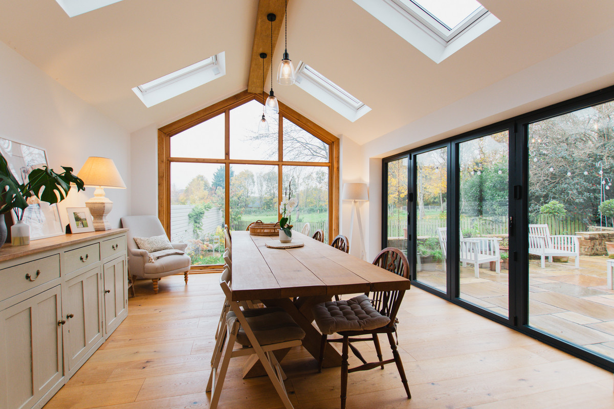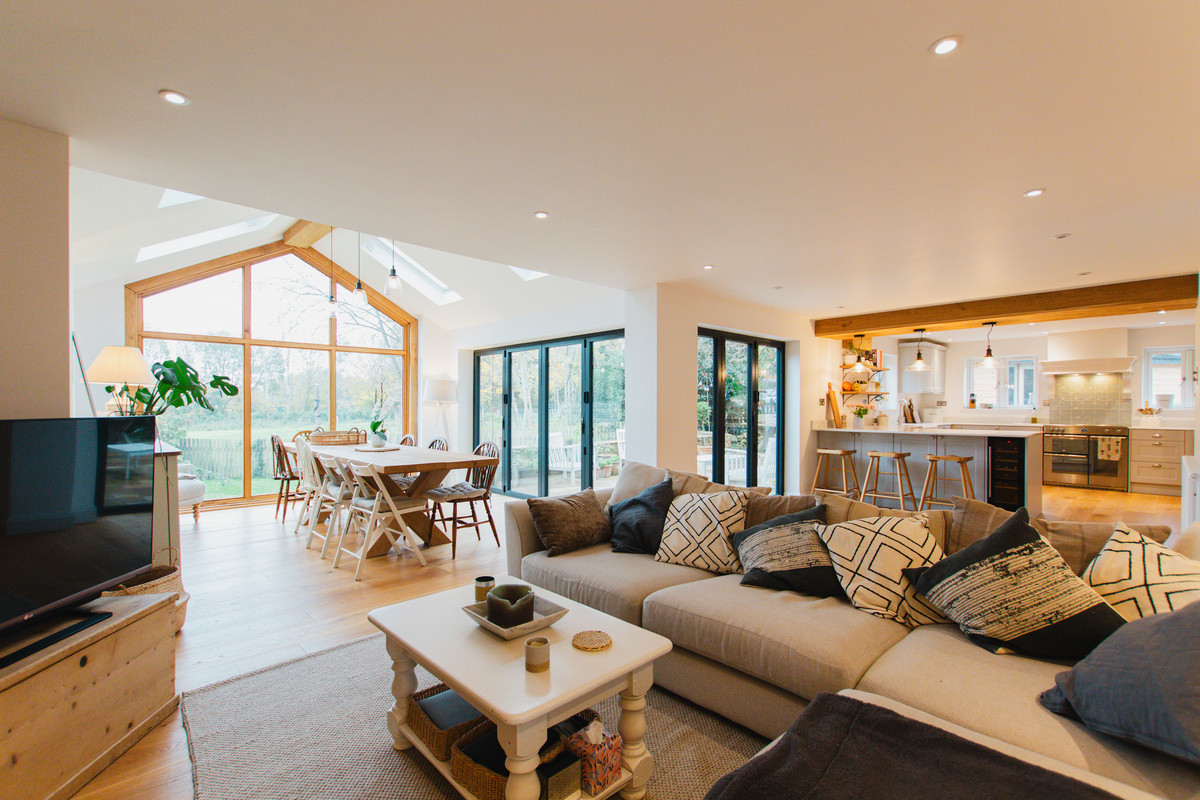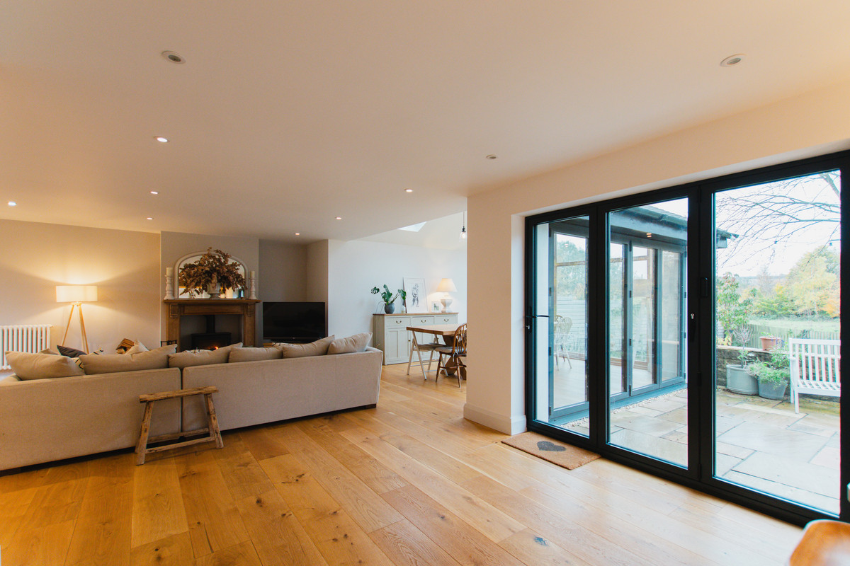 Most of the ground floor space is open having clear zones to the space, and all flowing together. The space is versatile in it's use, and caters for a variety of family sizes. Currently there is an open space with bifolding doors opening onto the rear garden patio, lounge area, dining area, again with bifold doors opening onto the patio.