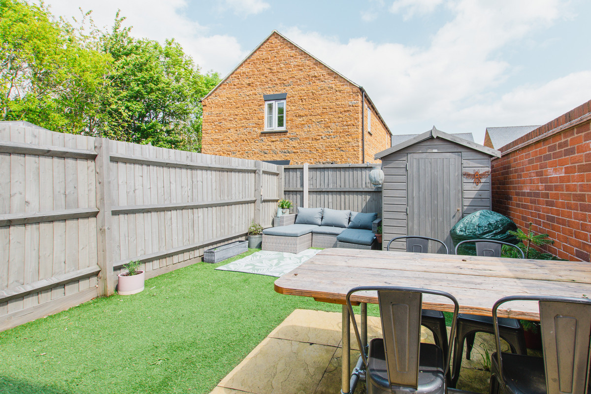 The garden is low maintenance, having patio area, artificial turf, wooden shed, seating area, dining area, and gate leading to the front aspect.