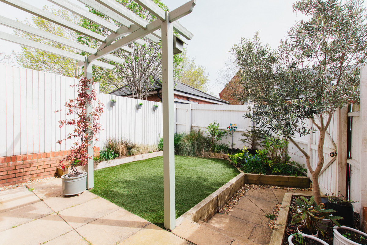 The garden is well maintained, and configured, having high quality artificial turf (no mud!) well stocked borders, and patio area covered by a wooden pergola. There is a rear gate that leads to the parking and garage. The garage is on the right of the two when looking at the two garages (as seen in photos)