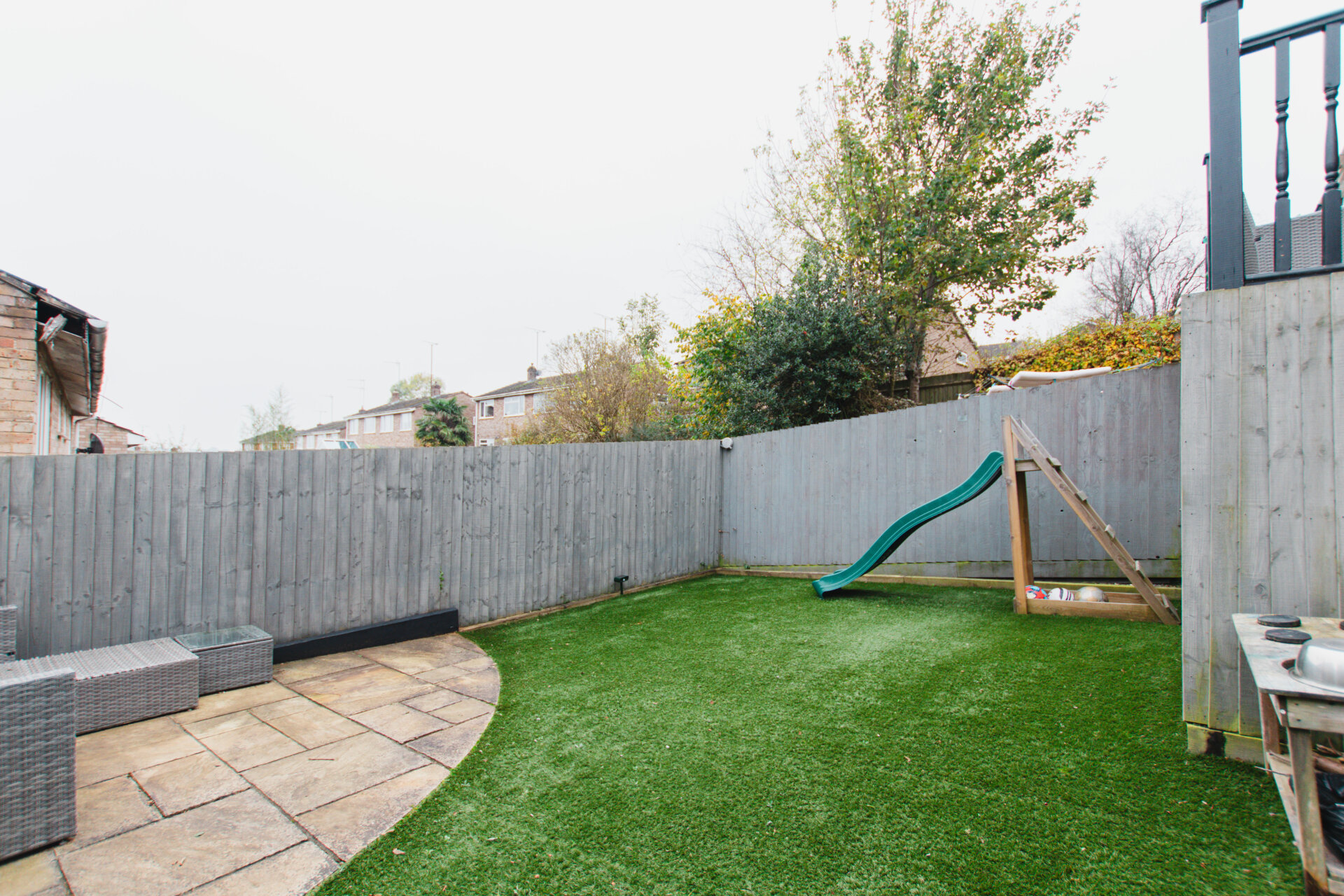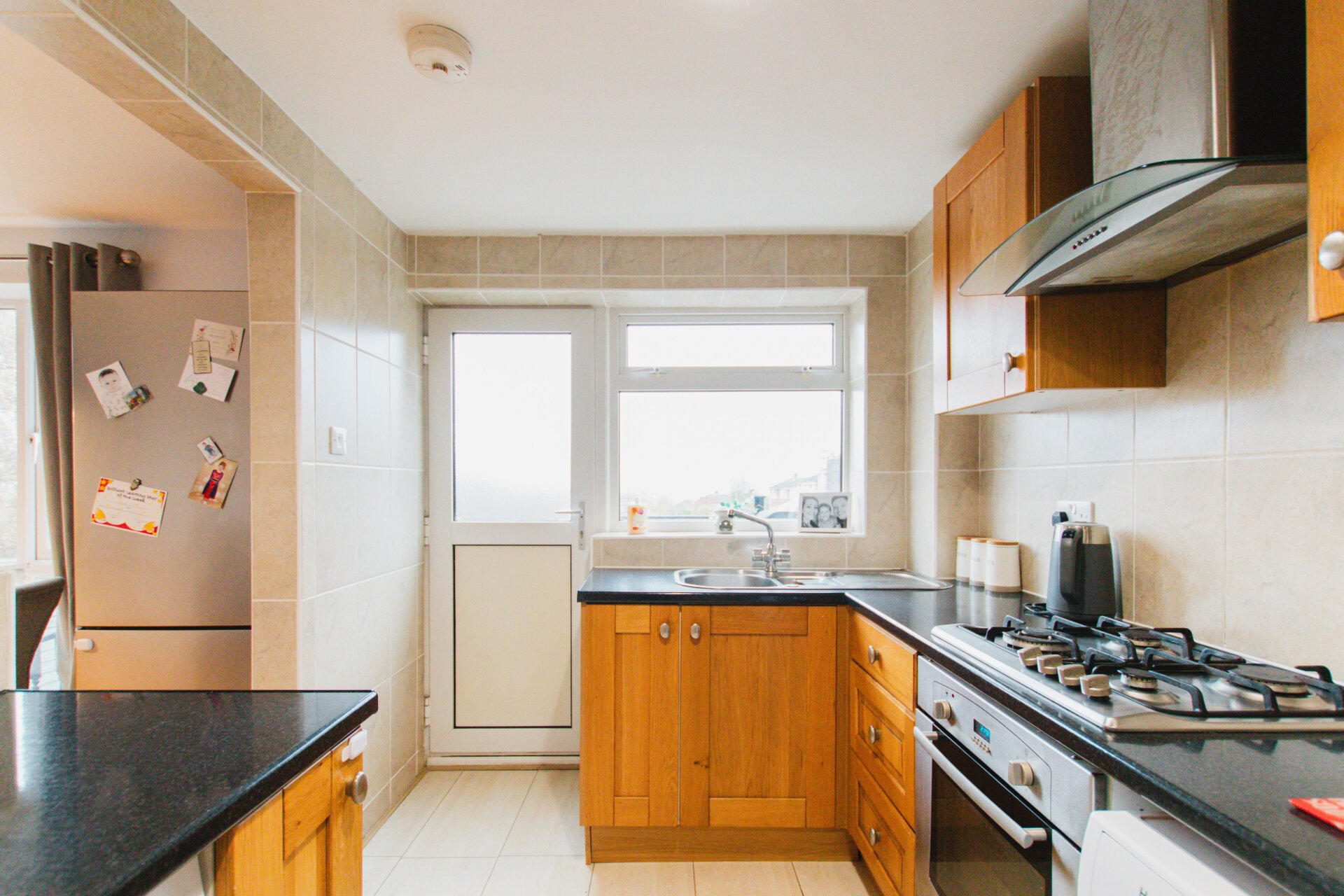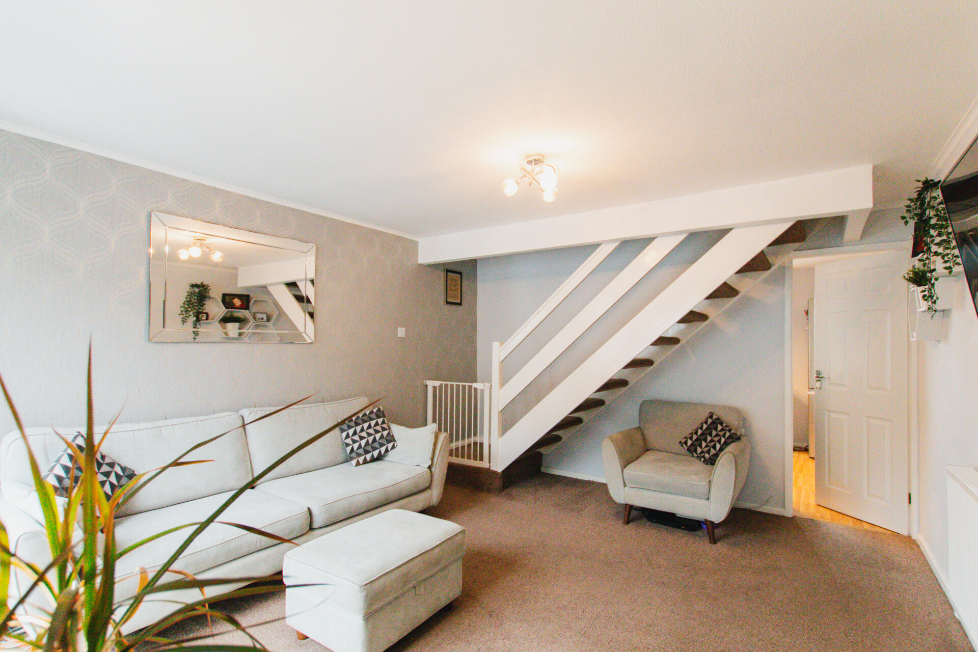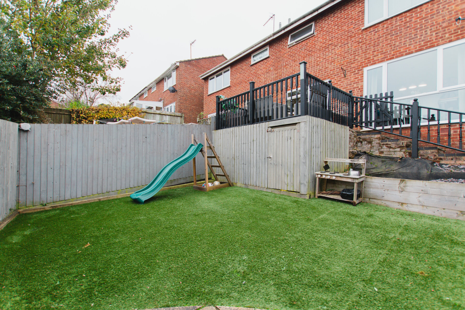 A smart, three bedroomed semi-detached house that is in a popular location, especially with families due to the schooling, parks and amenities nearby. The house itself is very well presented, and comprises of an entrance porch, sitting room, open plan kitchen dining room, three bedrooms, family bathroom, external storage, garden, garage and driveway. This style of house make a superb option for families looking to live in a quiet and central location. There is ample driveway parking in front of the house, and a garage having light and power connected. Storage is a premium these days, and this house does have a lot of storage, there are sizeable cupboards on the landing, a loft space, garage, and external storage area beneath the raised decking. The garden is split over two storeys, having a recently laid decking area immediately off of the kitchen, with steps leading down to a flat level, ideal for a playing area or entertaining due to it’s privacy.