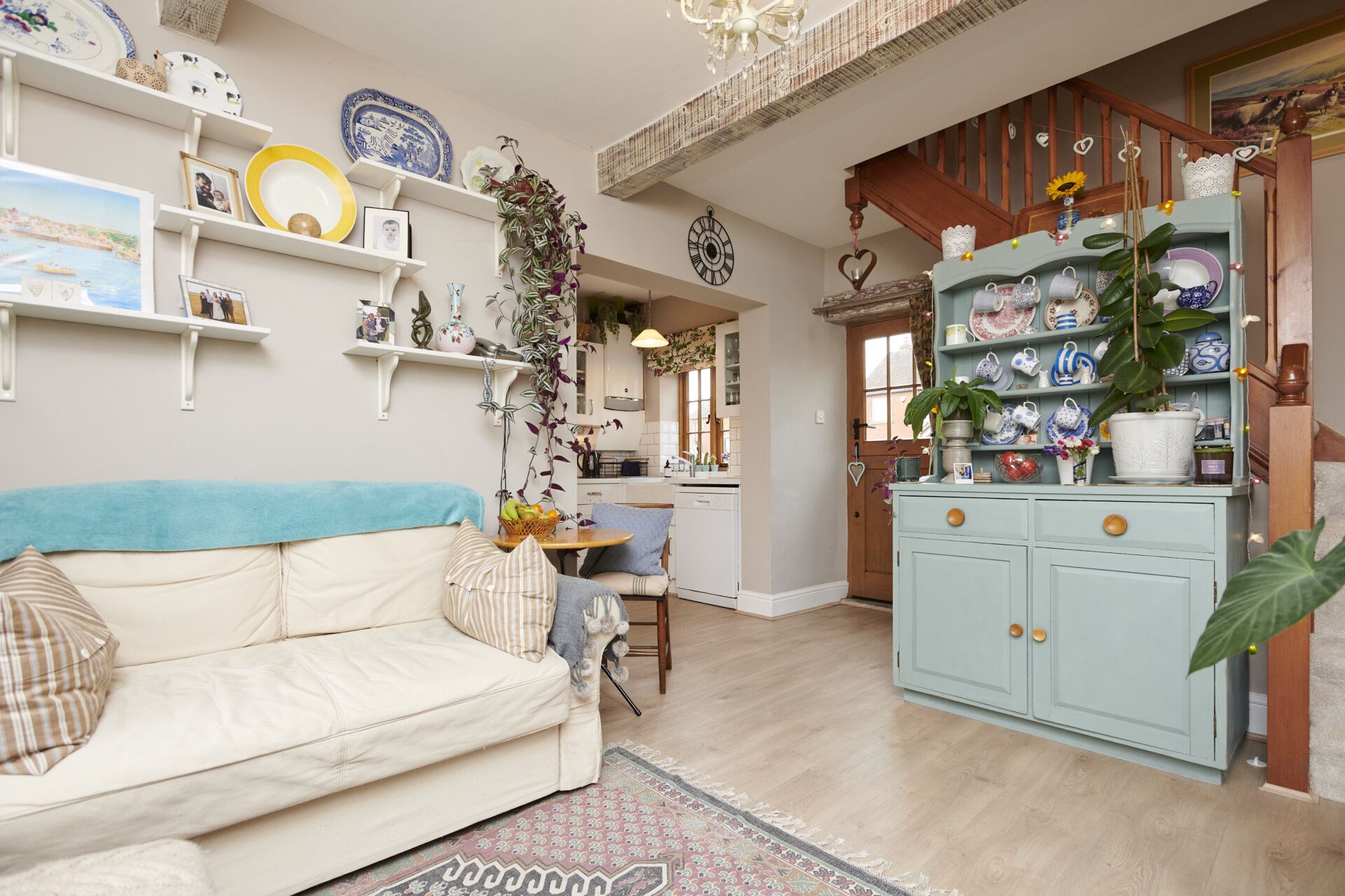 A gorgeous lounge with double glazed window to the front elevation overlooking to stunning open views over the rolling hills of Belper , wood effect laminate flooring, radiator, exposed open beams, under stairs storage, double glazed stable door and open wrap around staircase.