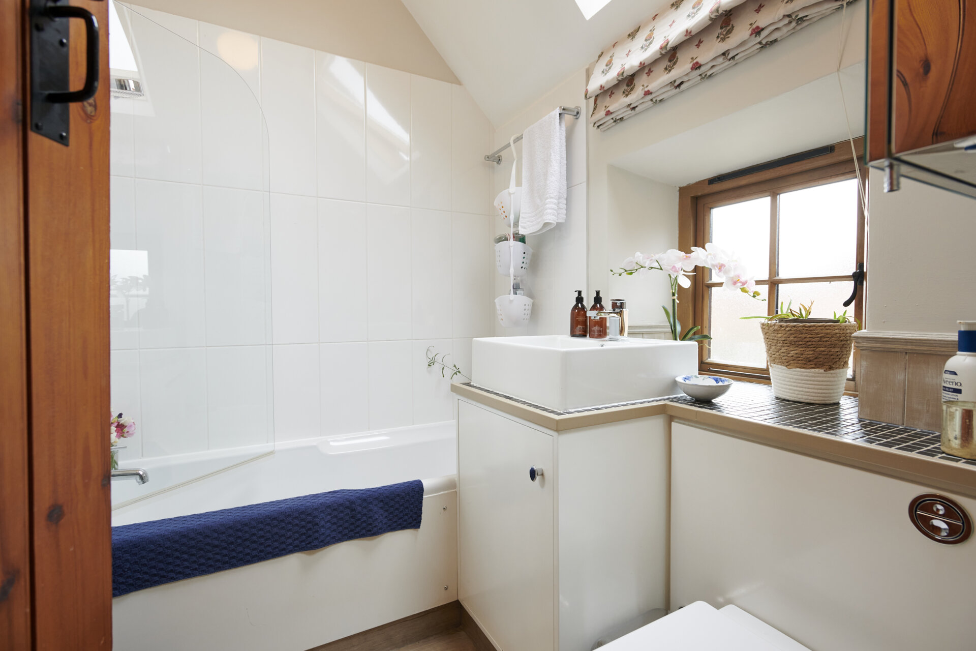 A white three piece bathroom suite comprising, a panelled bath with shower over, glass privacy screen, vanity unit with inset wash hand basin, wood effect laminate flooring, double glazed window to the rear and 'Velux'.