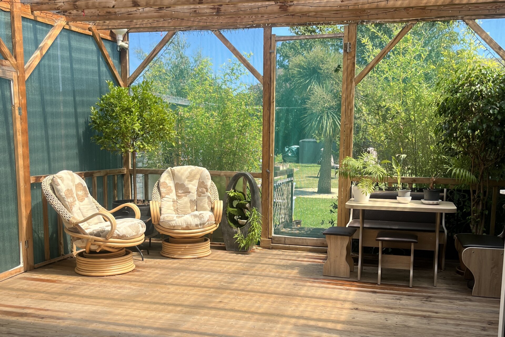 Bespoke and Unique 'Covered pergola' amazing space for entertaining leading out from the bifold doors with a seating area and outdoor TV overlook the large garden space Lit up at night with remote controlled lighting features throughout.