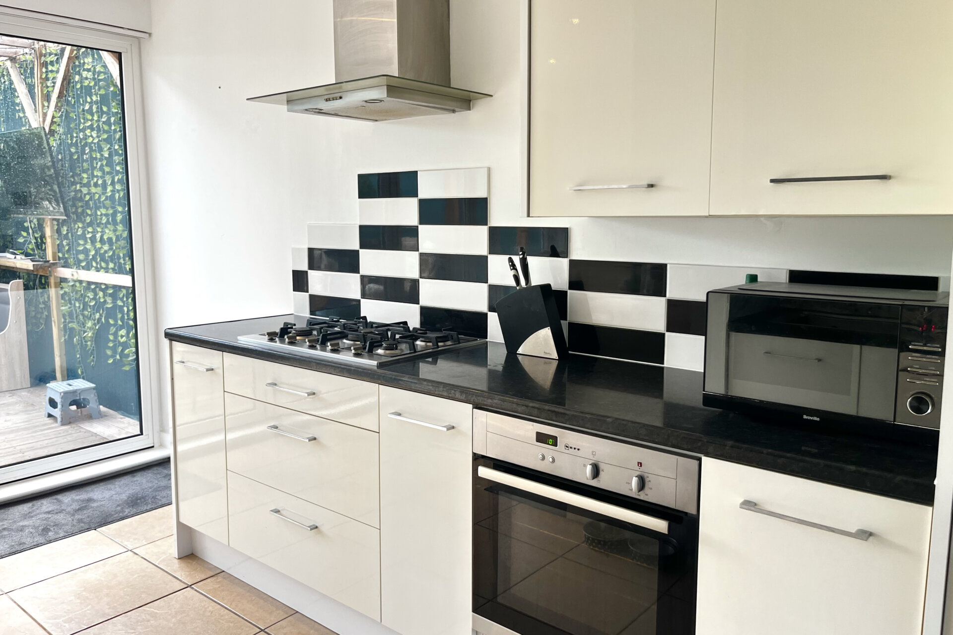 Open plan kitchen area that opens up to the dining space at the back of the home, equipped with an american double door fridge freezer, washing machine and dishwasher and gas hob.