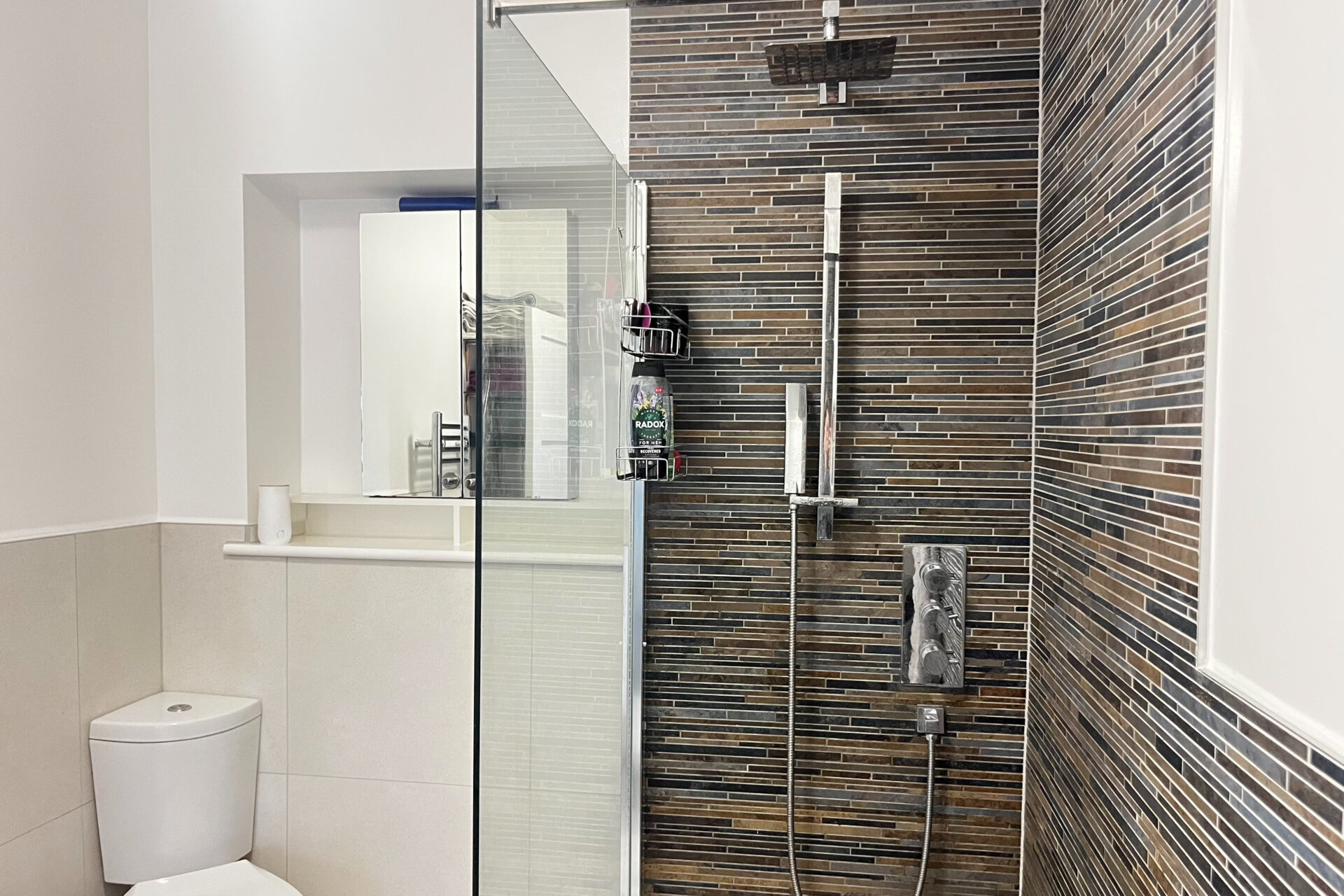 Nicely finished bathroom with a waterfall shower and vanity unit