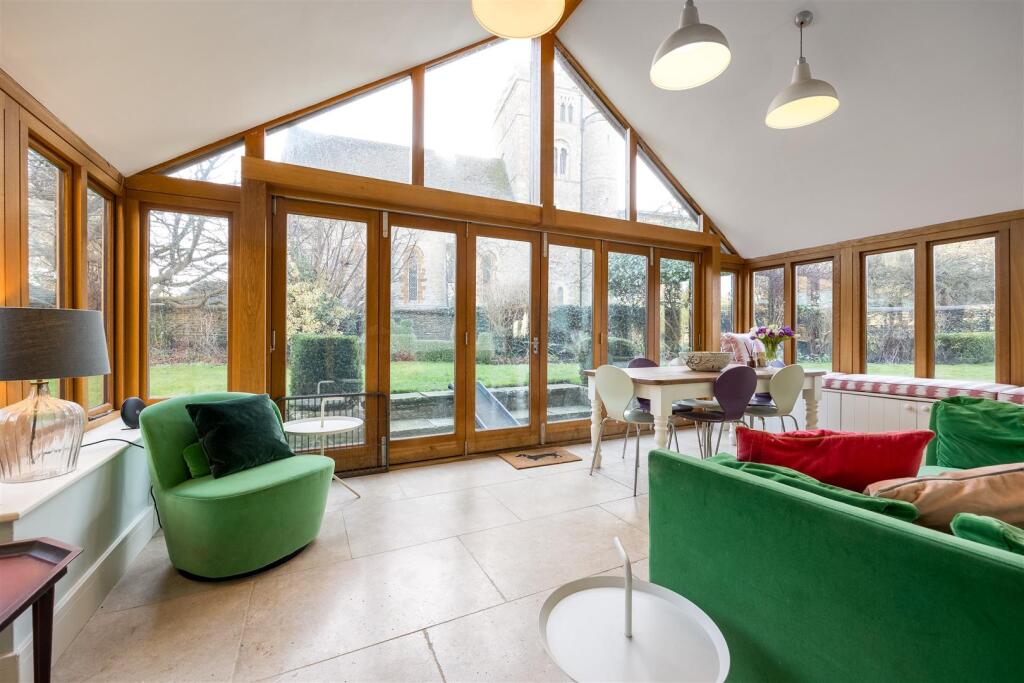 Flowing from the kitchen is the impressive the oak-framed orangery. Vaulted, light-filled and enjoying uninterrupted views of the church beyond, it is a room for all seasons and one of the most compelling spaces in the house equally suited to quiet mornings or elegant evenings with friends.