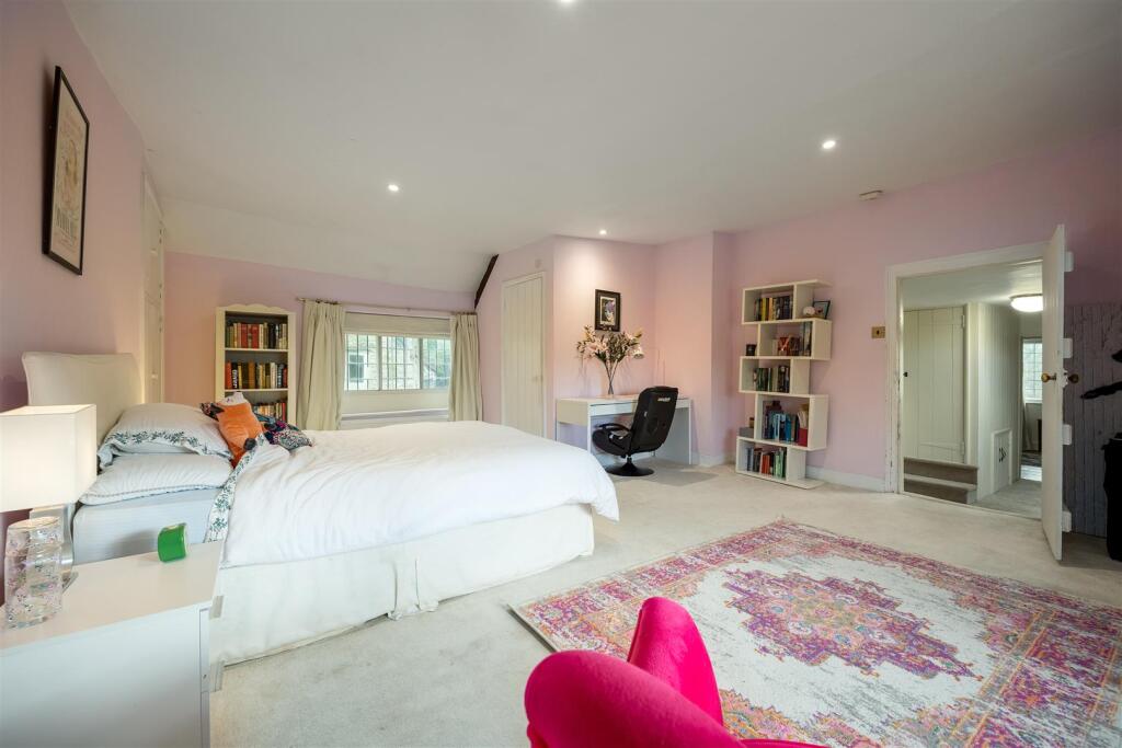 The accommodation is both generous and flexible, offering up to five bedrooms, including three en-suites, arranged over three floors. Each room has its own distinct character, from romantic leaded windows and window seats to vaulted ceilings framed by original roof trusses. The principal bedrooms are especially noteworthy spacious, serene and beautifully finished.