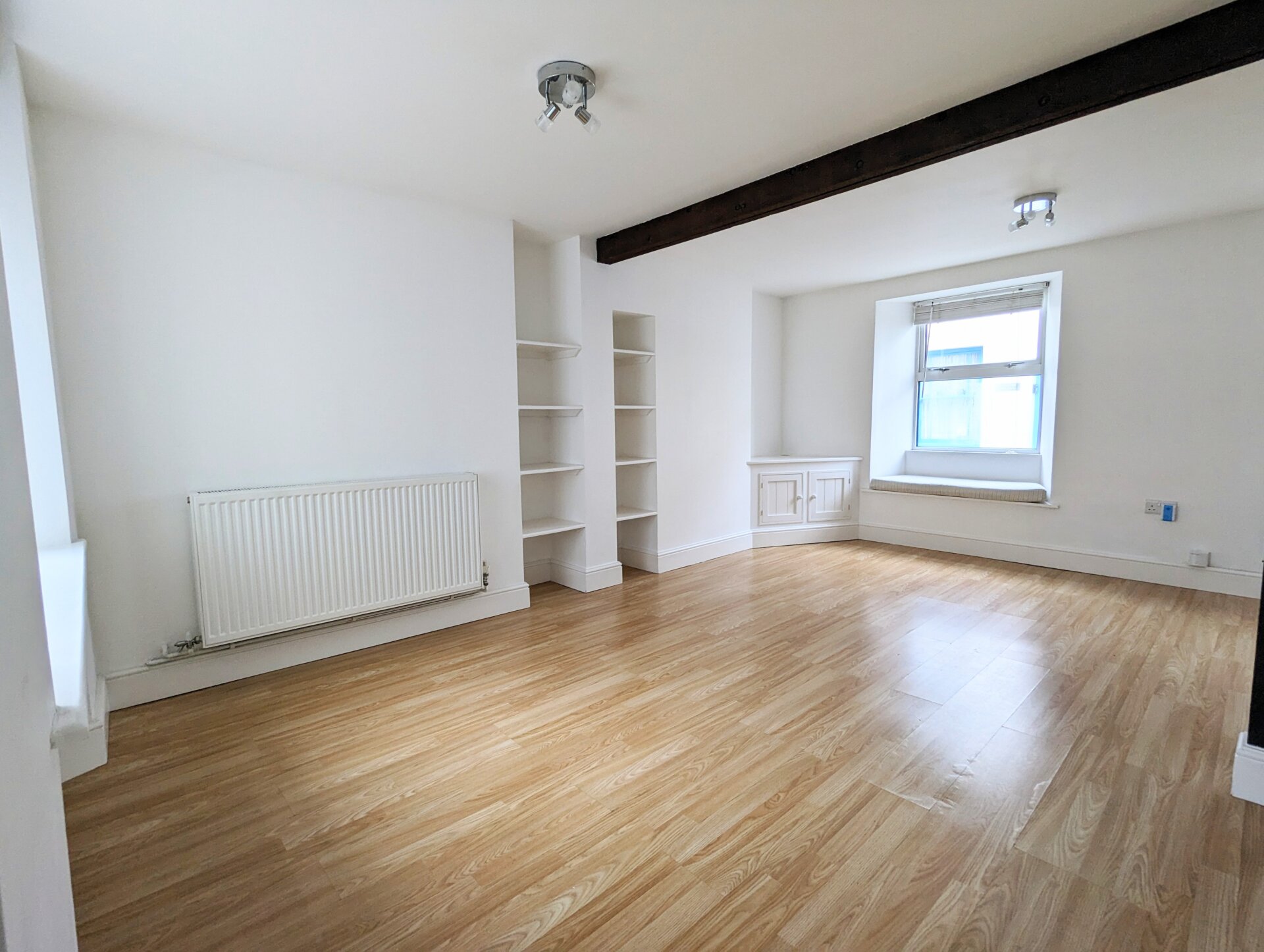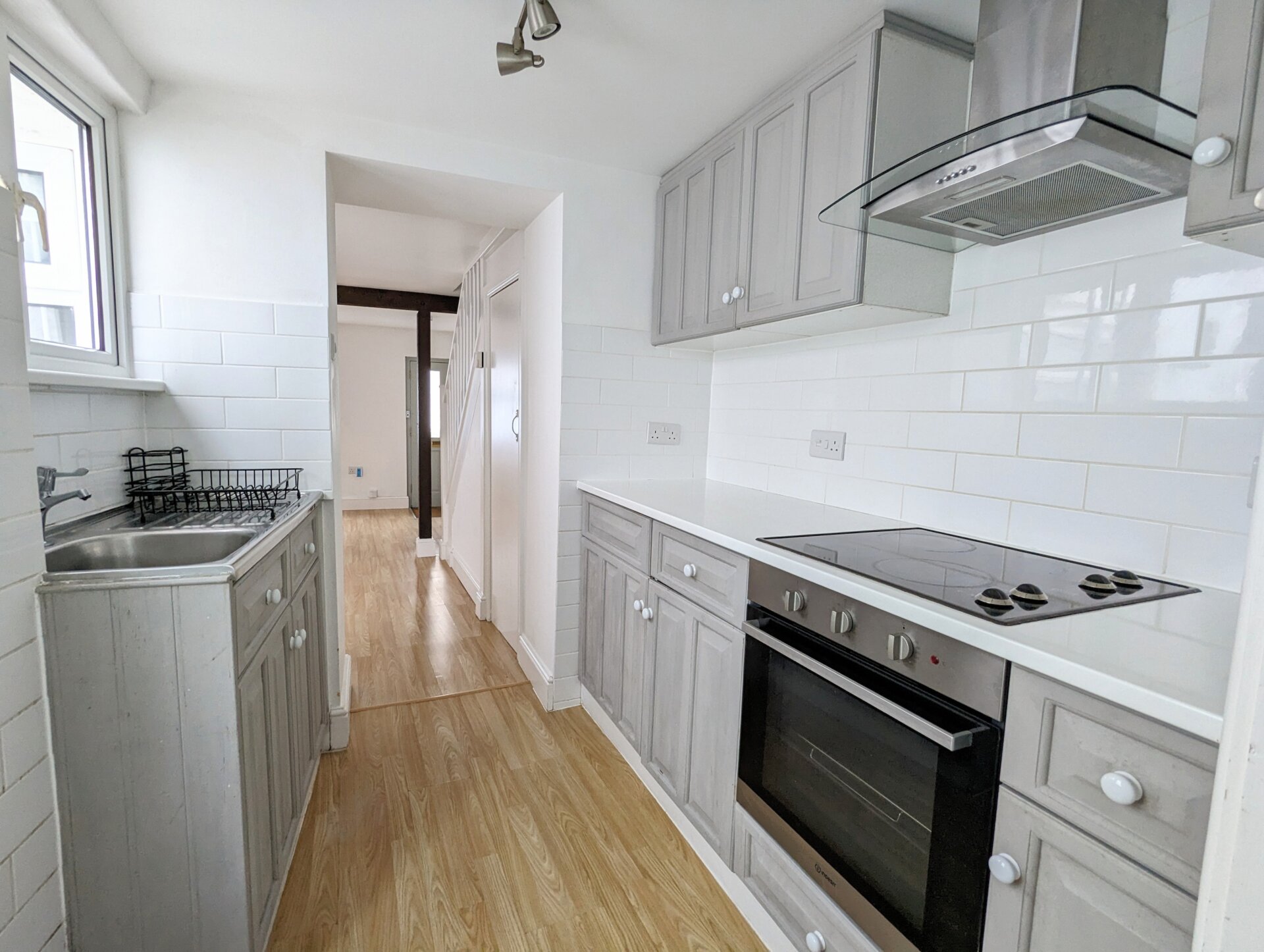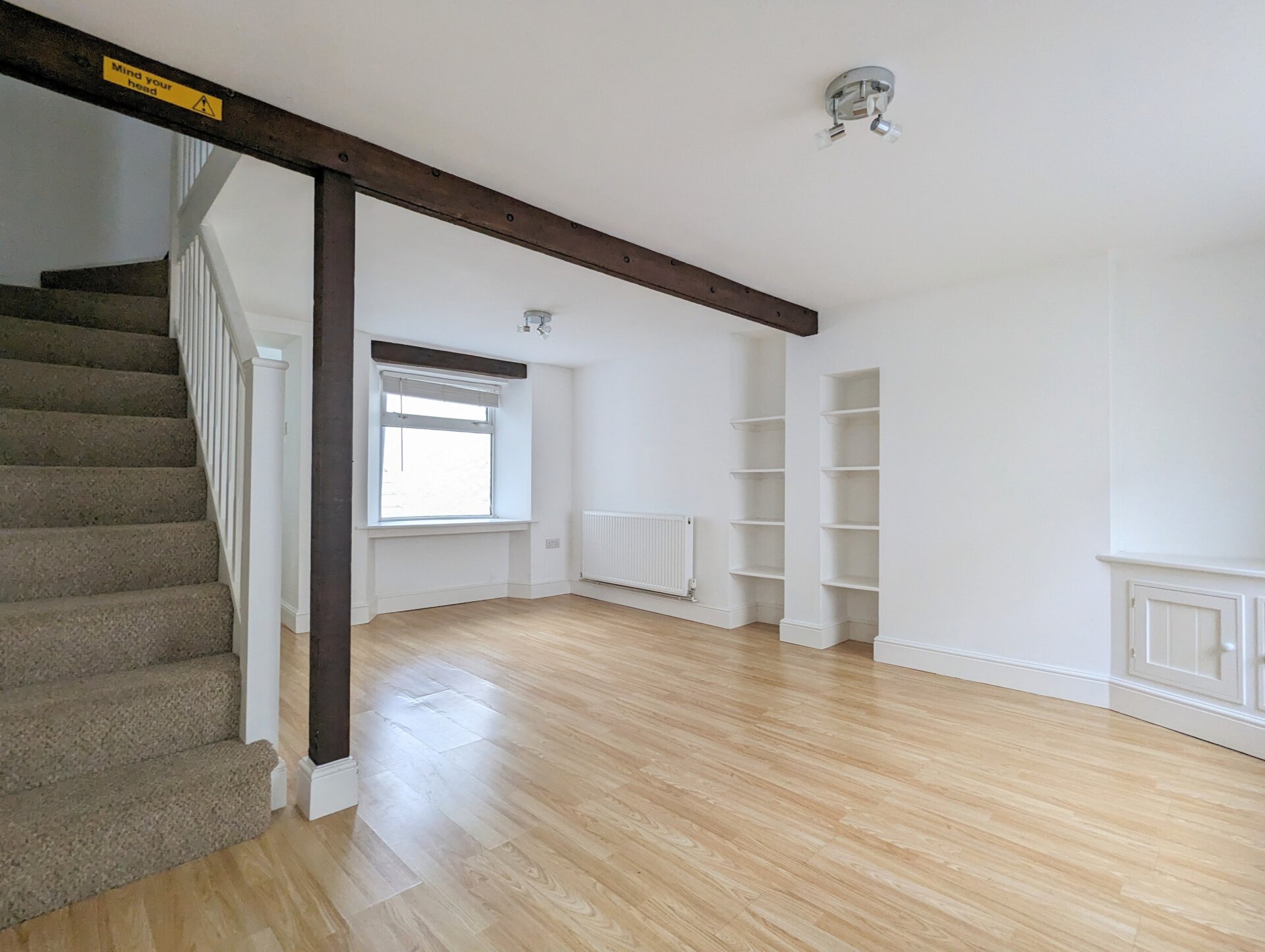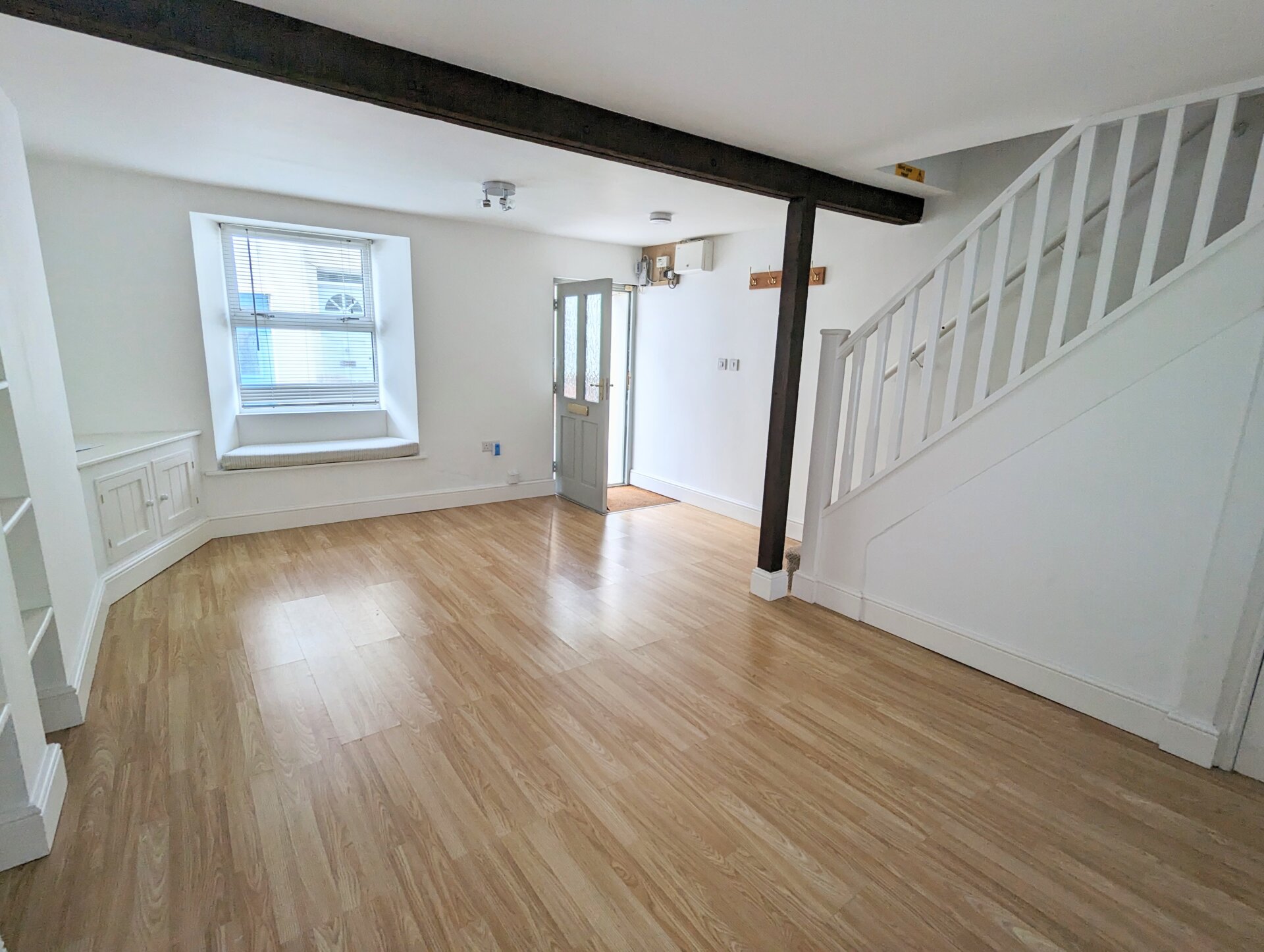 The front door opens into the room with a recessed coir doormat and laminate flooring, ideal for muddy paws. The lounge/diner is light and airy with windows to the front with an attractive window seat and to the rear looking out onto the yard. Exposed original ceiling beams, built in shelves/bookcase, corner cabinet and under stairs storage.