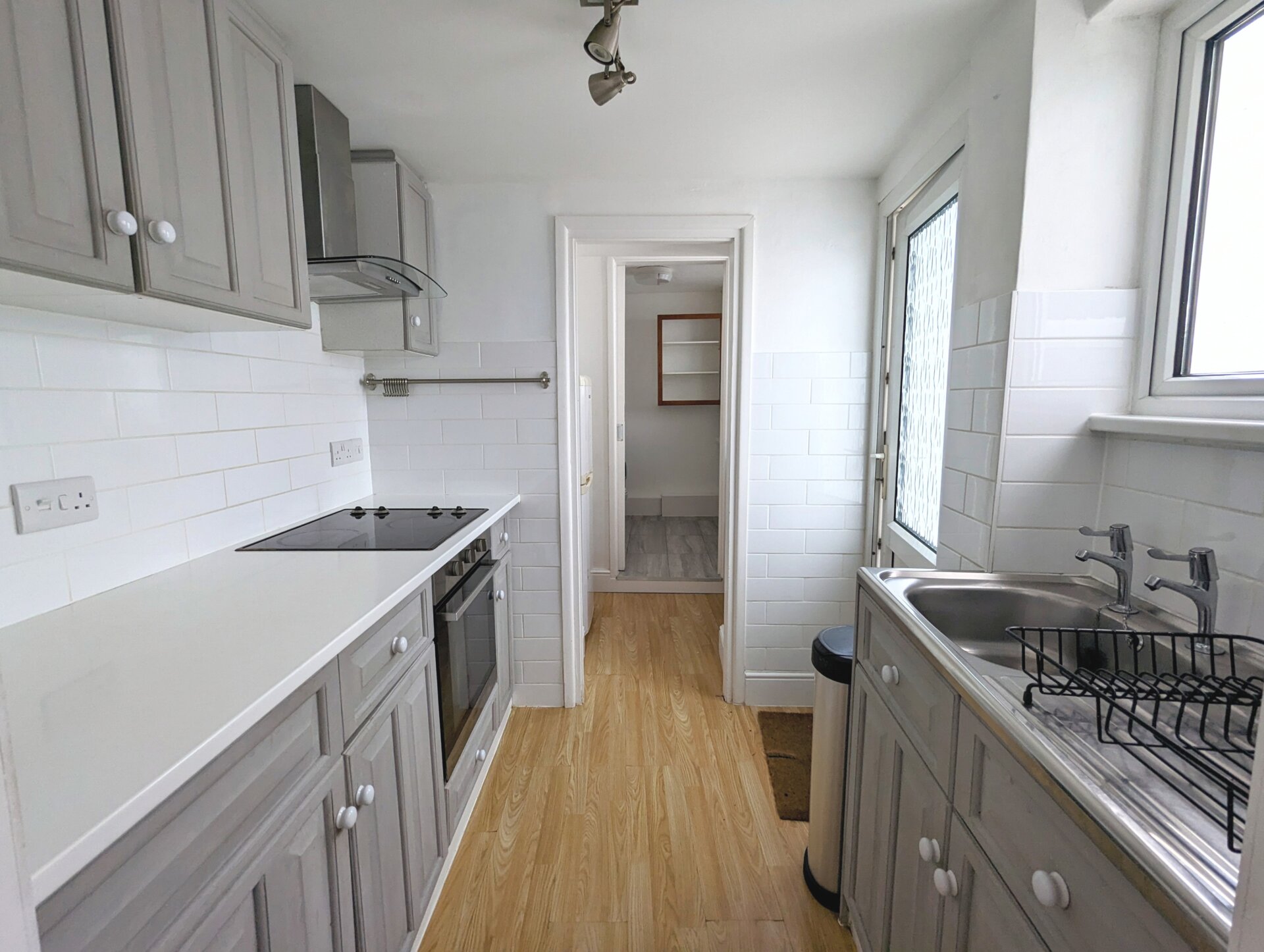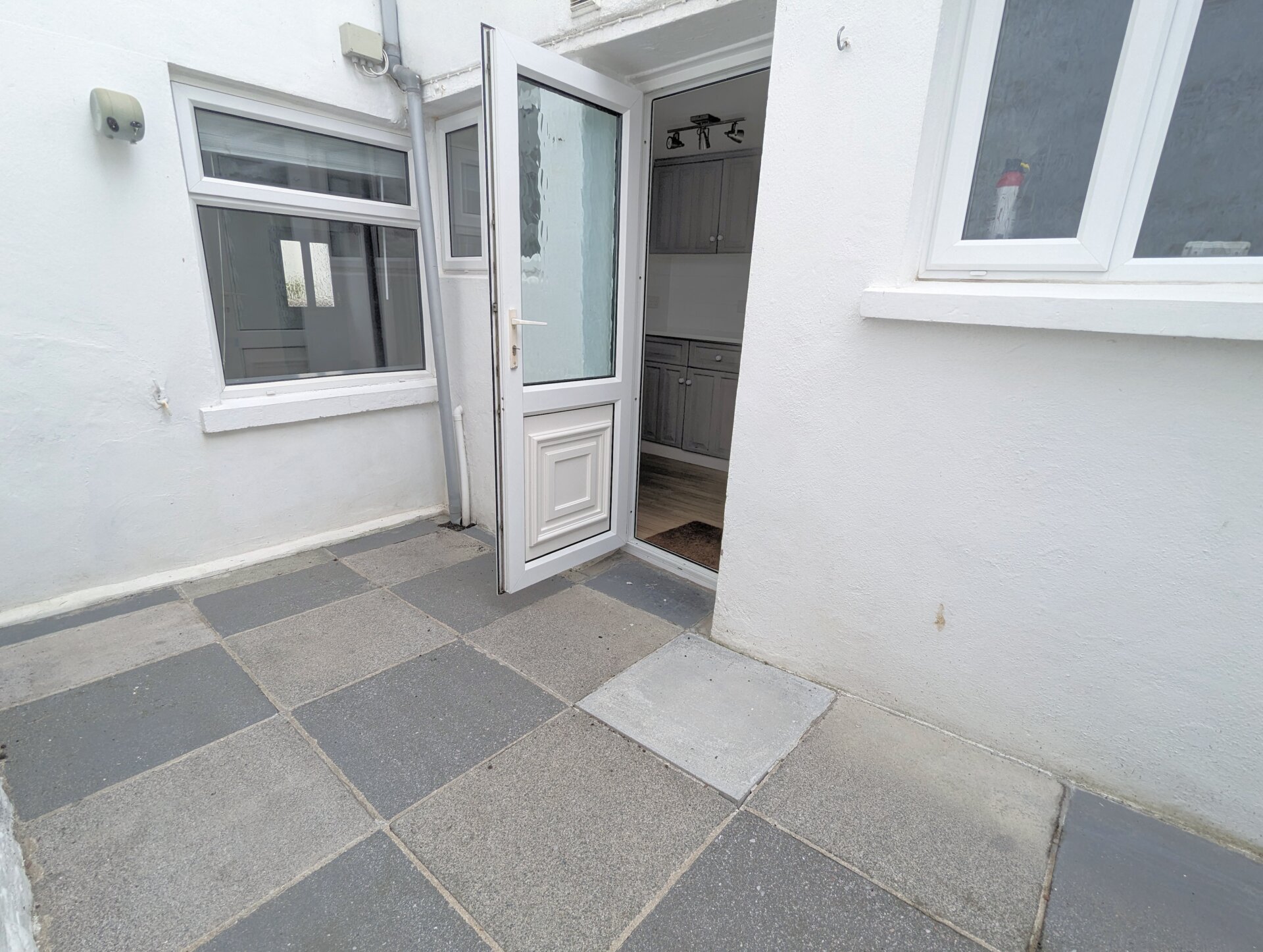 Space for a fridge/freezer and small appliances such as a microwave, air fryer or cake mixer for those who enjoy baking at the weekends. Opening window and sliding door into;