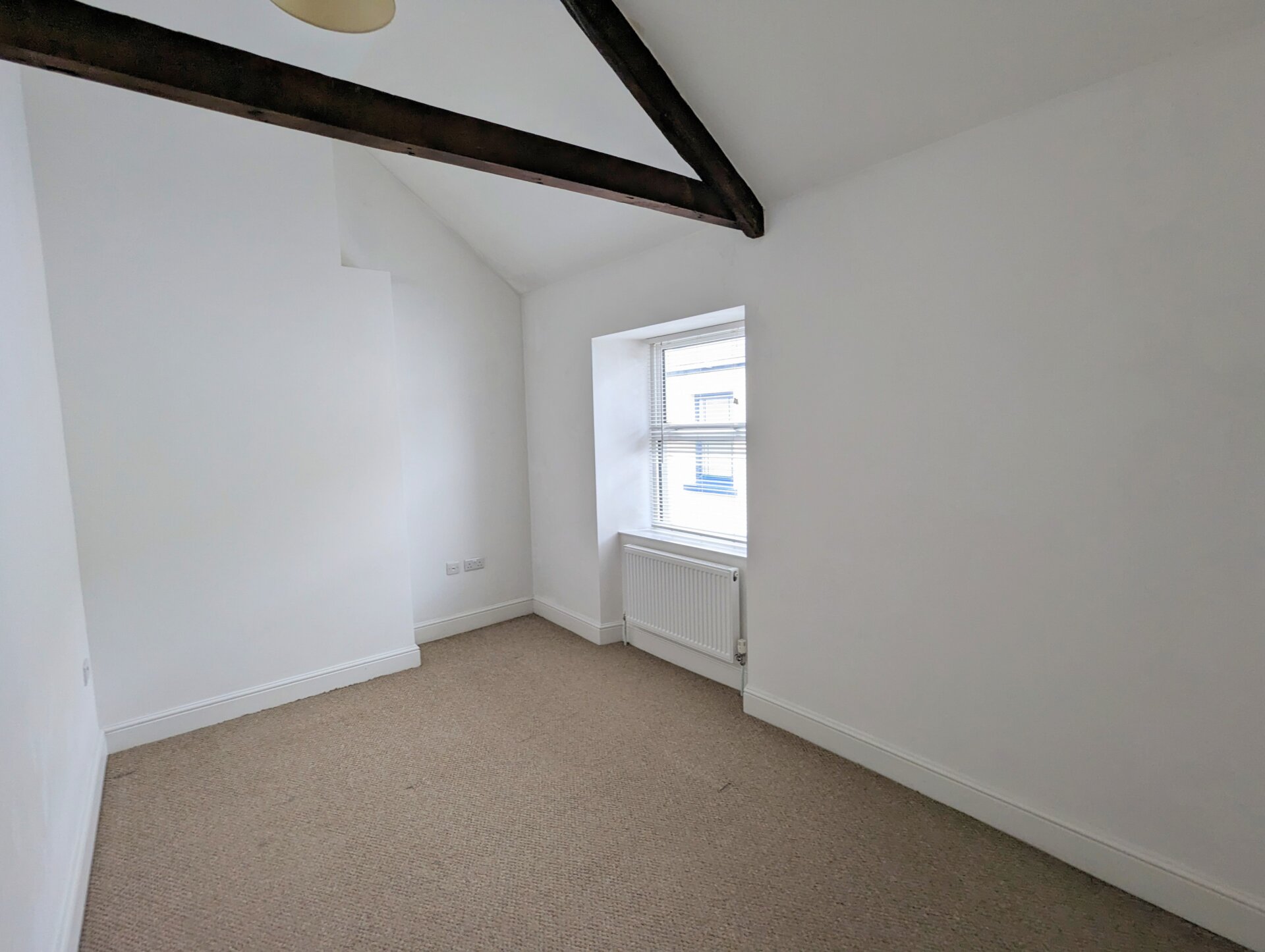 The principle bedroom filled with light from the front facing window that enjoys estuary and sea glimpses. High ceiling with exposed original beams, carpet, and radiator.