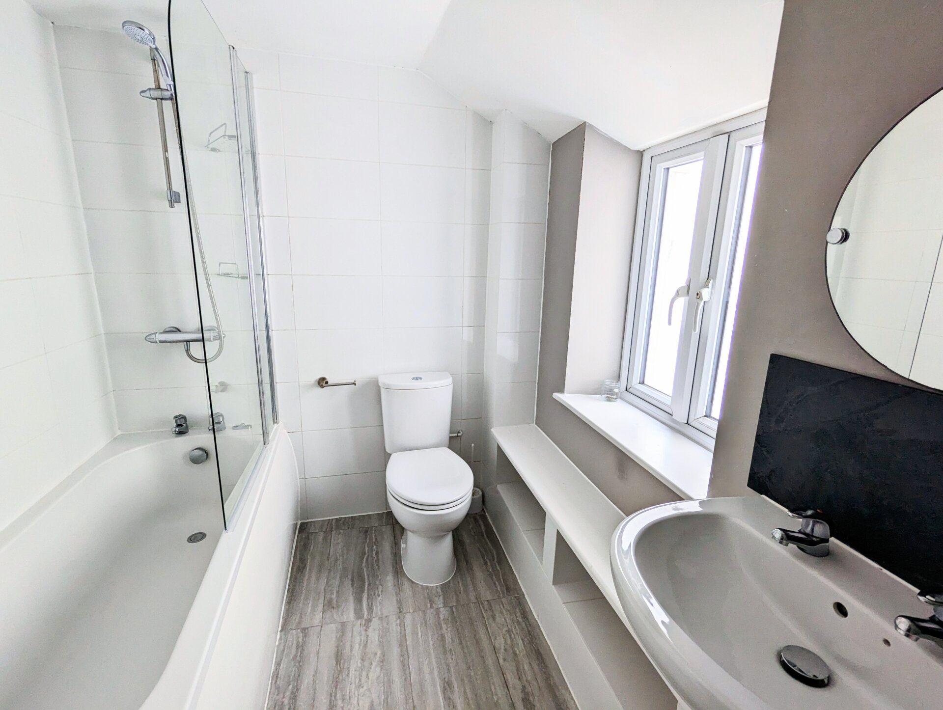 White suite comprising toilet, sink, bath with shower over and glass shower screen. Tiled flooring with part tiled walls and splash back, circular wall mirror, extractor fan and chrome heated towel rail. A clever low level open shelving unit has been created below the window to store toiletries, loo rolls, candles etc without impacting the floor space.