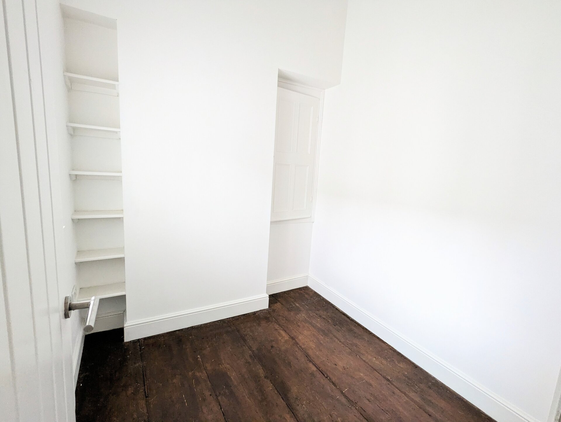 A small bedroom overlooking the yard with high ceiling with exposed original beams and flooring, built in cupboard and shelves/bookcase. This room would be ideal as a small single/child's bedroom, office or hobbies room.
