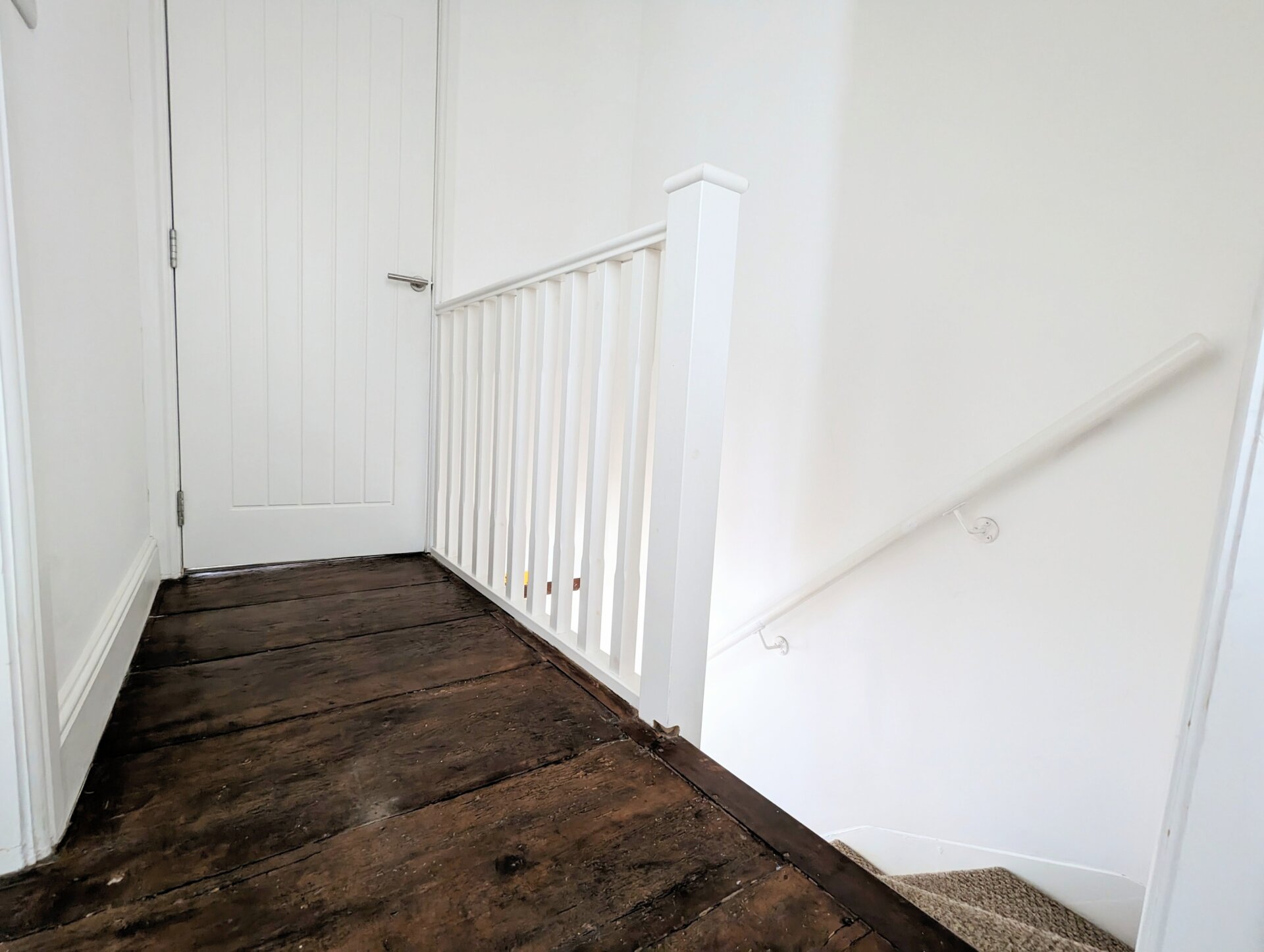 High ceiling with exposed original beams and flooring that meets the carpeted staircase. Wood banister and hanging glass pendent. Doors to;