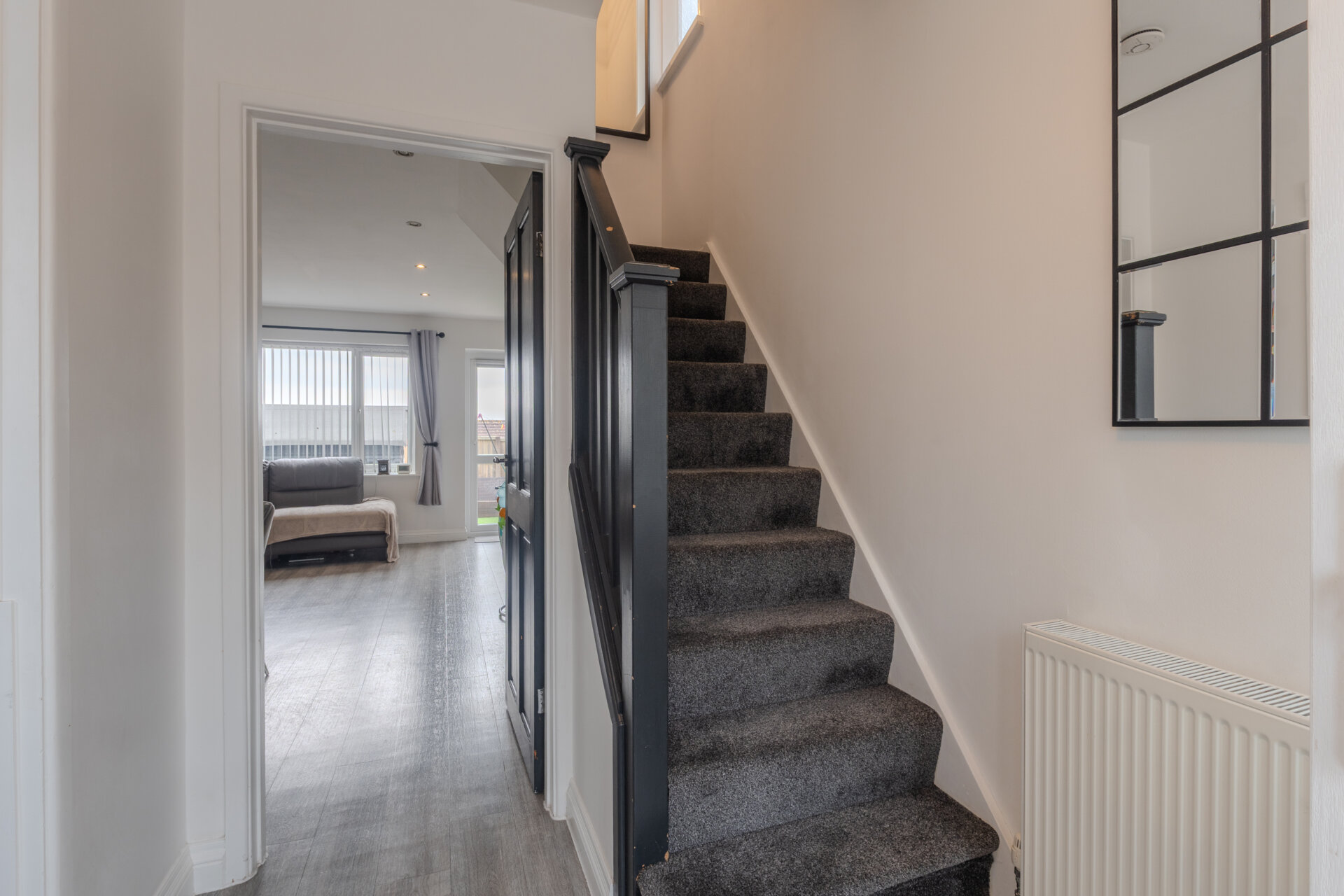 Having laminate flooring, carpeted stairs, light fitting to the ceiling, radiator,door giving access to the lounge and door frame to the side giving access to the kitchen.