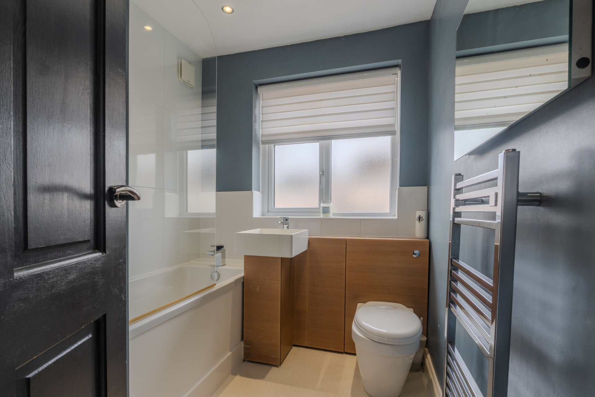 Having vinyl flooring,part tiled walls, airing cupboard housing boiler, low level flush w.c, sink with mixer tap, bath with shower over, heated ladder style towel rail, opaque window ti the front elevation and spotlights to the ceiling.