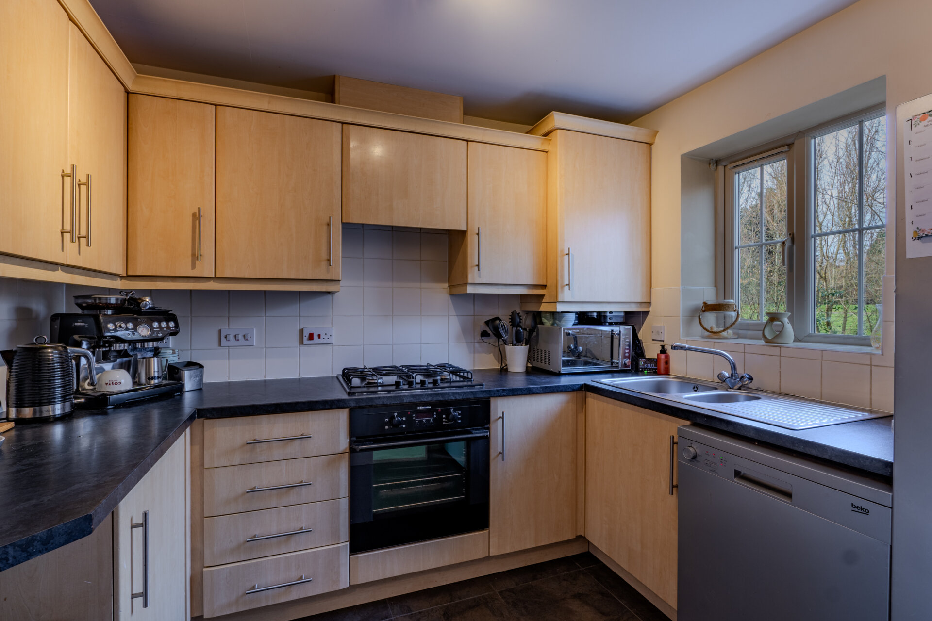 Having tiled flooring, a range of wall and base units with work surface over, part tiled walls, integrated oven and hob with extractor over, stainless steel sink with mixer tap and drainer, window over looking the front aspect, space for white goods and light fitting to ceiling.