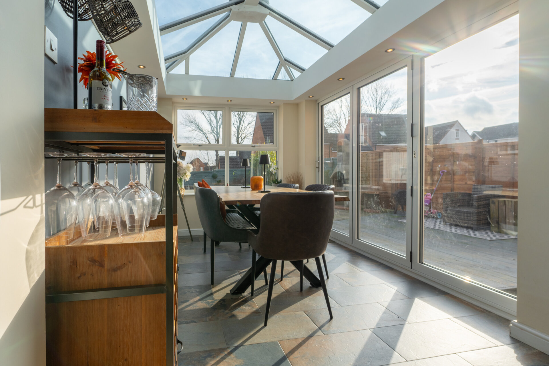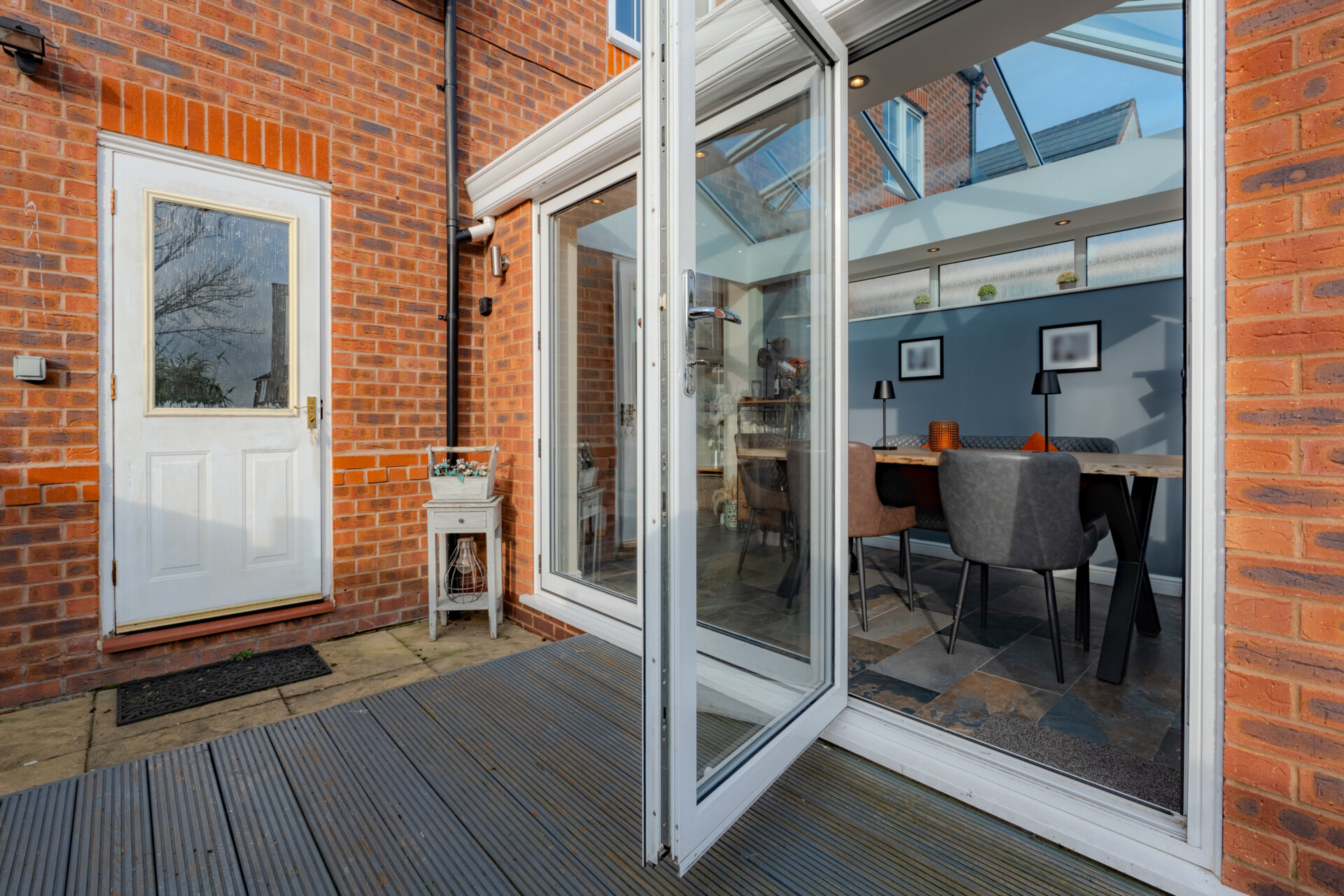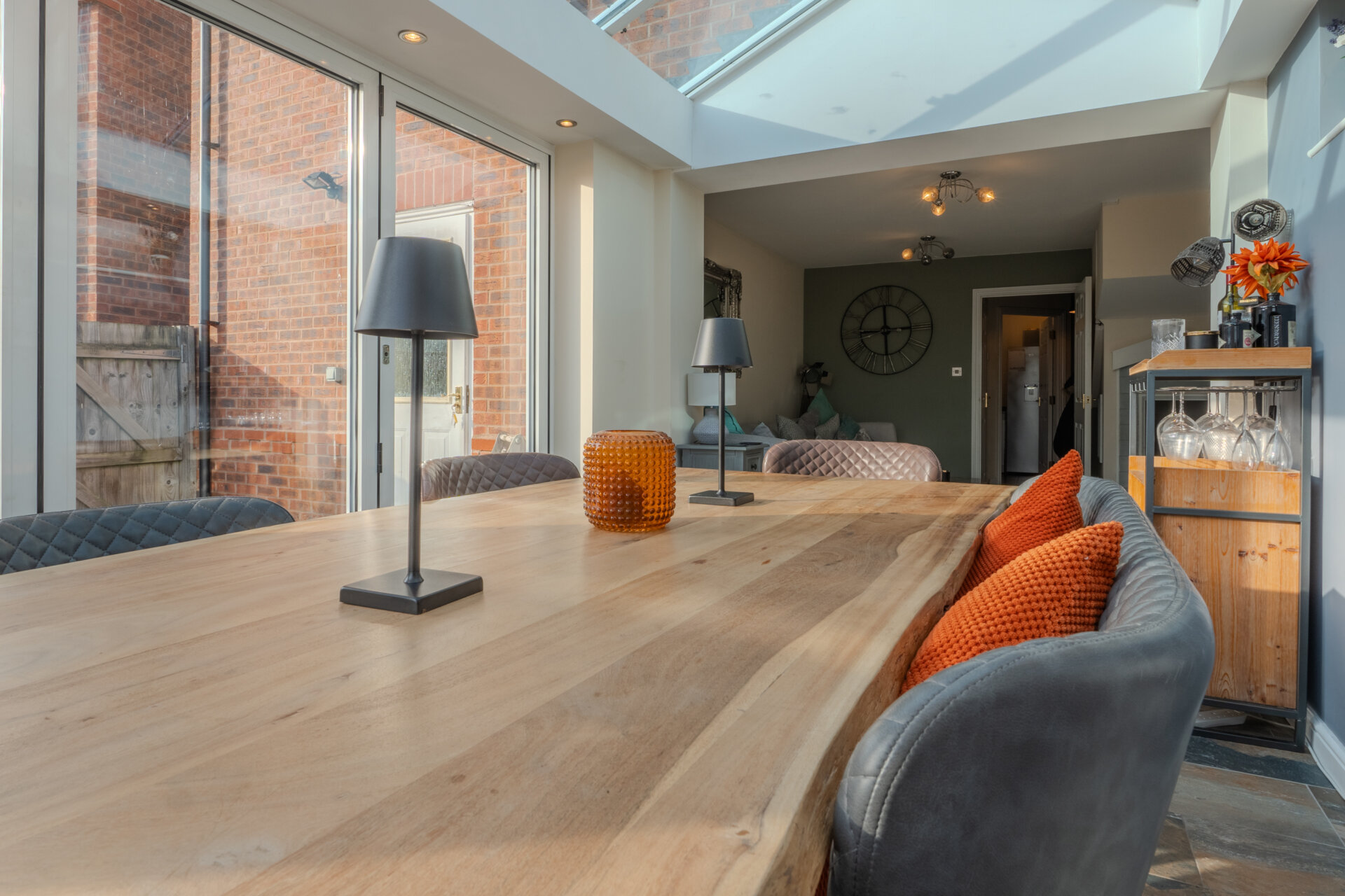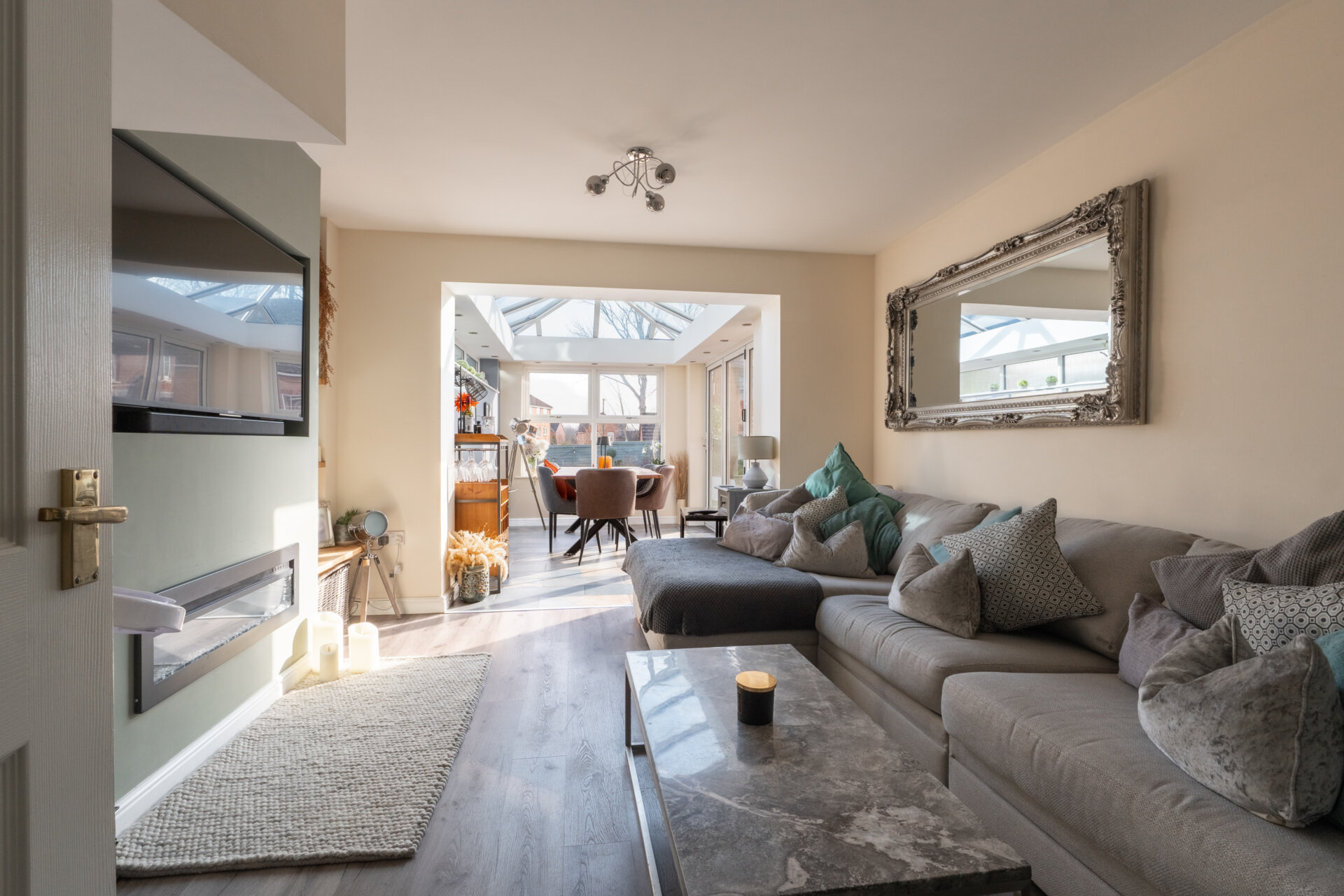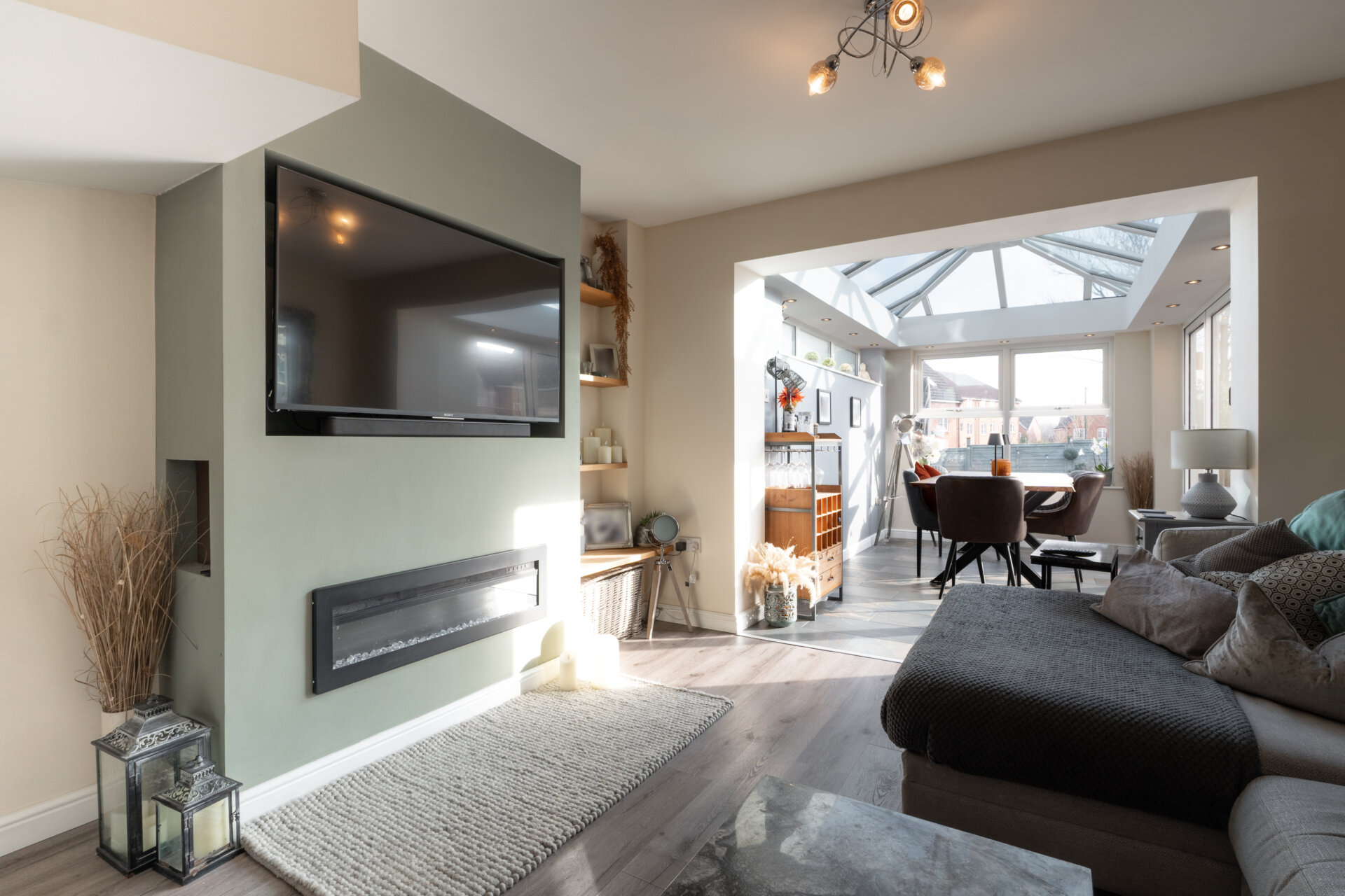 Having laminate flooring, storage, feature media wall, light fitting to the ceiling and to the rear access to the conservatory.
