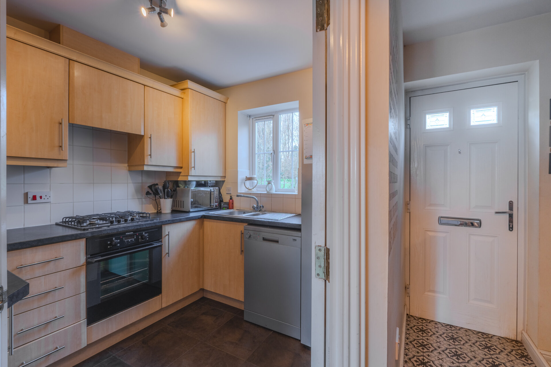 Entranced via a composite front door, tiled flooring, radiator, carpteted stairs to the first floor, light fitting to the ceiling and doors giving access to, kitchen, guest w.c and lounge.