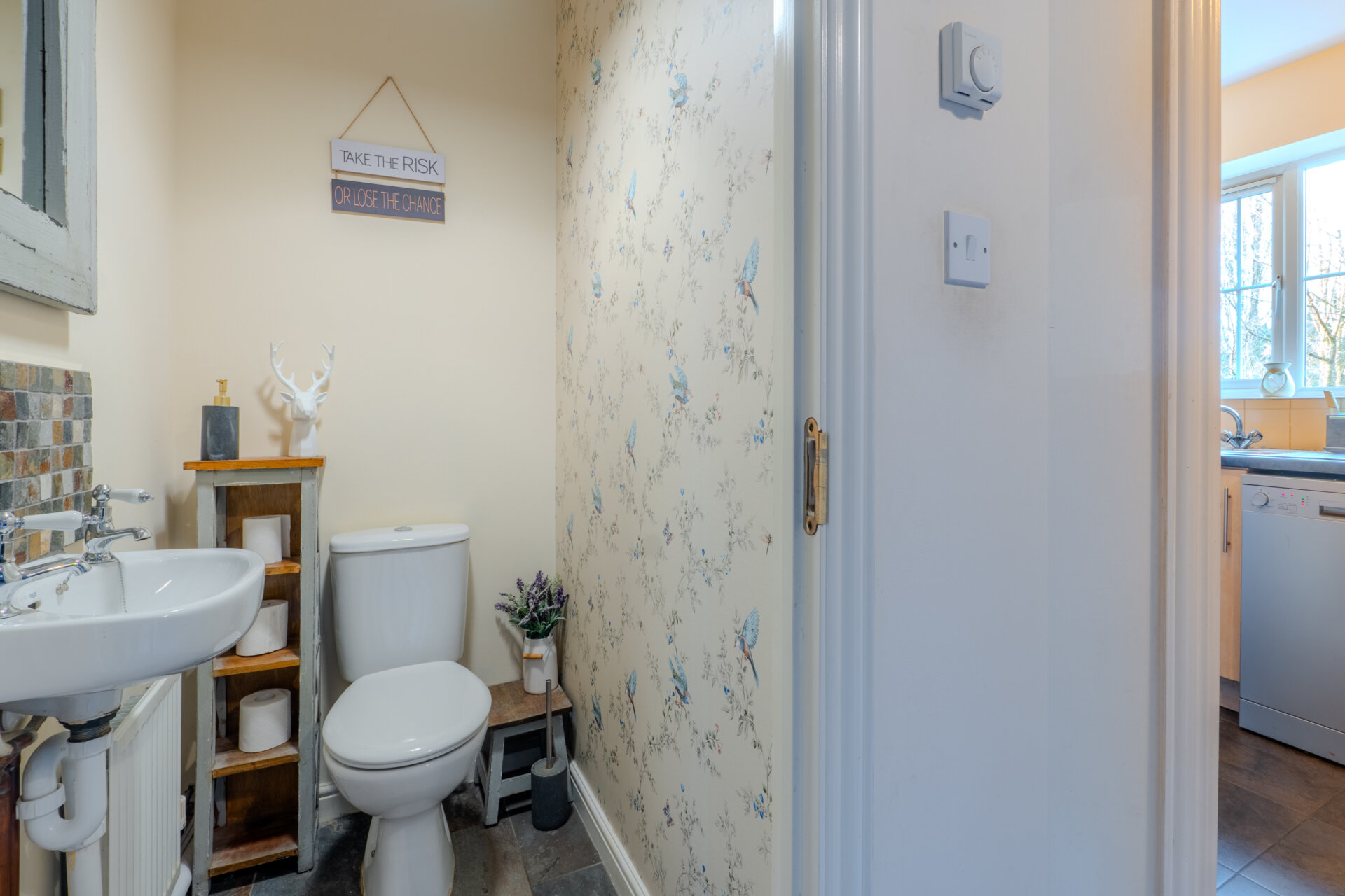 Having tiled flooring, radiator, hand wash basin with tiled splashback, low level flush w.c, light fitting to the ceiling and extractor.