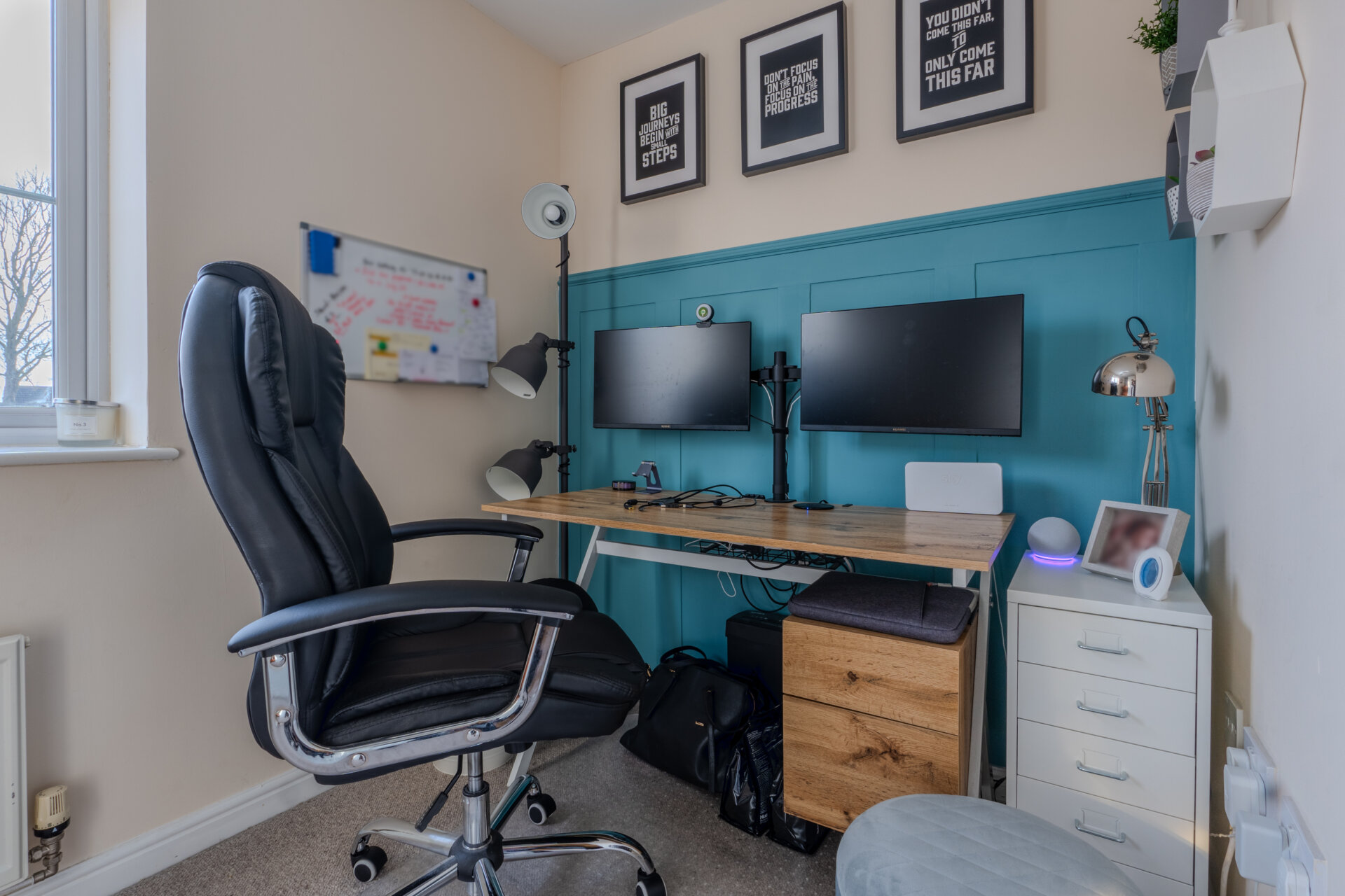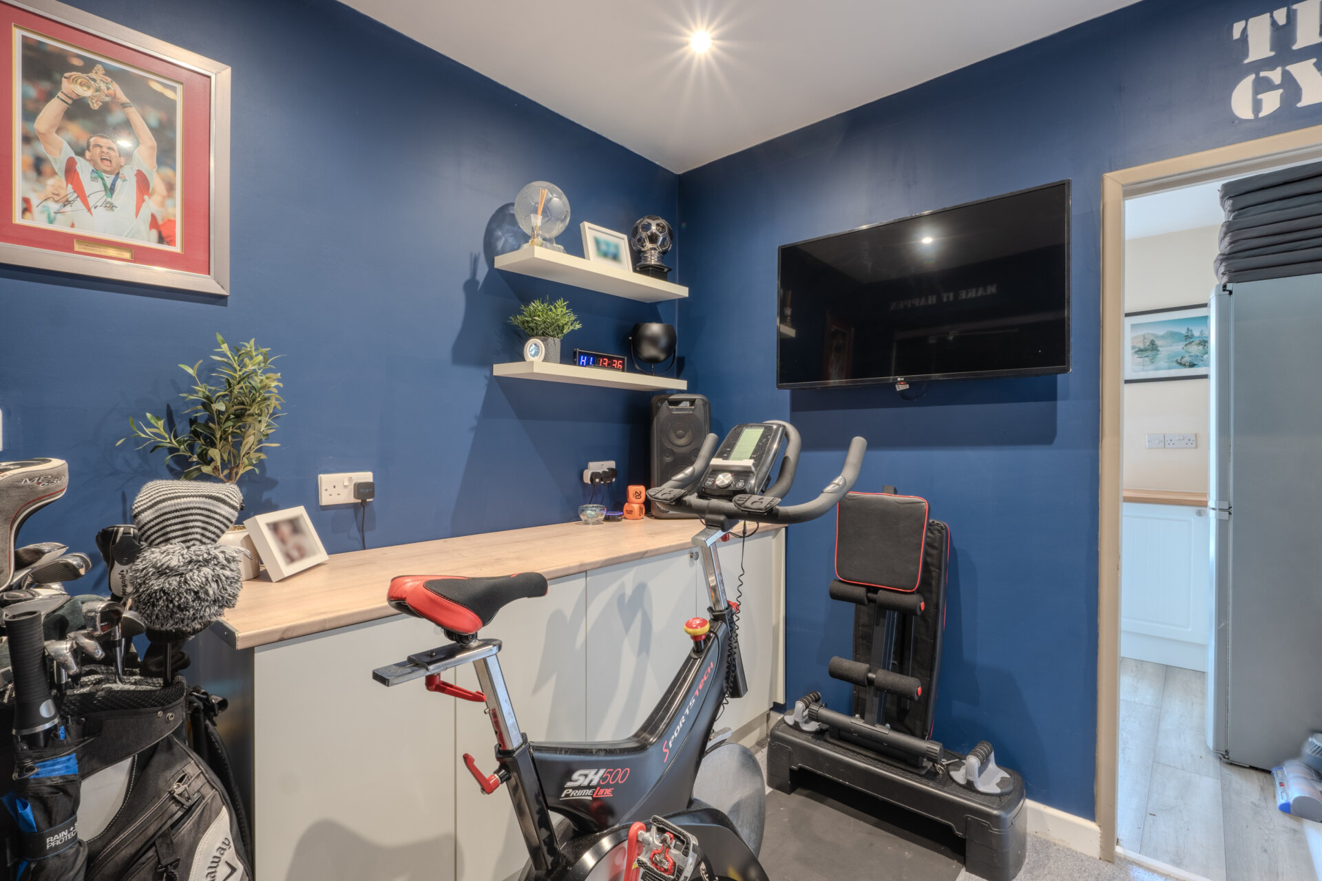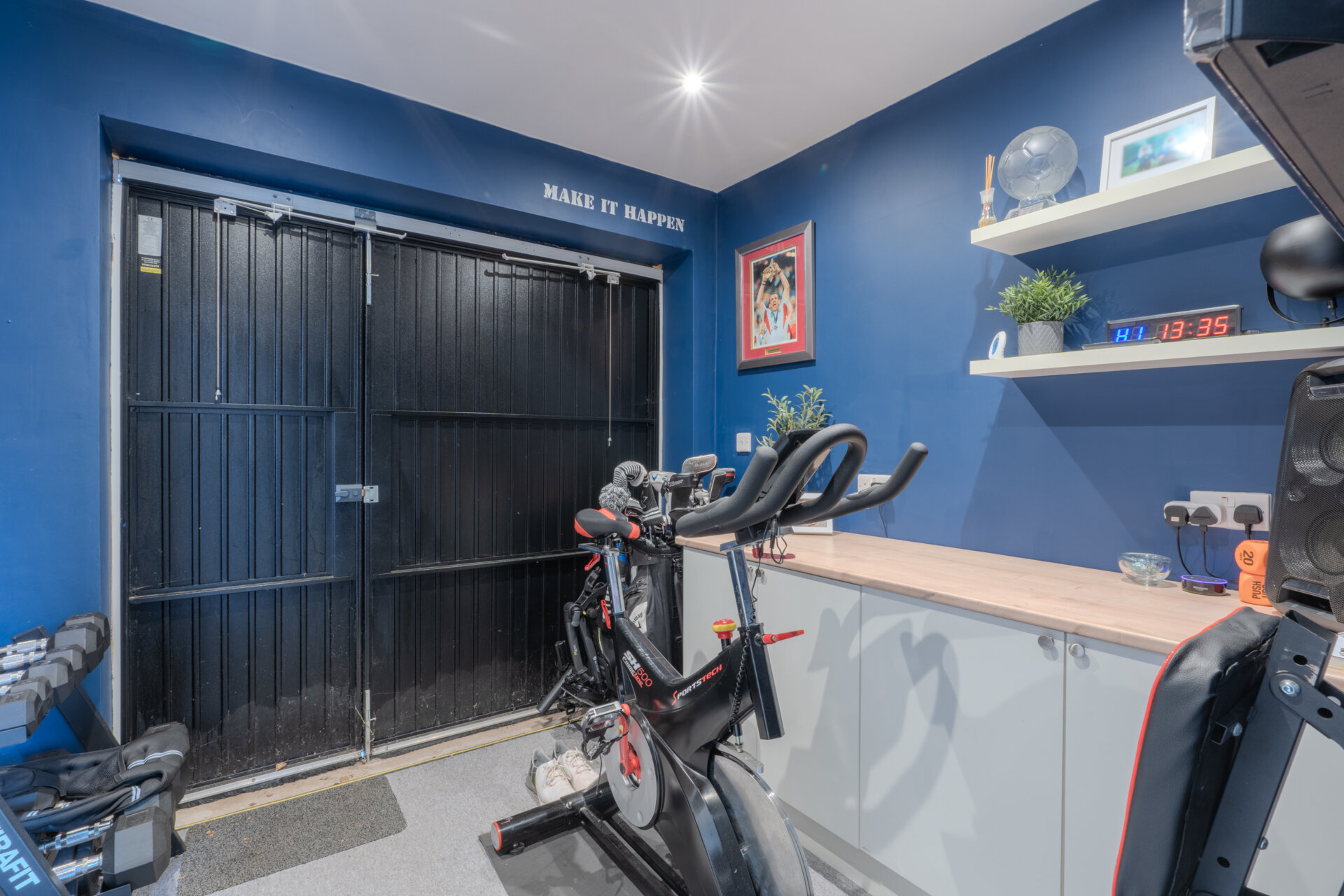 Having been converted in to a useable space, currently used as a gym, but has versatility to adapt to your requirements, having carpeted flooring, part tiled walls, cupboards with work surface over, spotlights to the ceiling, electrical points with up and over door.