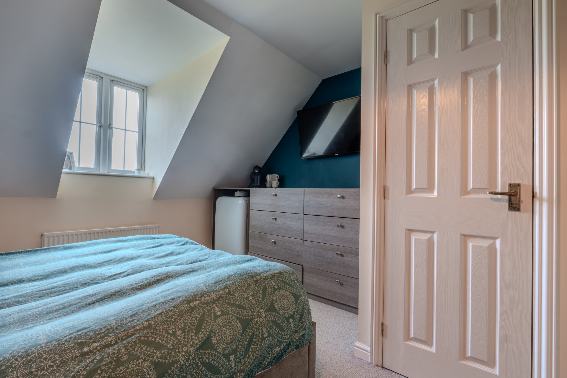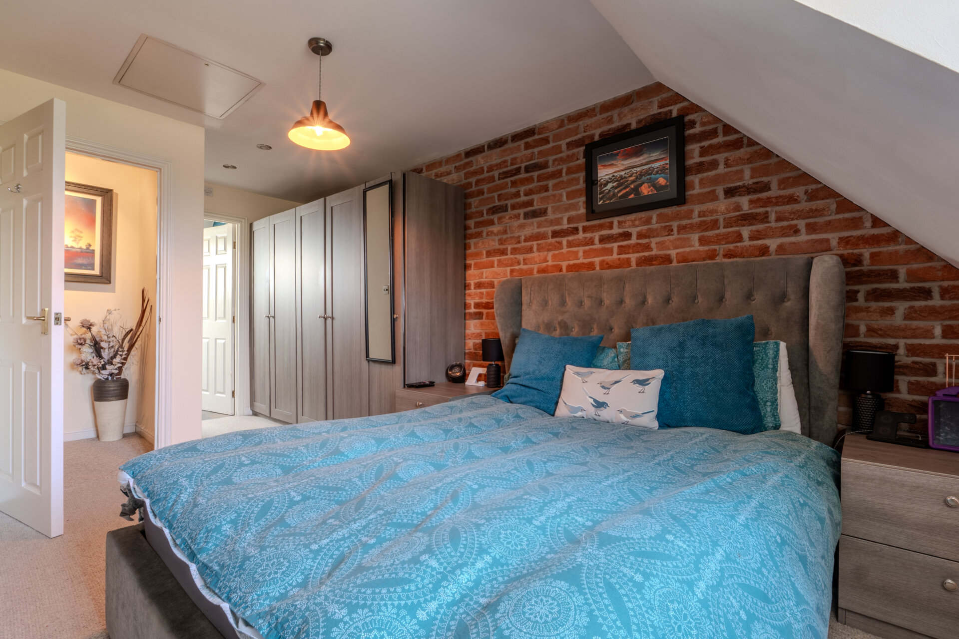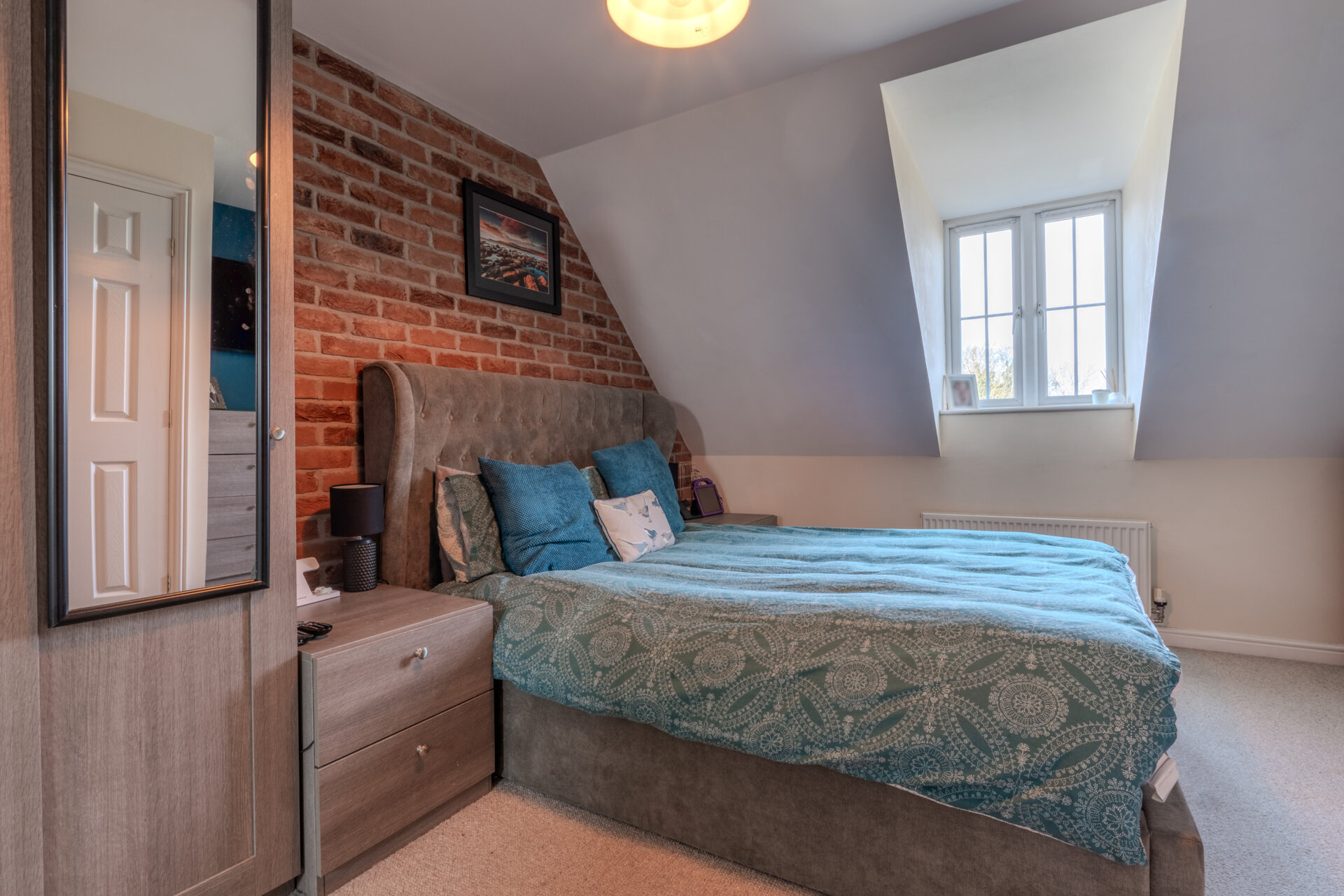 Entranced from a carpeted landing, having carpeted flooring, storage to the side, window to the front elevation, radiator, featured brick wall, loft hatch, light fitting to the ceiling and door giving access to the en-suite.