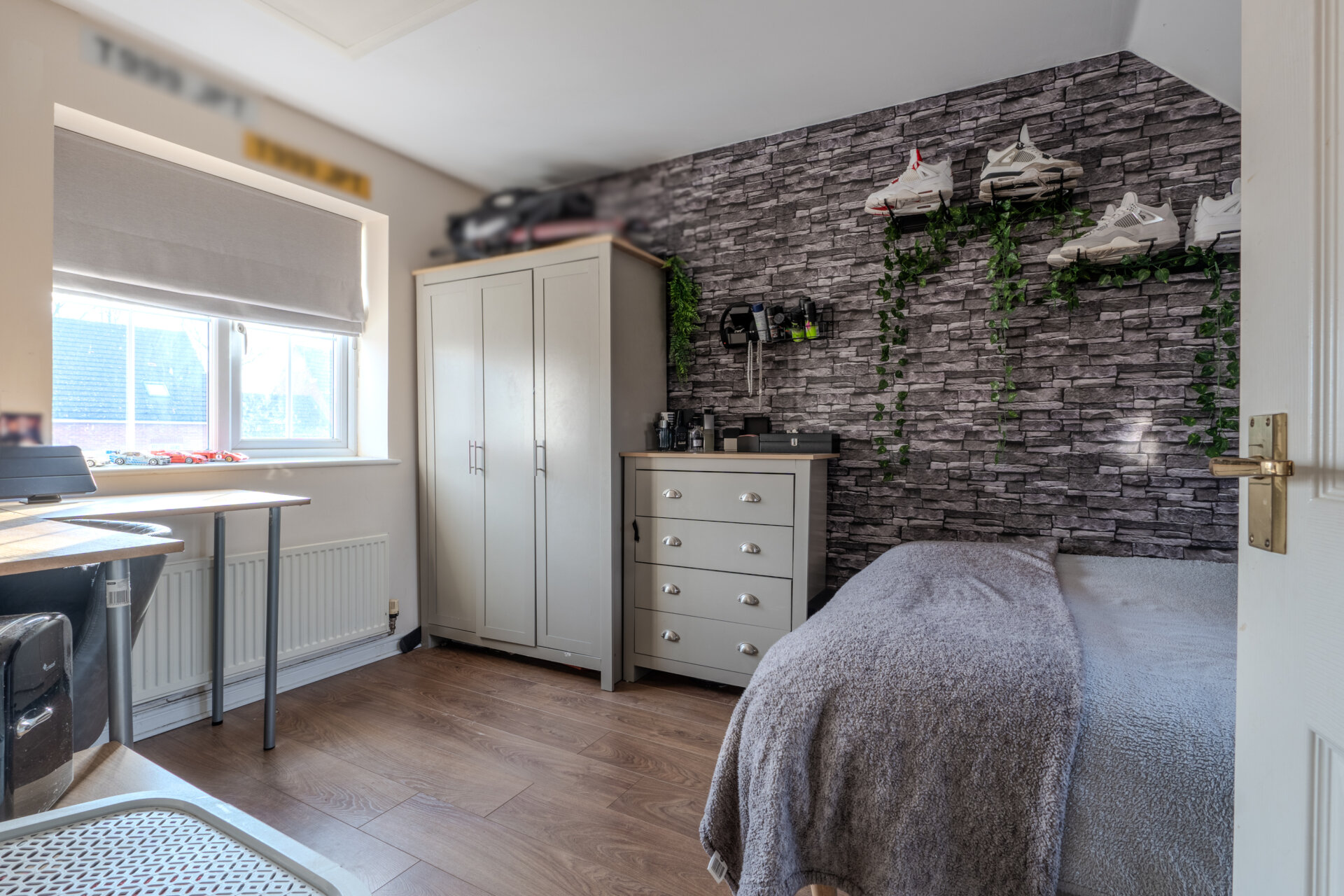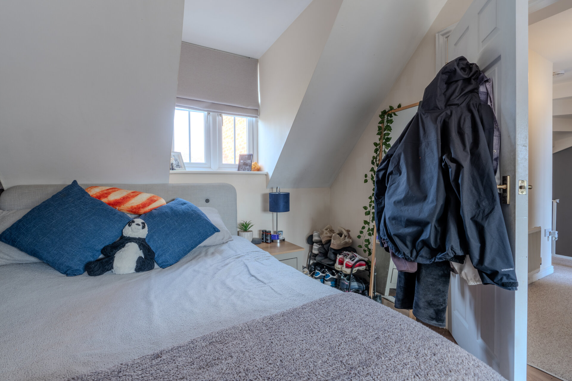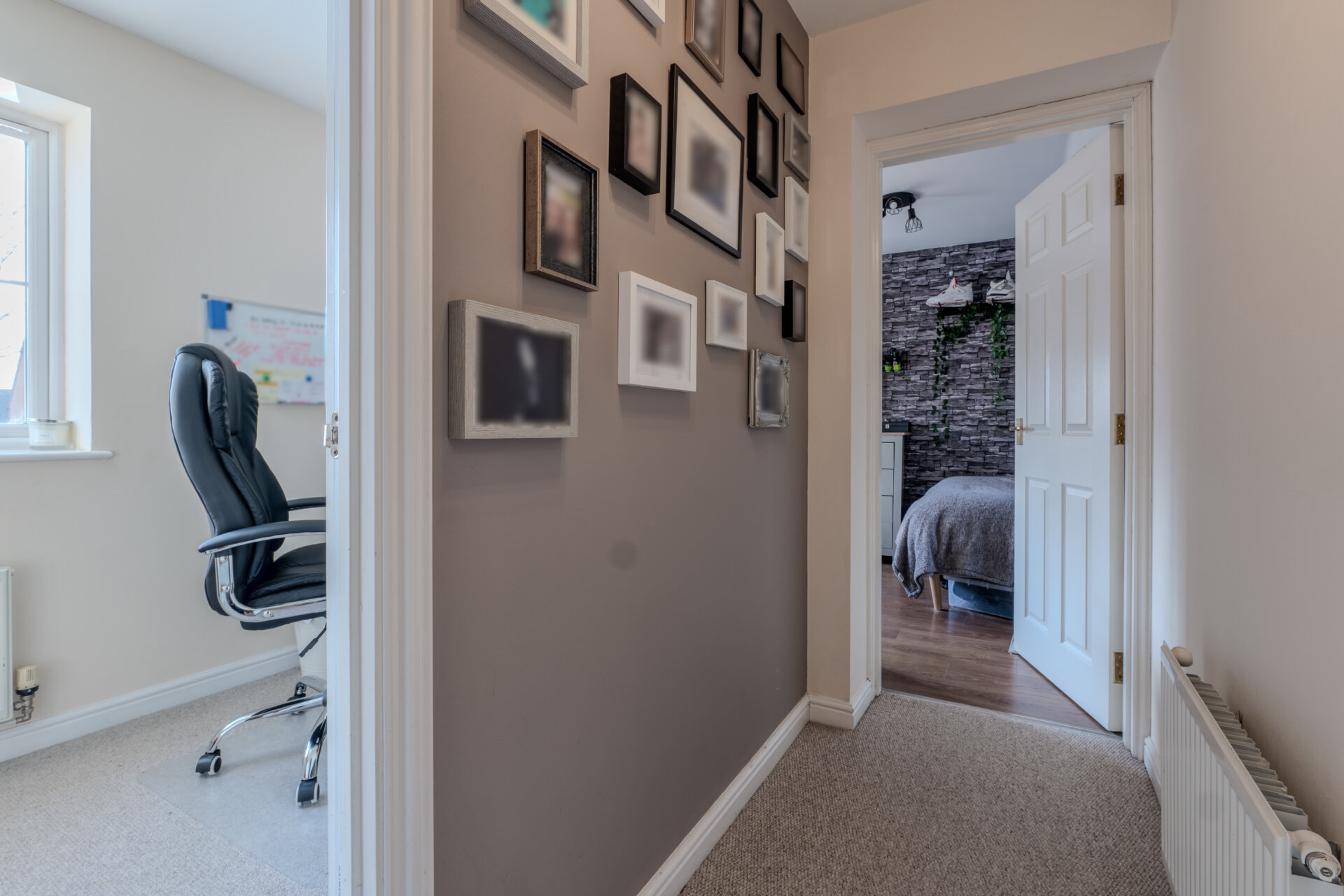 Entranced from a carpeted landing, having carpeted flooring, storage to the side, window to the front elevation, radiator, featured brick wall, loft hatch, light fitting to the ceiling and door giving access to the en-suite.