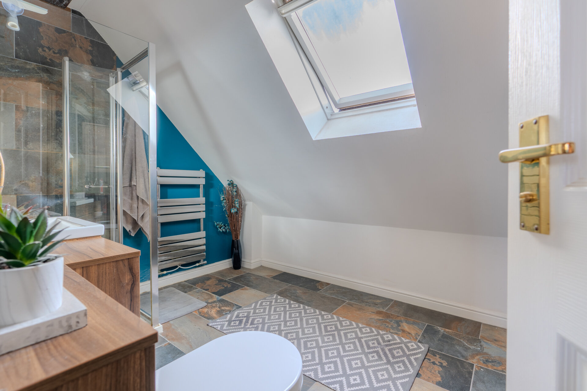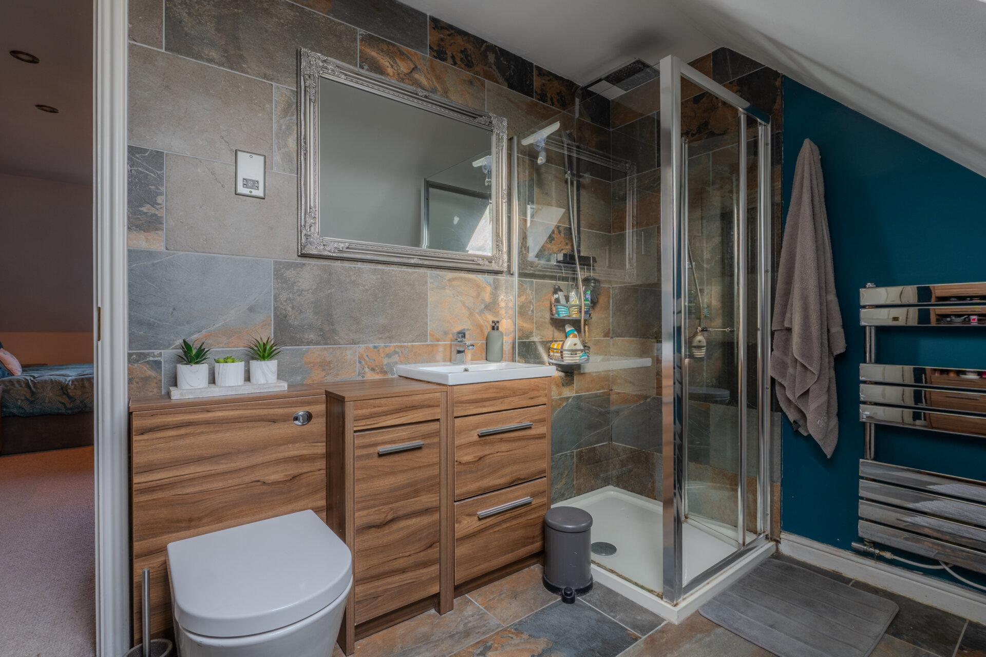 Having tiled flooring, part tiled walls, bathroom suite consisting of low level flush w.c, hand wash basin with mixer tap over vanity unit, shower cubicle with screen, storage cupboard to the side, spotlights to the ceiling, skylight in pitched roof and extractor.
