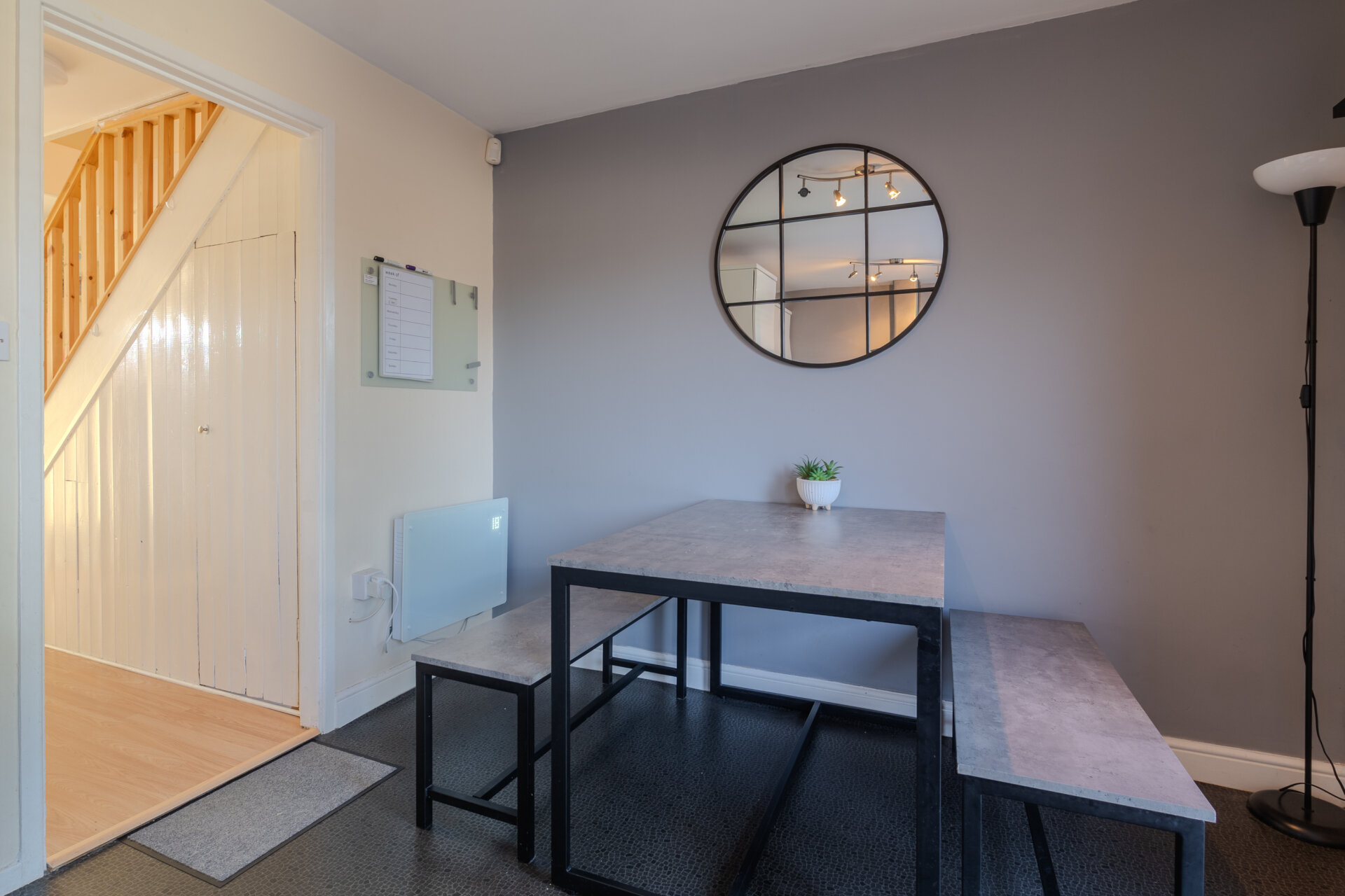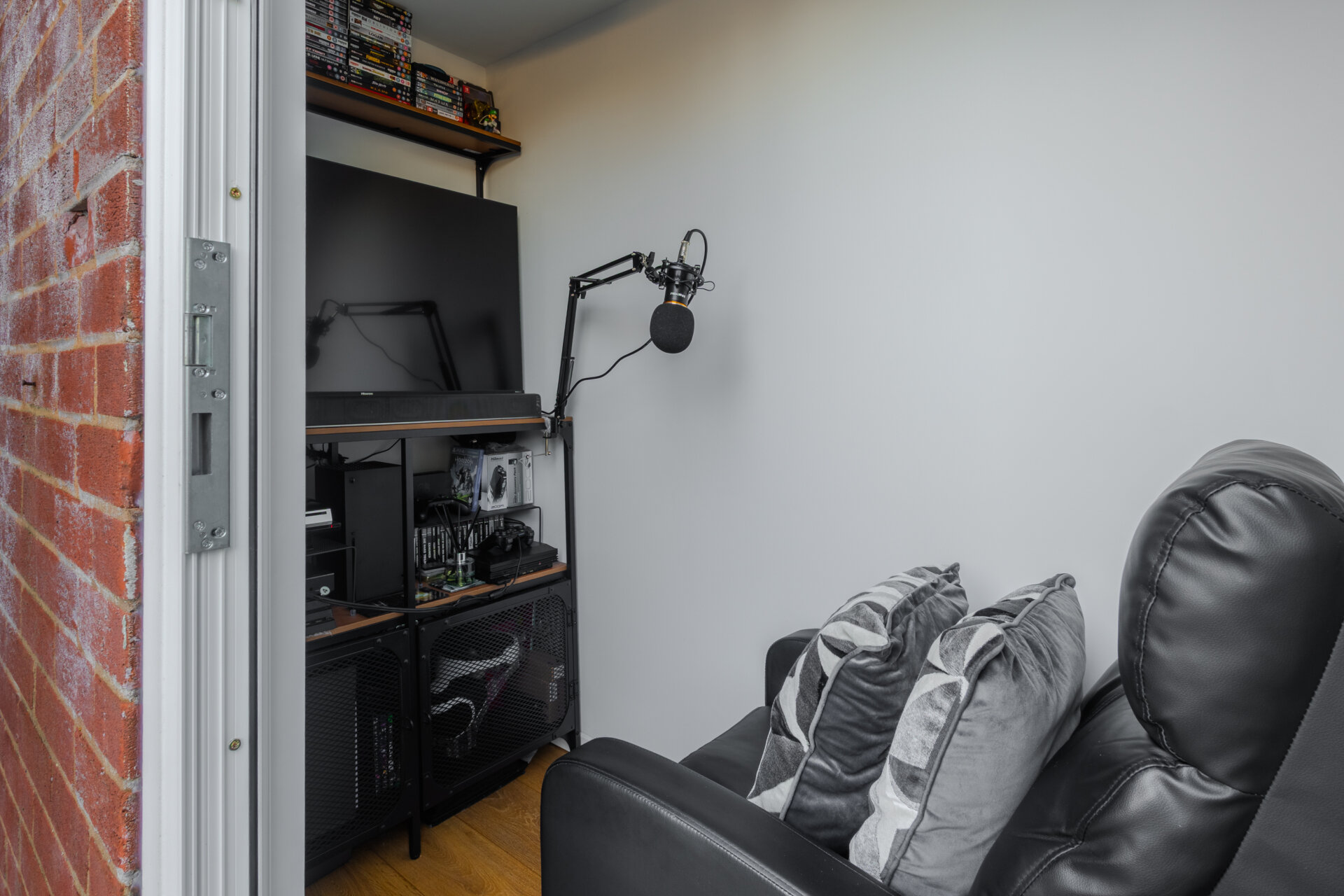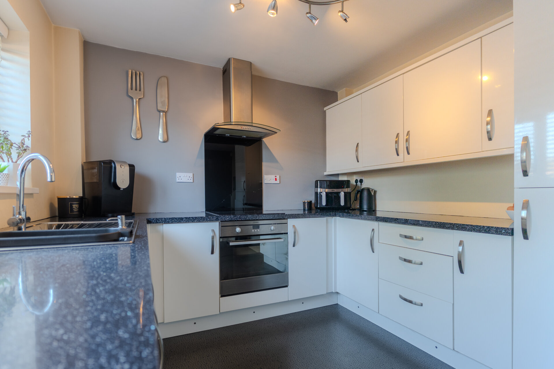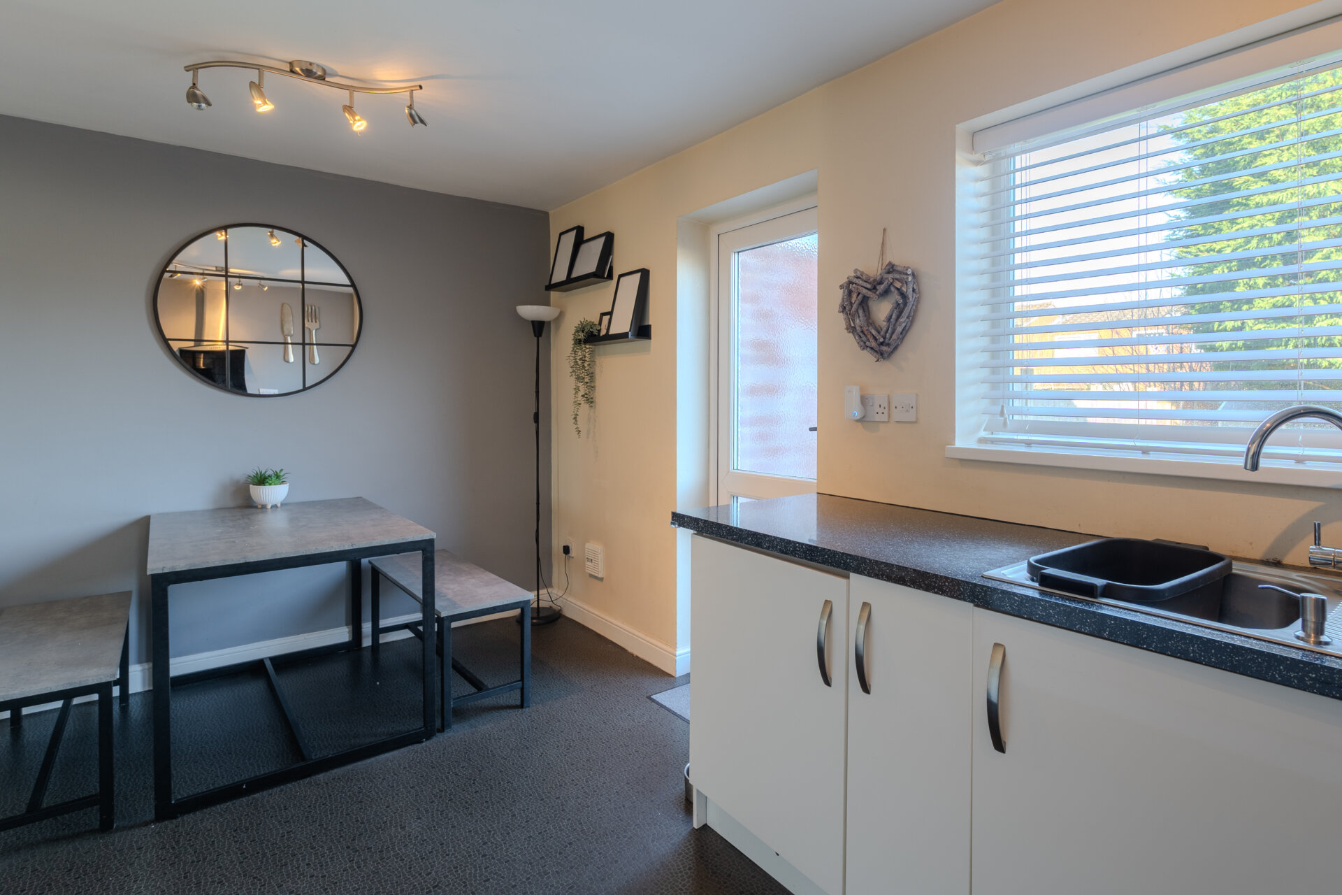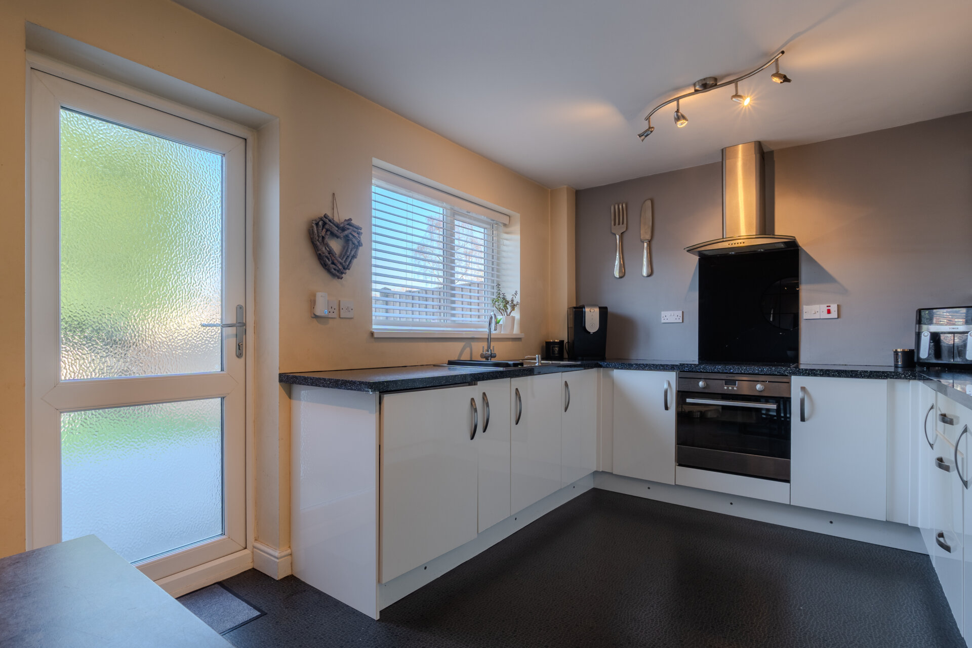 Having vinyl flooring, a range of matching wall and base units with work surface over, integrated washing machine, oven with hob and extractors over and integrated fridge with freezer. Having a stainless steel sink and drainer, window over looking the rear aspect, door to the rear giving access to the garden and the shed which has been converted to a convenient gaming space, and light fitting to the ceiling.