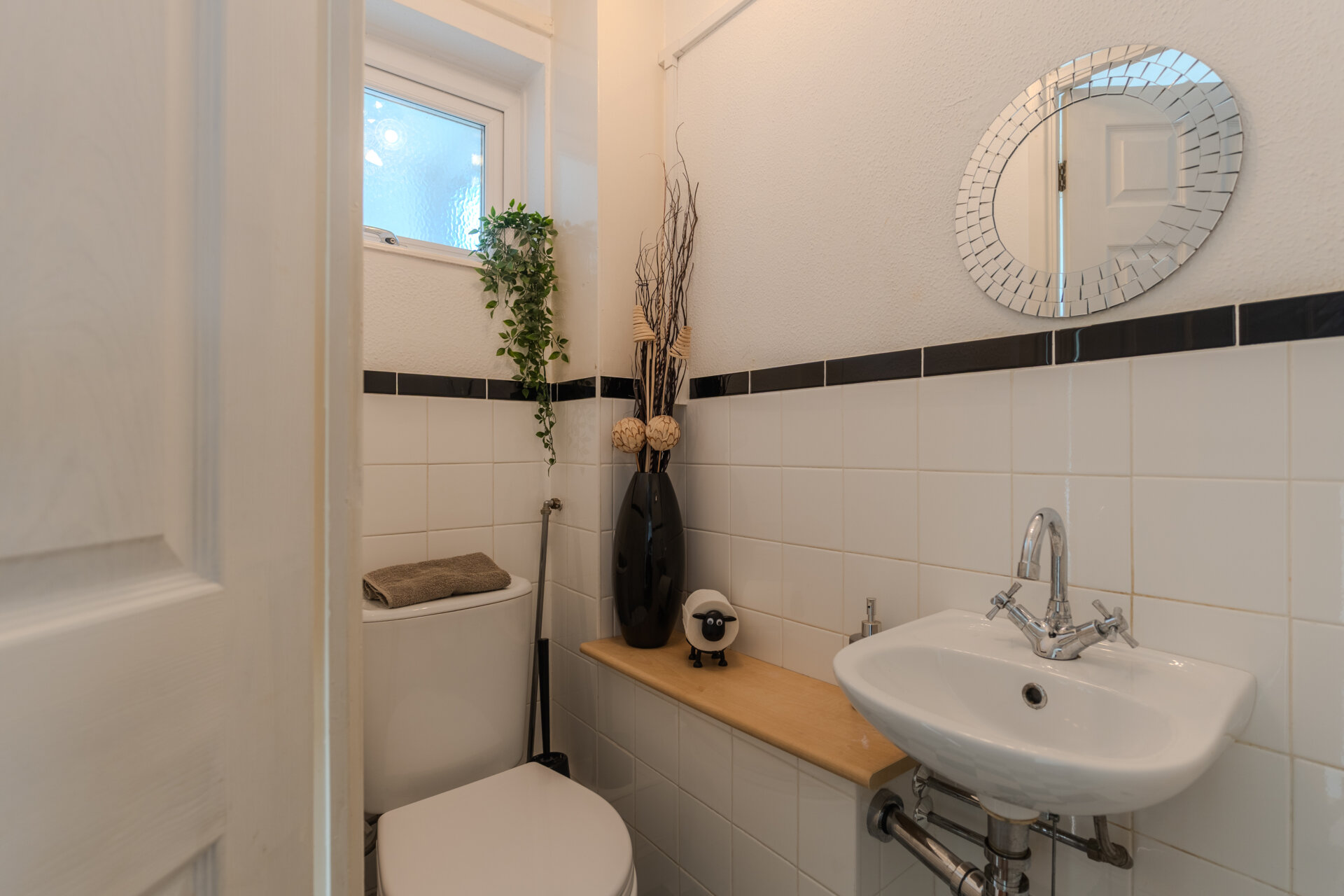 Having vinyl flooring, part tiled walls, opaque window to the front elevation, sink with mixer tap and light fitting to the ceiling.