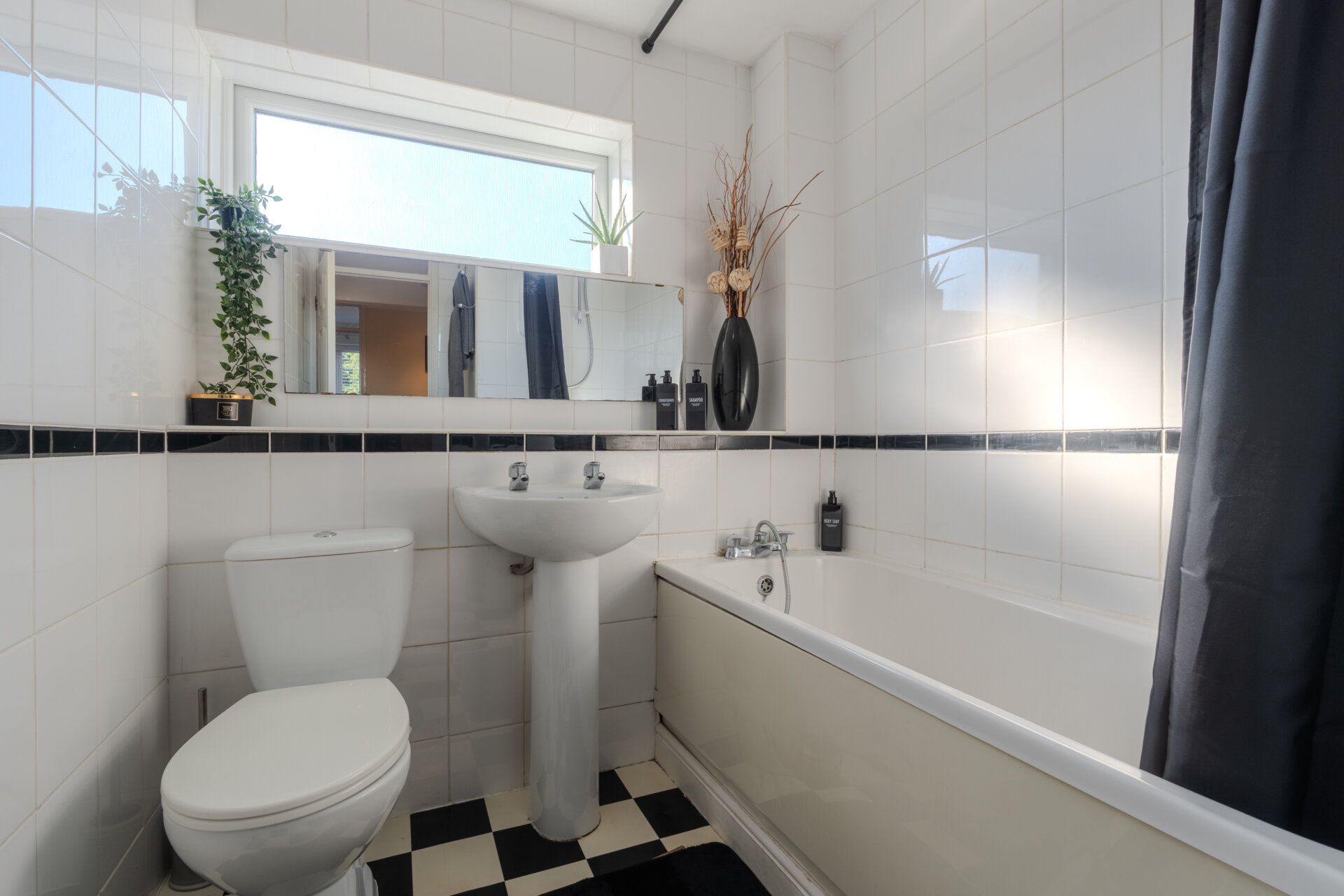 Having vinyl flooring, tiled walls, opaque window to the front elevation, white bathroom suite consisting, low level flush w.c, sink, bath with electric shower over, storage cupboard and light fitting to the ceiling.
