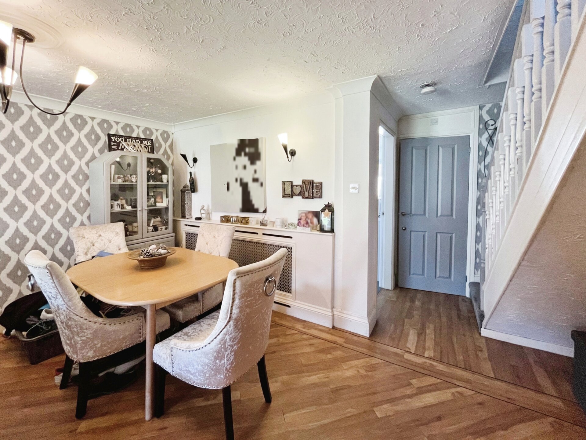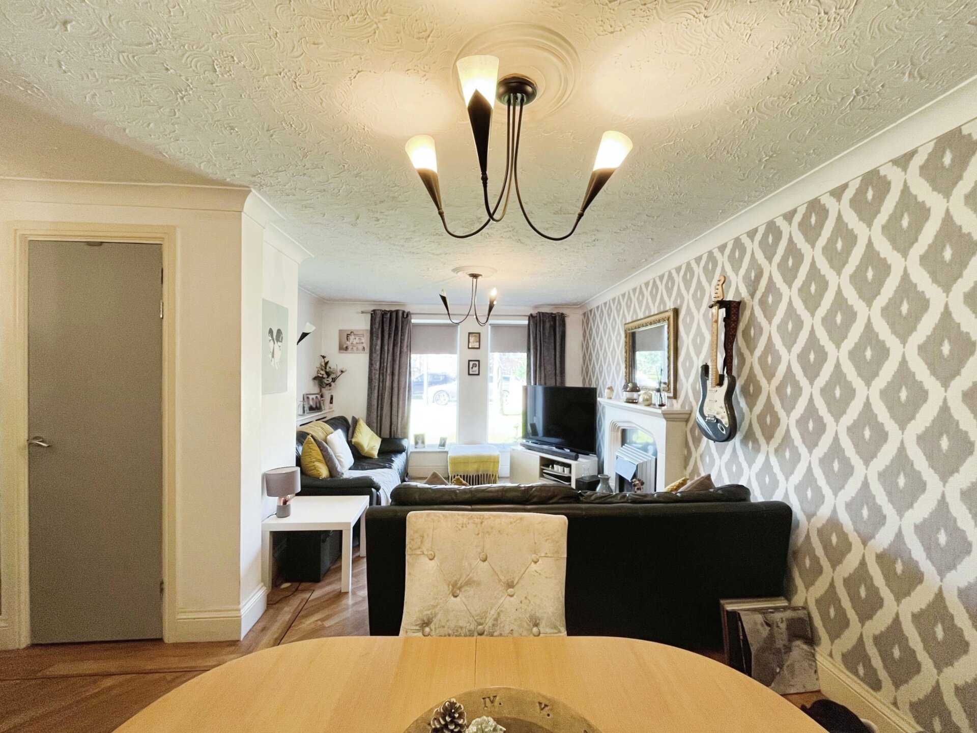 Having an open plan style of living, with Karndean flooring throughout, storage cupboard, carpeted stairs to the first floor, two radiators, windows overlooking the front aspect, electric fire with surround, light fittings to the ceiling, light fittings to the walls, access to the shower room and door giving access to the kitchen.