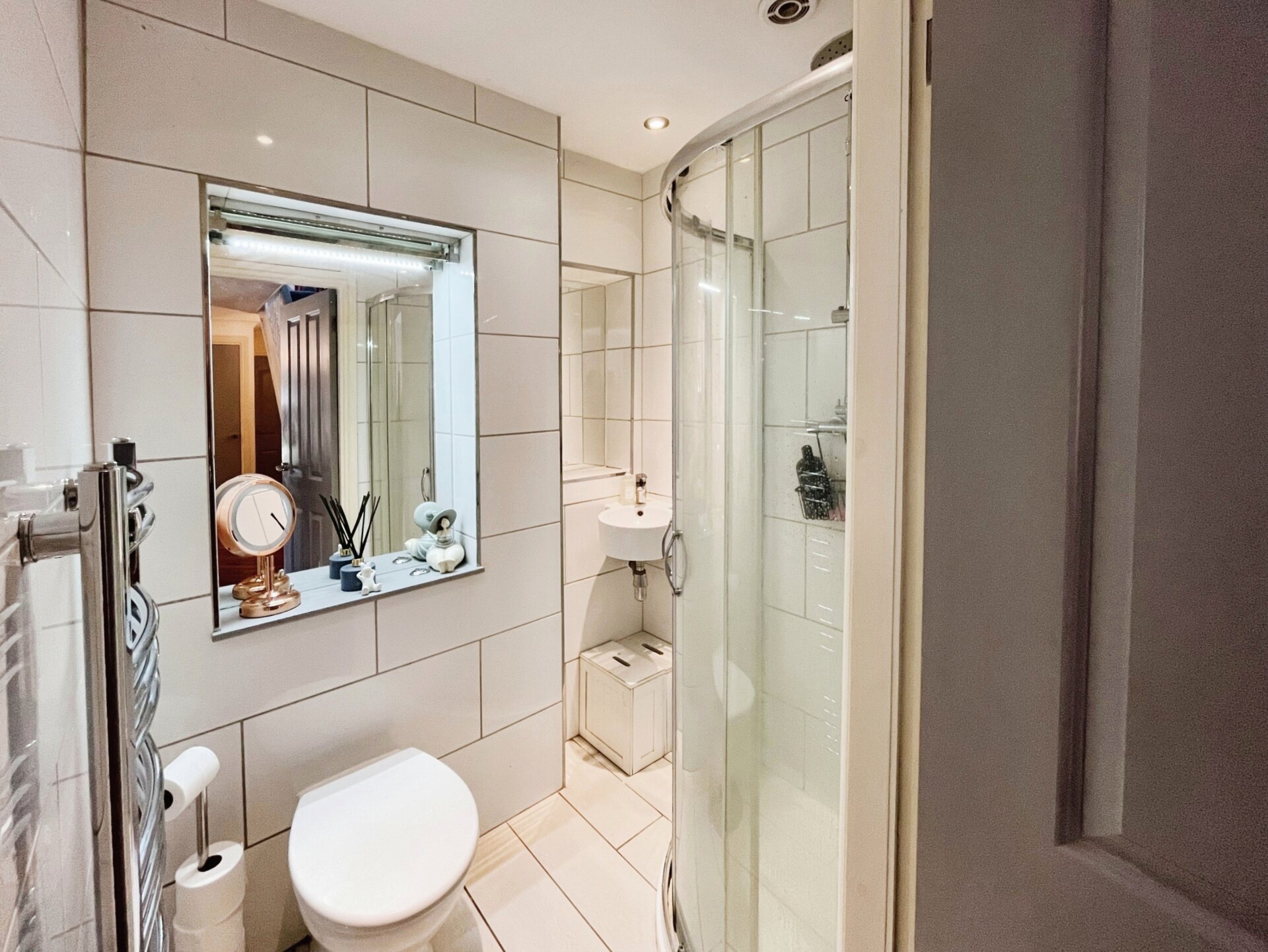 Having tiled flooring, tiled walls, heated ladder style towel rail, low level flush w.c, hand wash basin with mixer tap, corner shower cubicle with screen, extractor and spotlights to the ceiling.