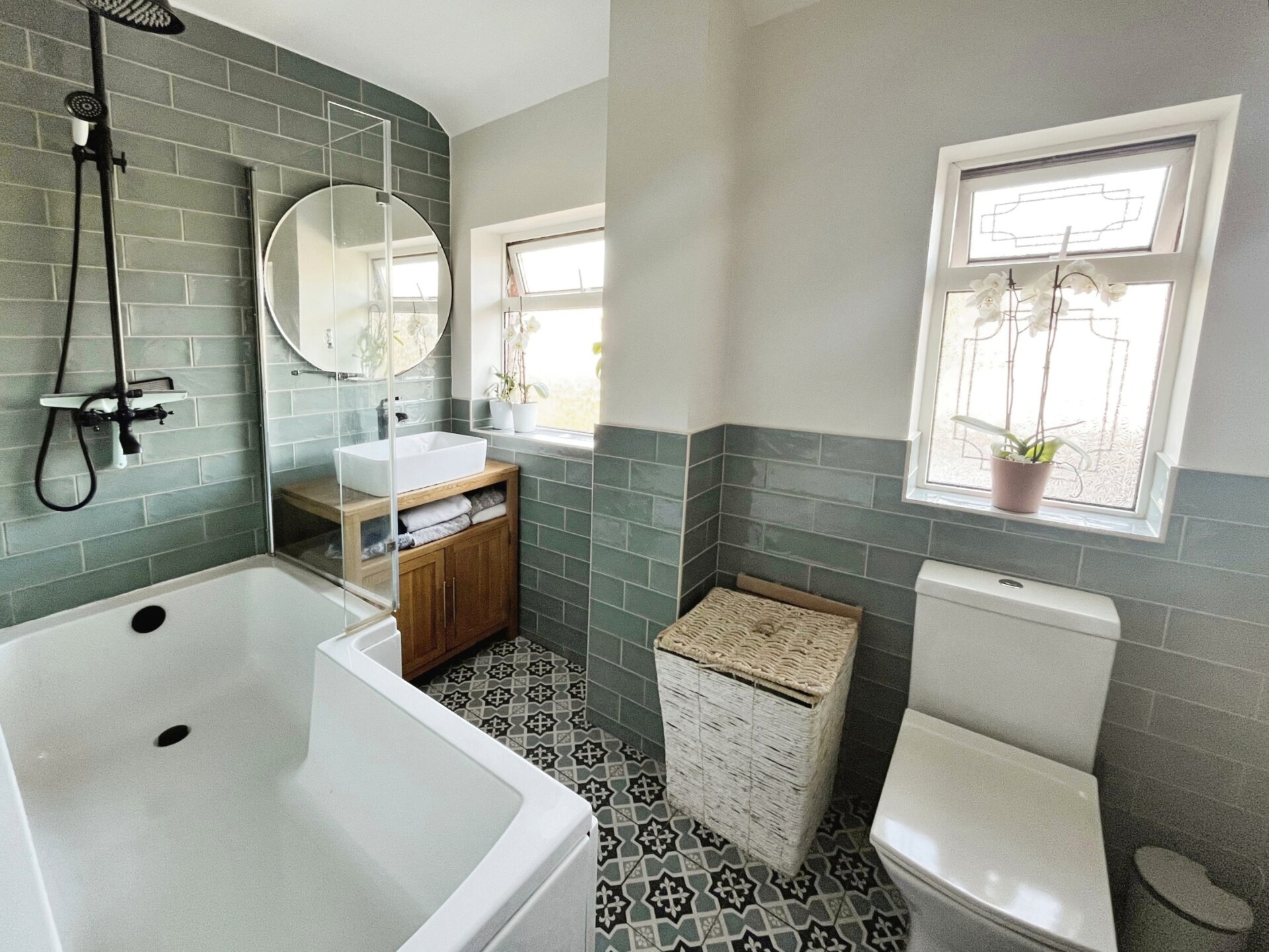 Having tiled flooring and tiled walls, obscured windows to the rear elevation, low level w.c, sink with mixer tap over storage, bath with shower over and screen, heated ladder style towel rail and spotlights to the ceiling.