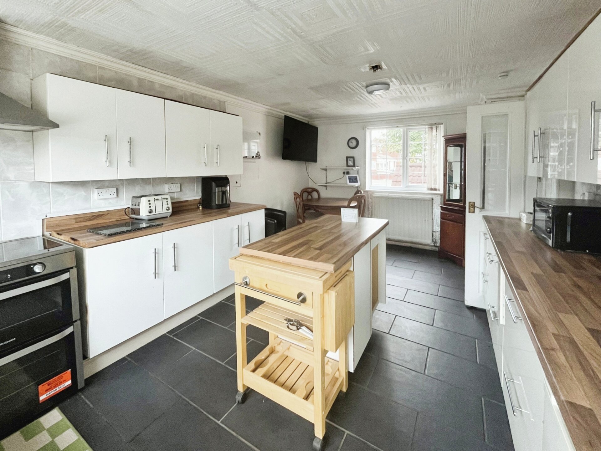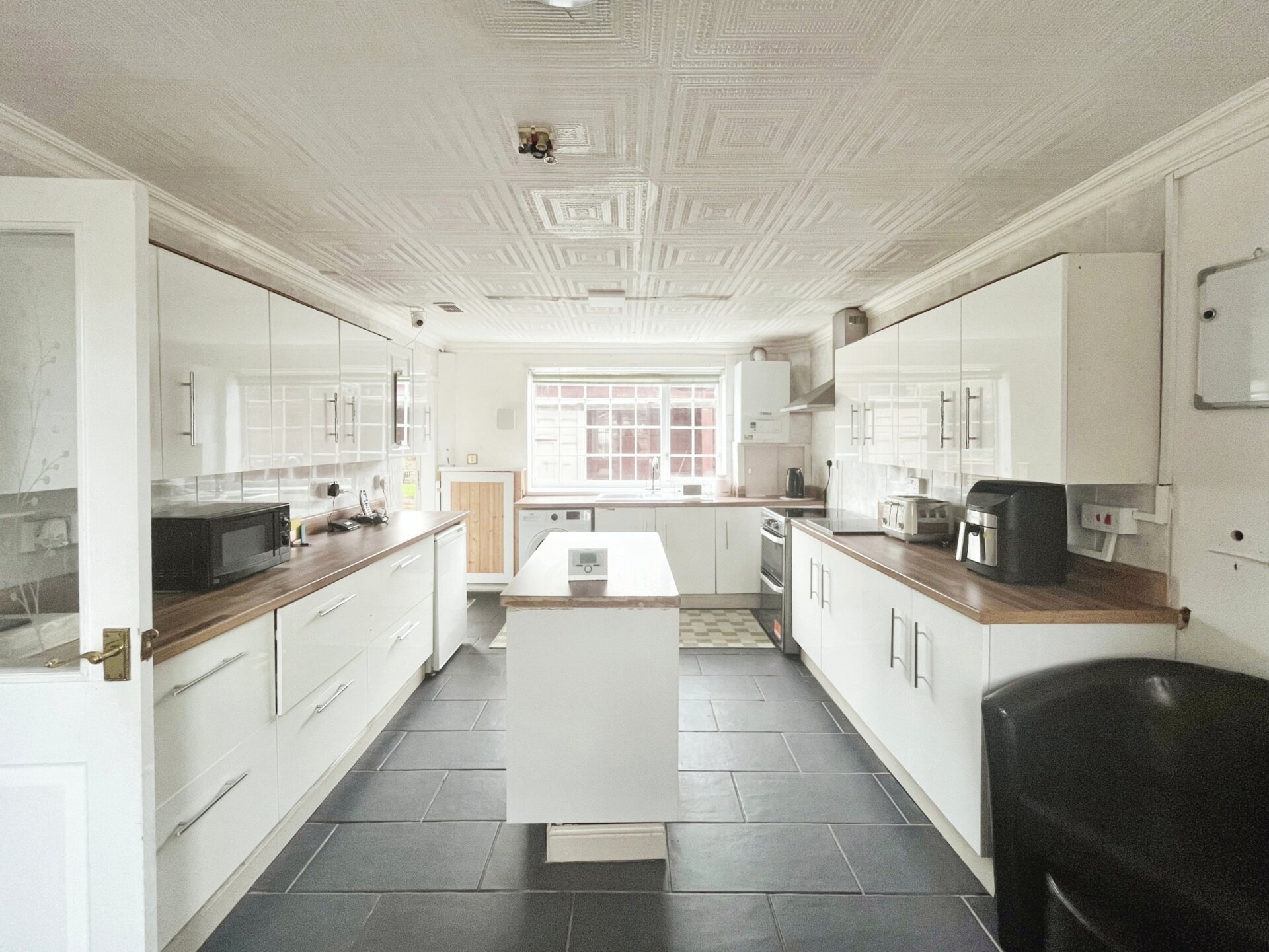 Spacious kitchen, having tiled flooring, a range of matching wall and base units with work surface over, space for white goods, sink and drainer with mixer, radiator, window over looking the front aspect, window over looking the rear aspect, light fittings to the ceiling and doorway giving access to under the stair storage and access to the garden.